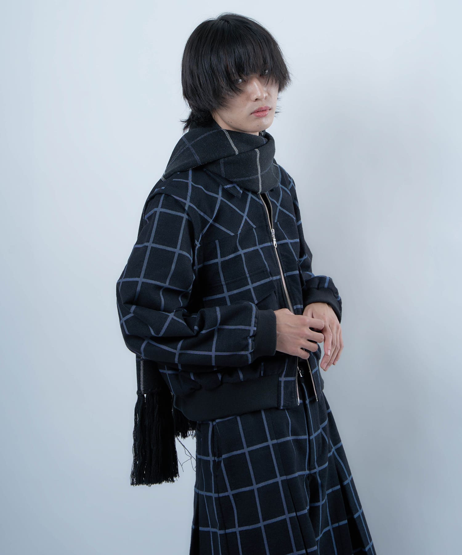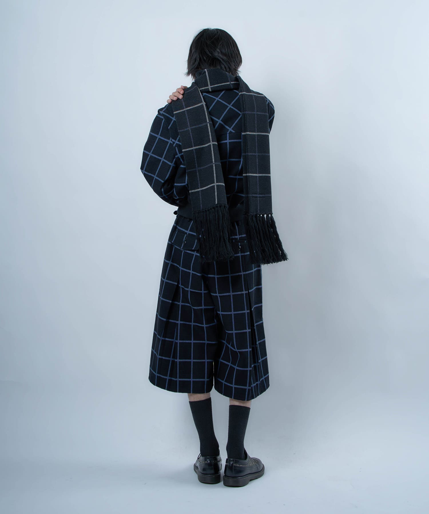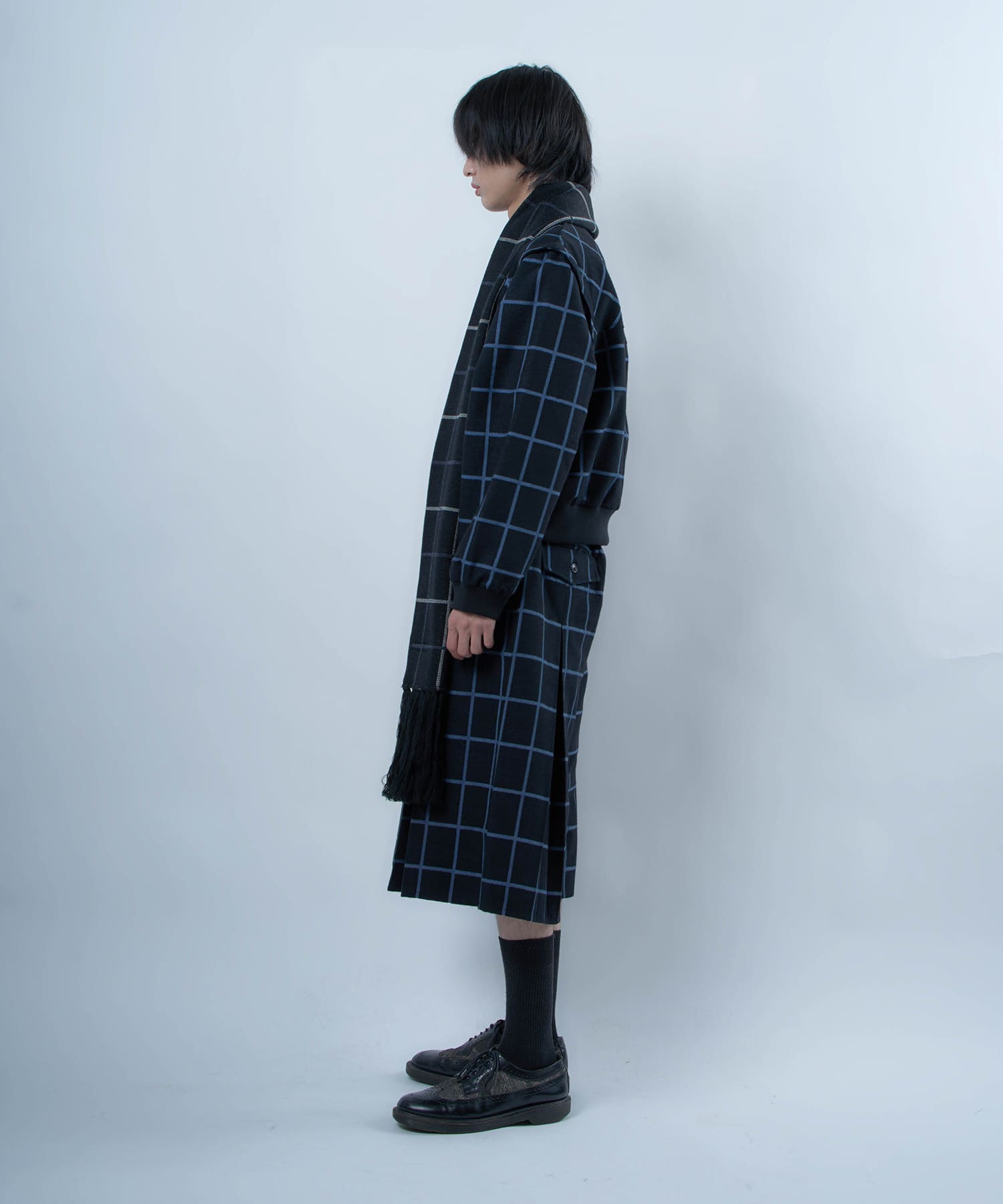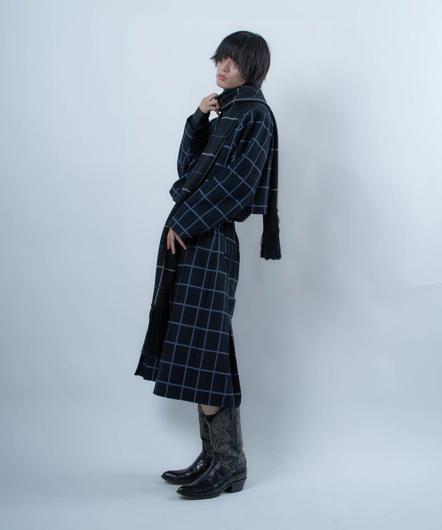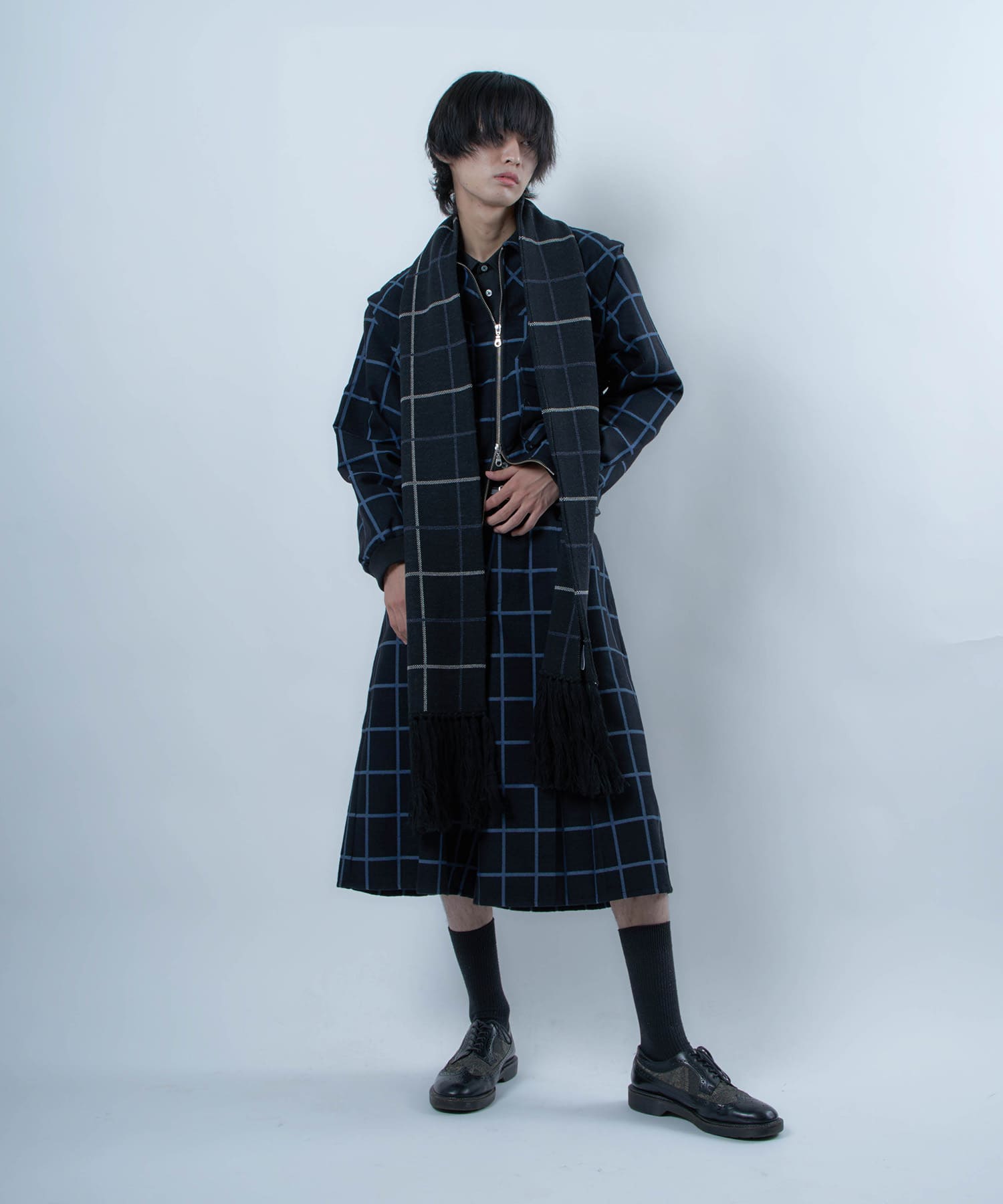 別注生地を使用したブループレイドロングマフラー。