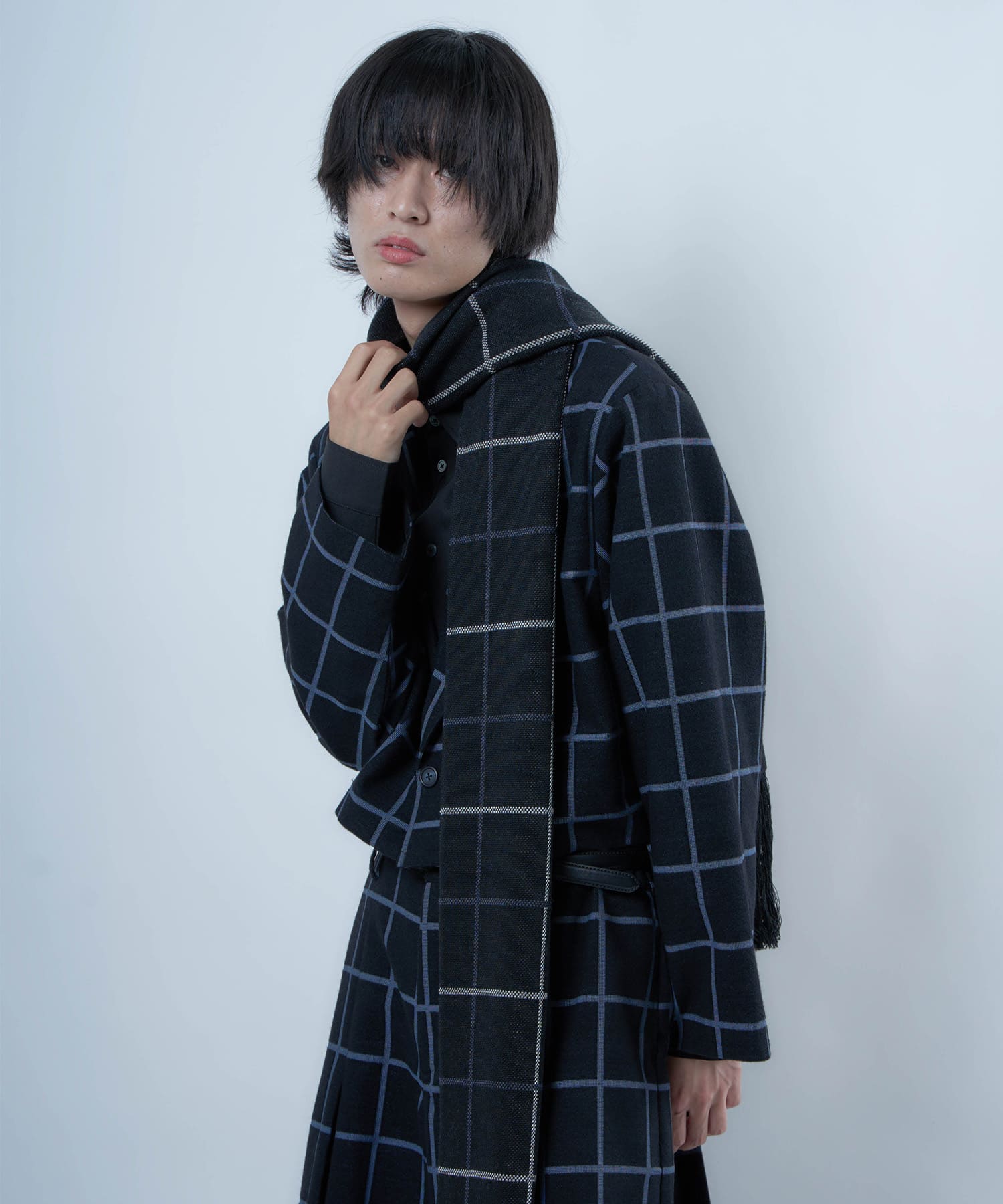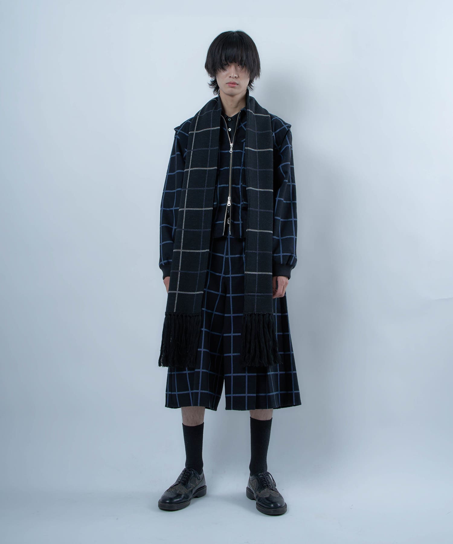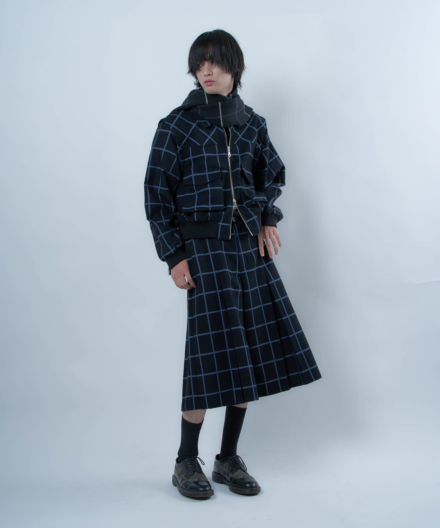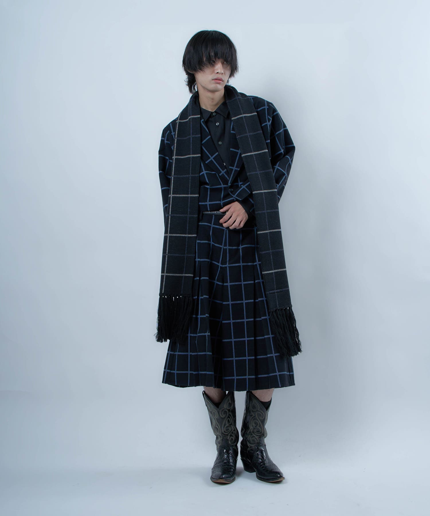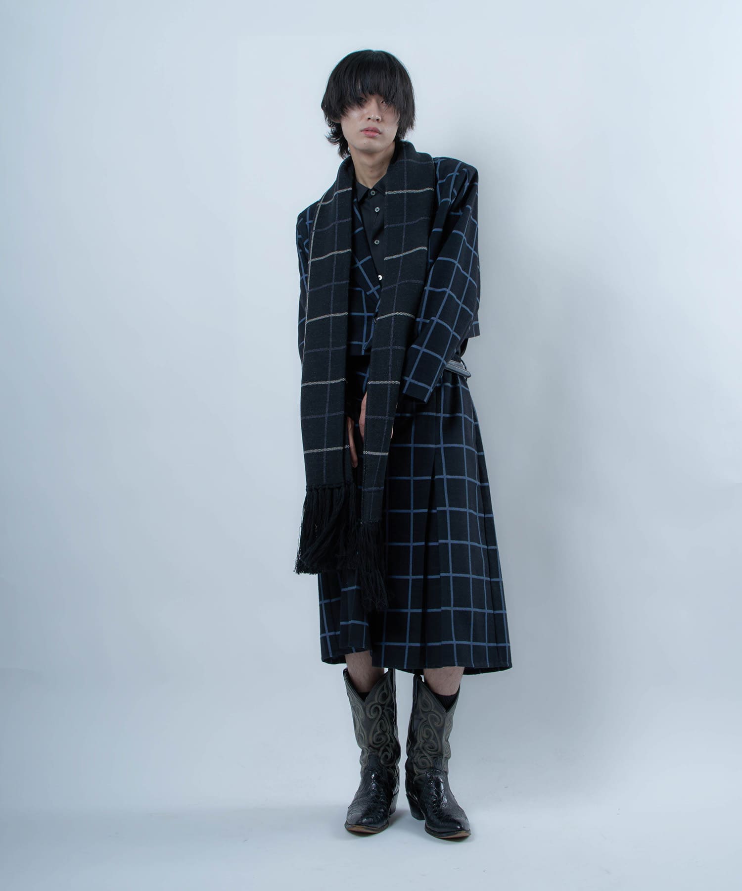 別注生地を使用したブループレイドロングマフラー。