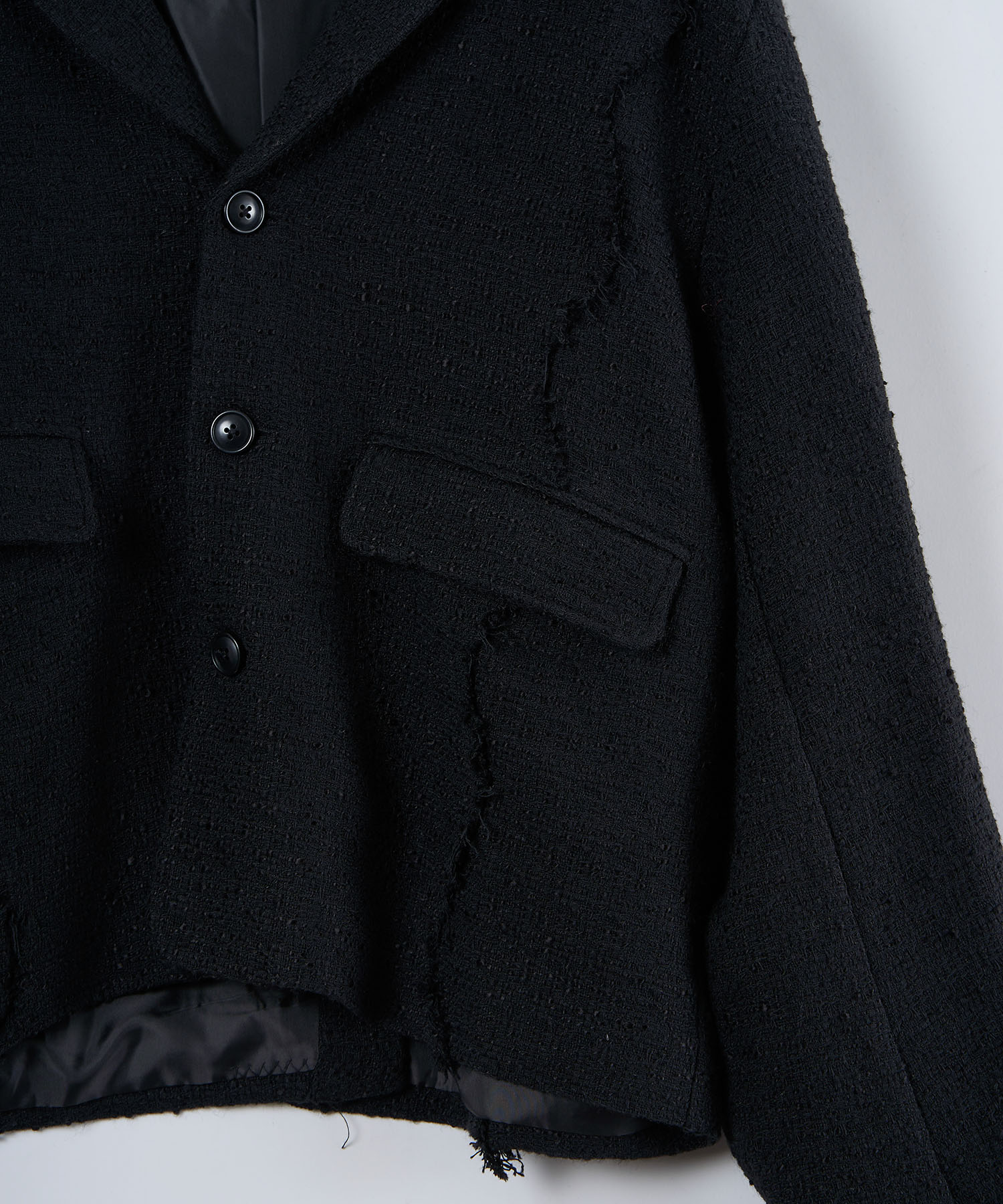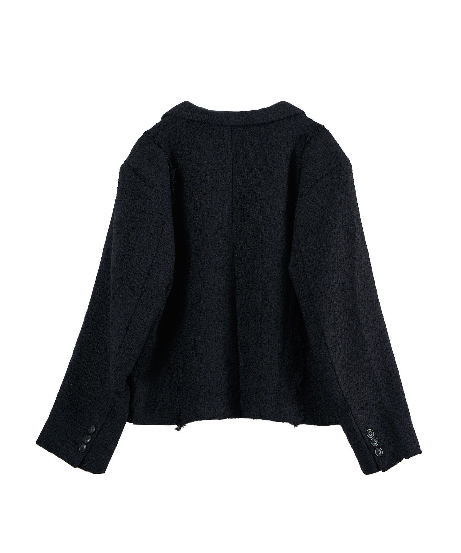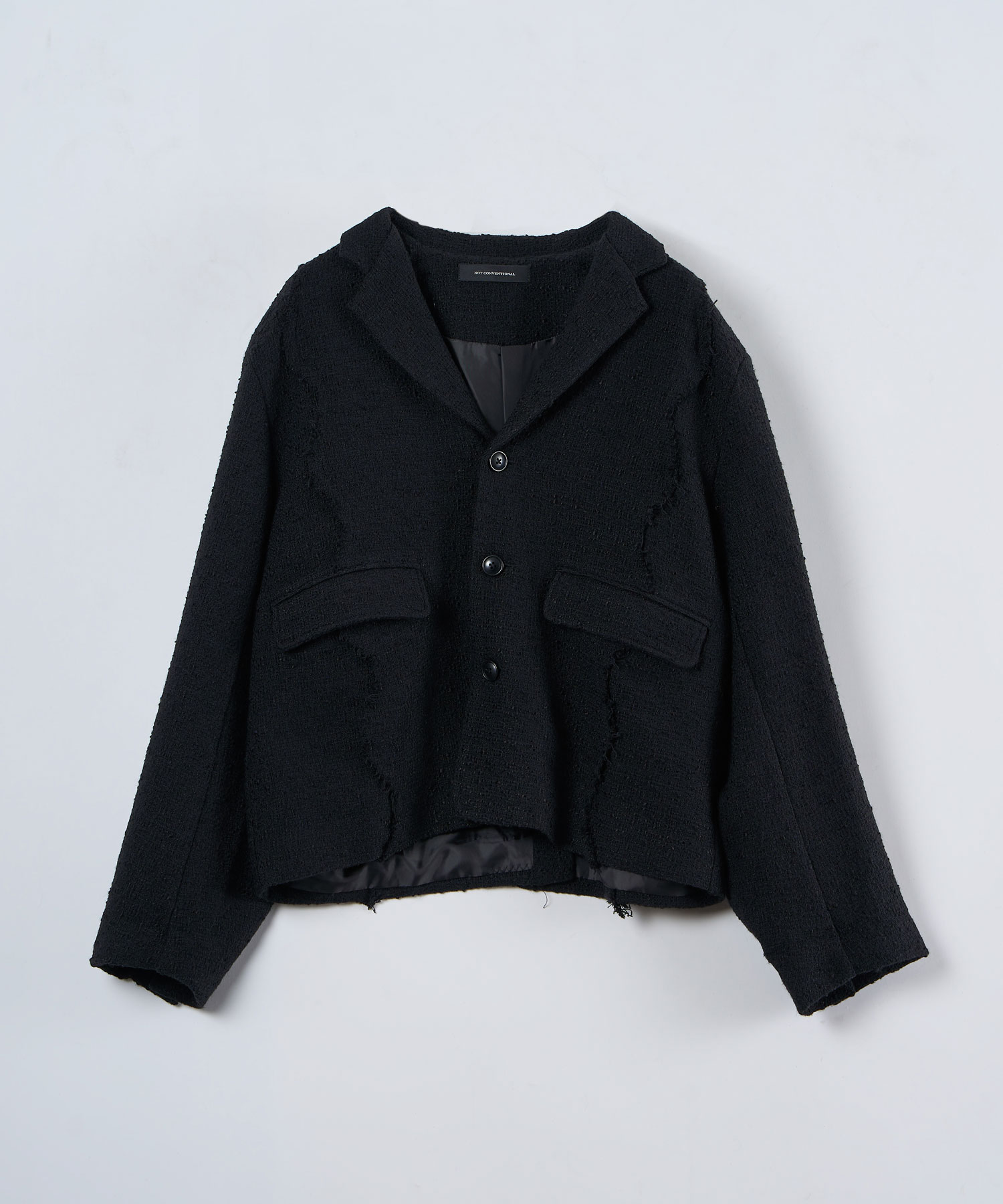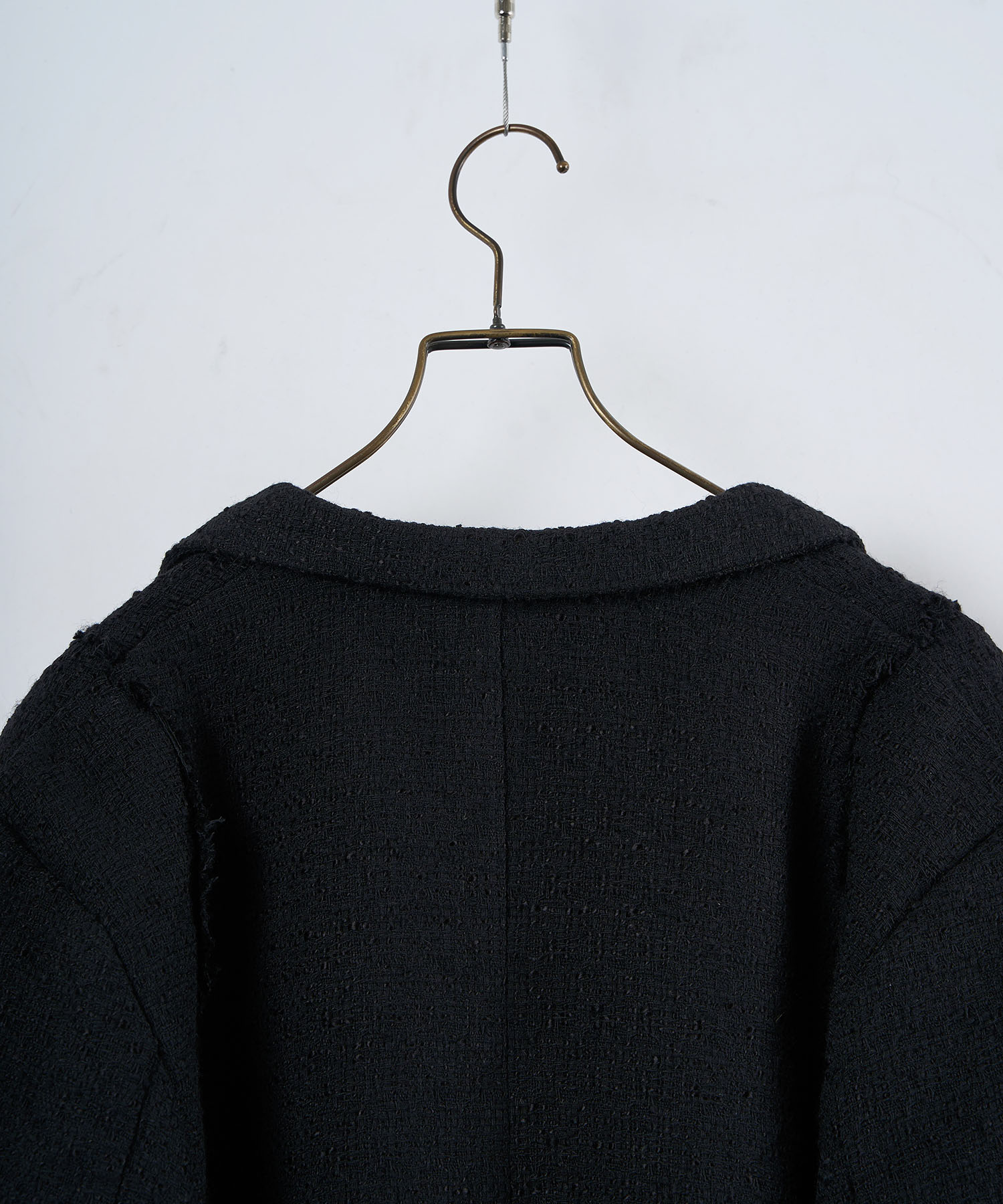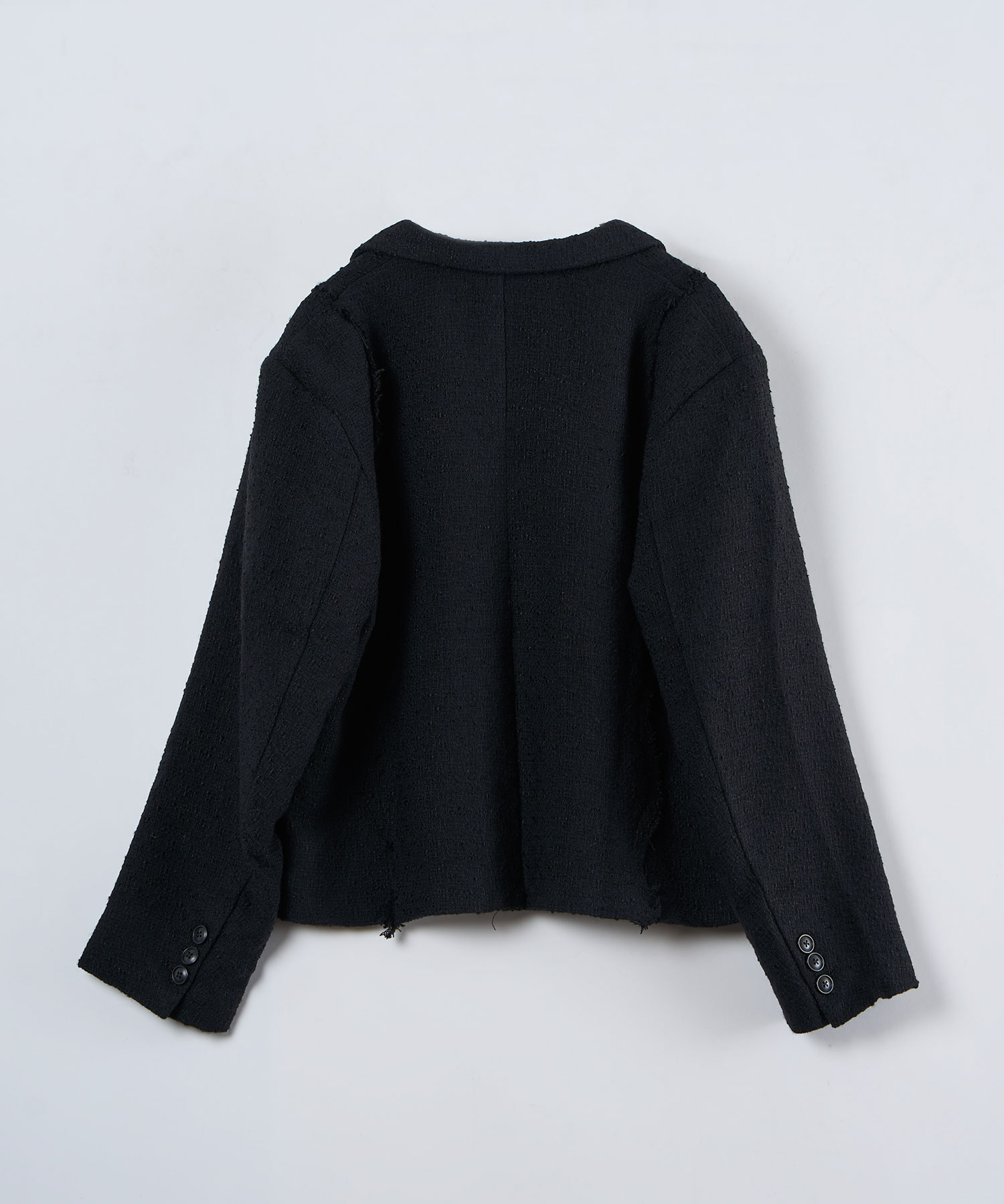 アクリル×ウール×ポリエステルのイタリアンツイードを使用したアイビーラインツイードジャケット。セミマットな質感で上品な生地をあえてカットオフにすることで、ドレッシーになり過ぎず着回しの効くアイテムに仕上げております。