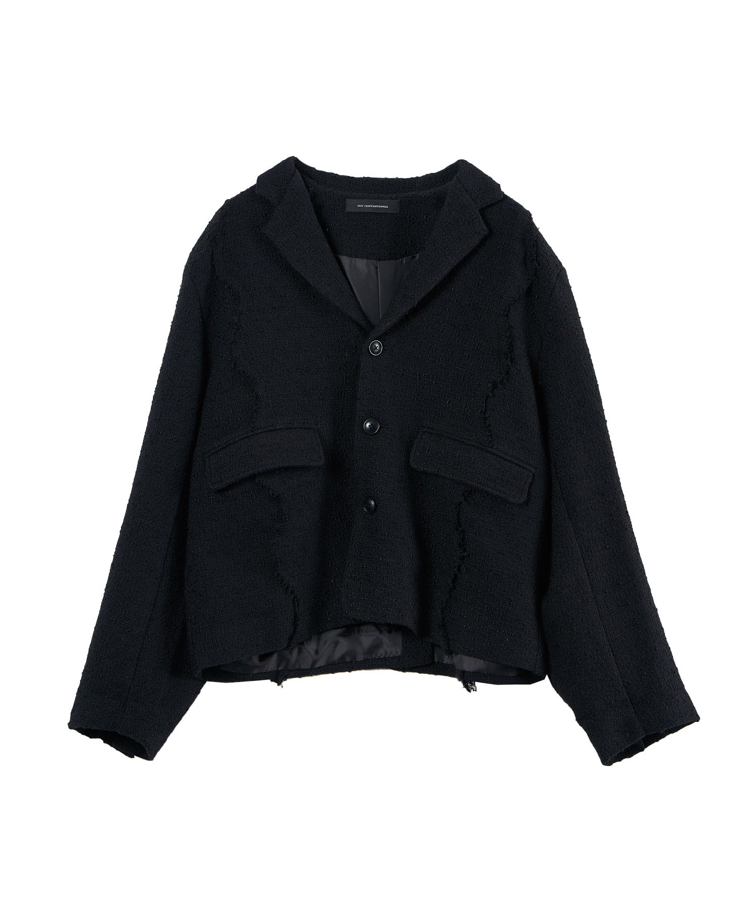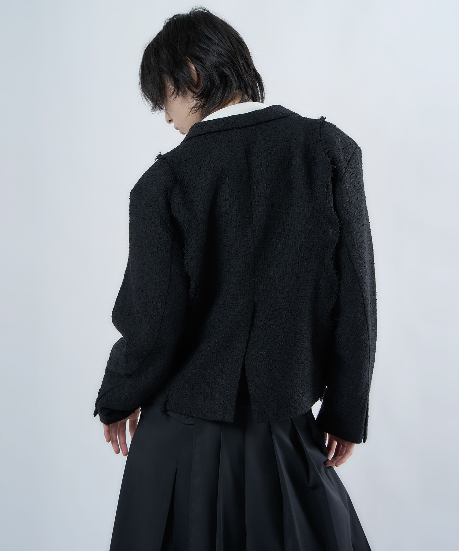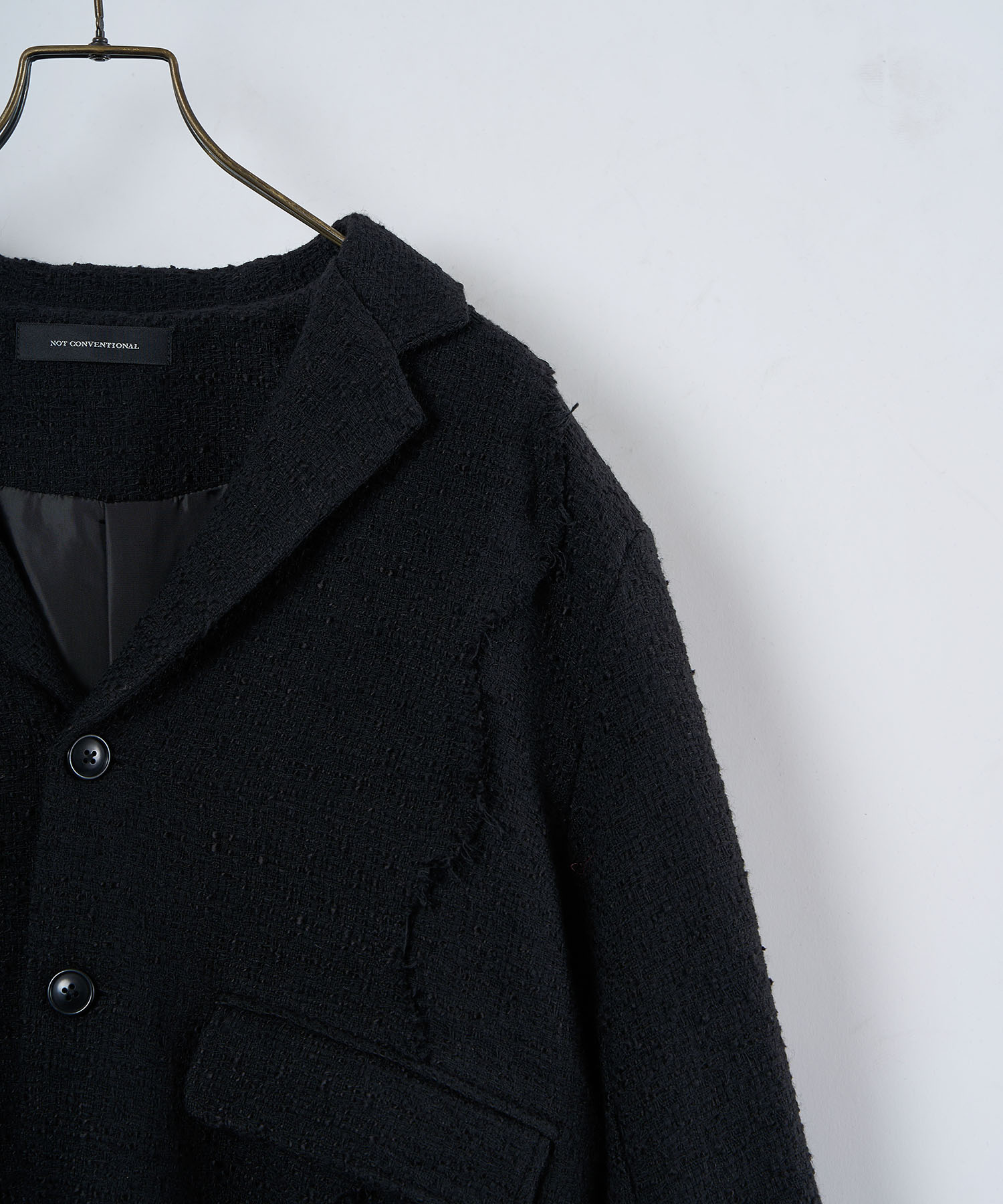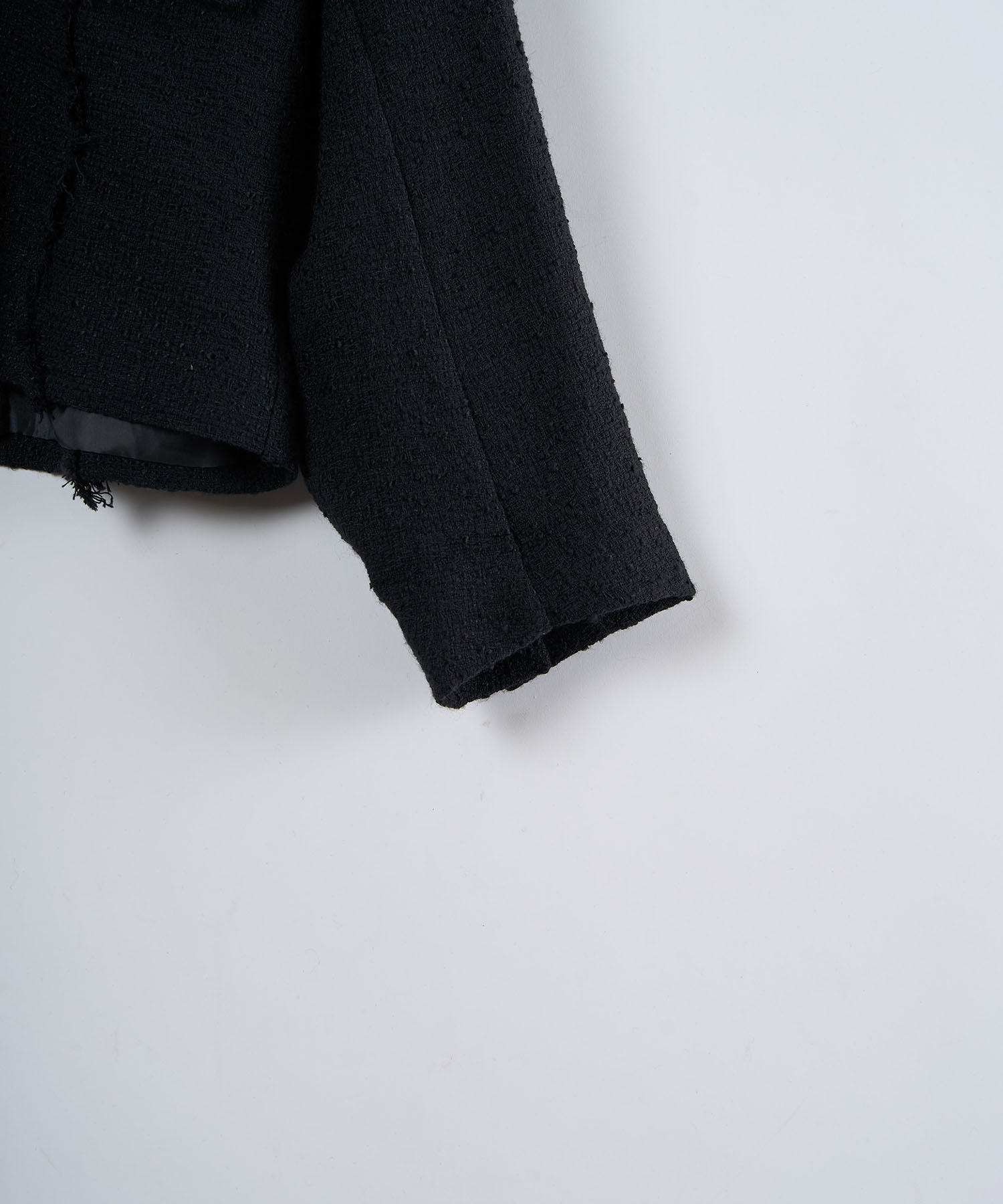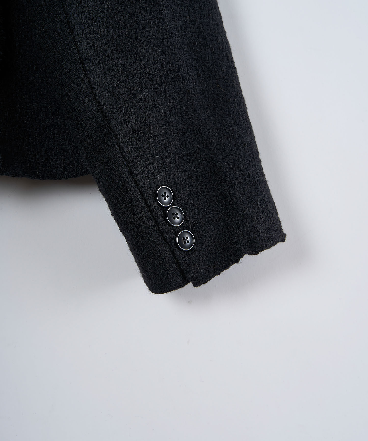 アクリル×ウール×ポリエステルのイタリアンツイードを使用したアイビーラインツイードジャケット。セミマットな質感で上品な生地をあえてカットオフにすることで、ドレッシーになり過ぎず着回しの効くアイテムに仕上げております。