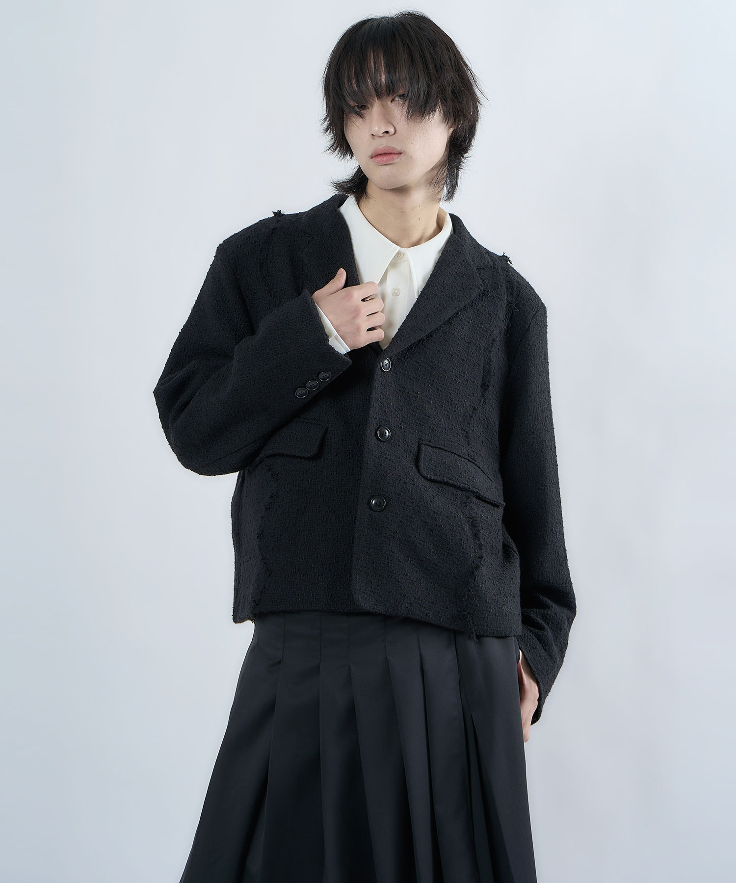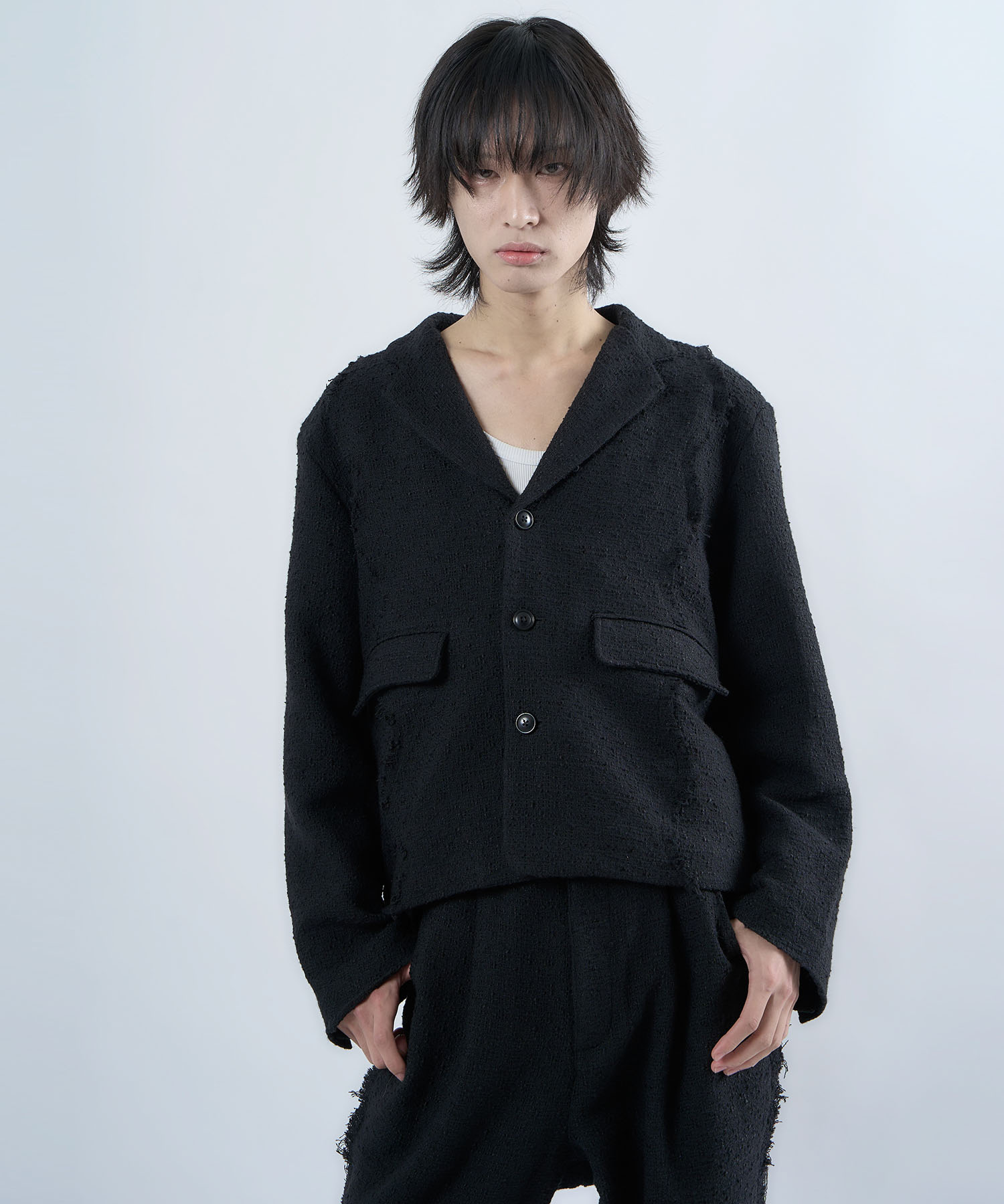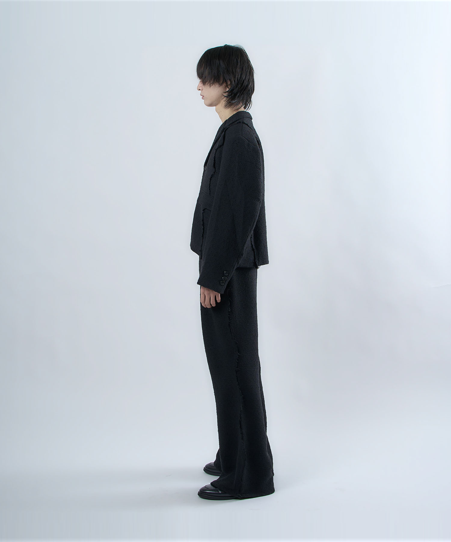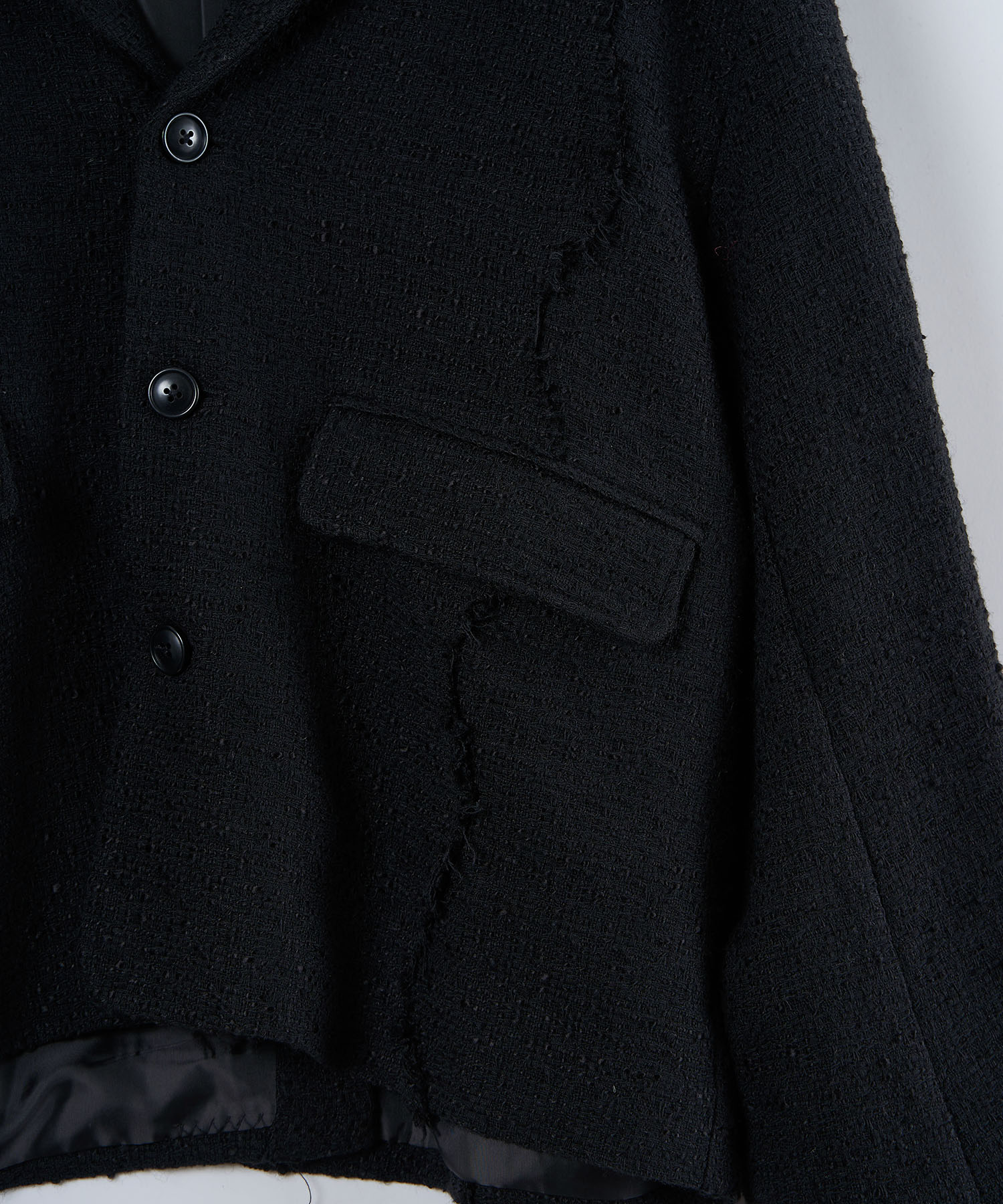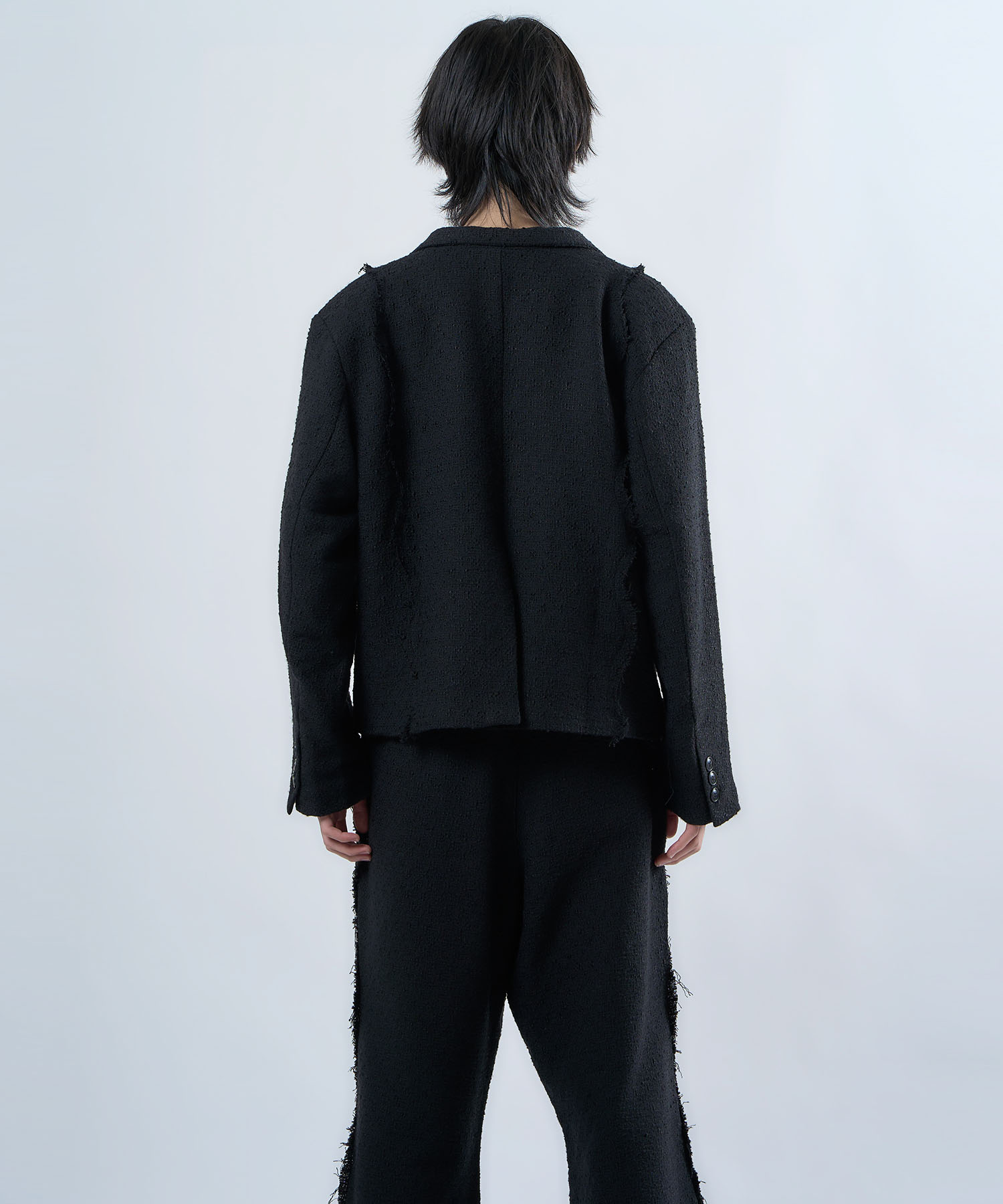 アクリル×ウール×ポリエステルのイタリアンツイードを使用したアイビーラインツイードジャケット。セミマットな質感で上品な生地をあえてカットオフにすることで、ドレッシーになり過ぎず着回しの効くアイテムに仕上げております。