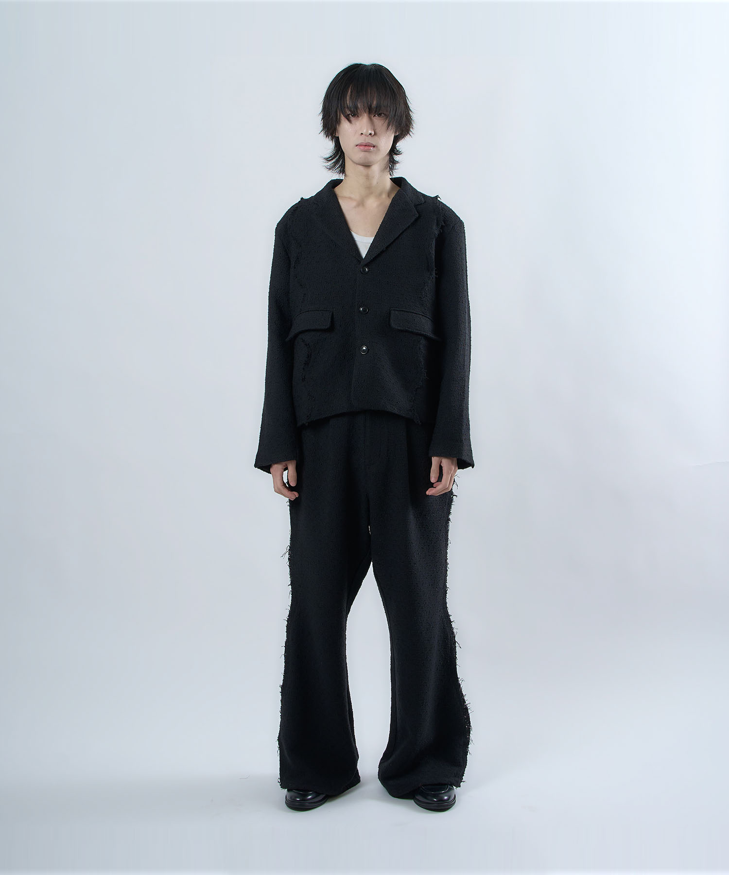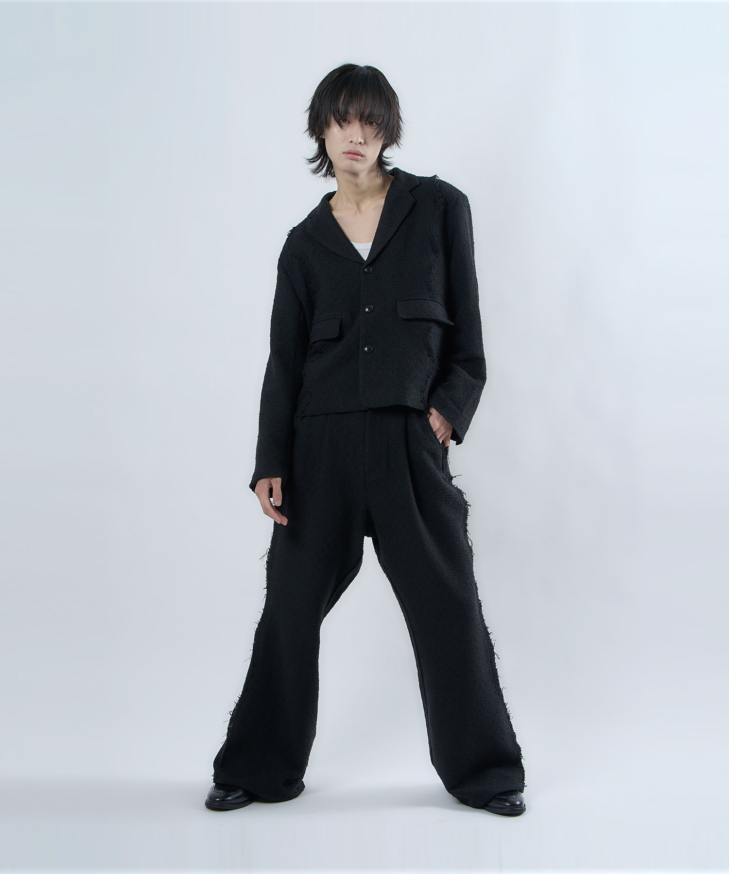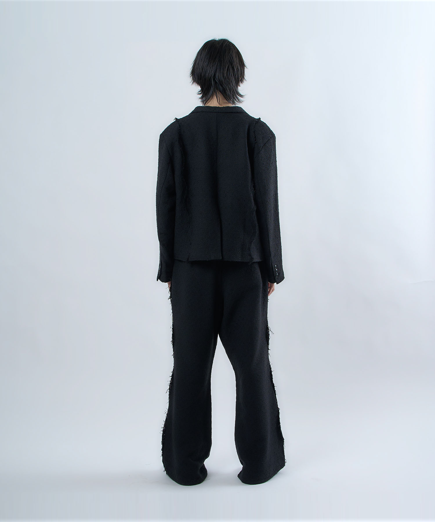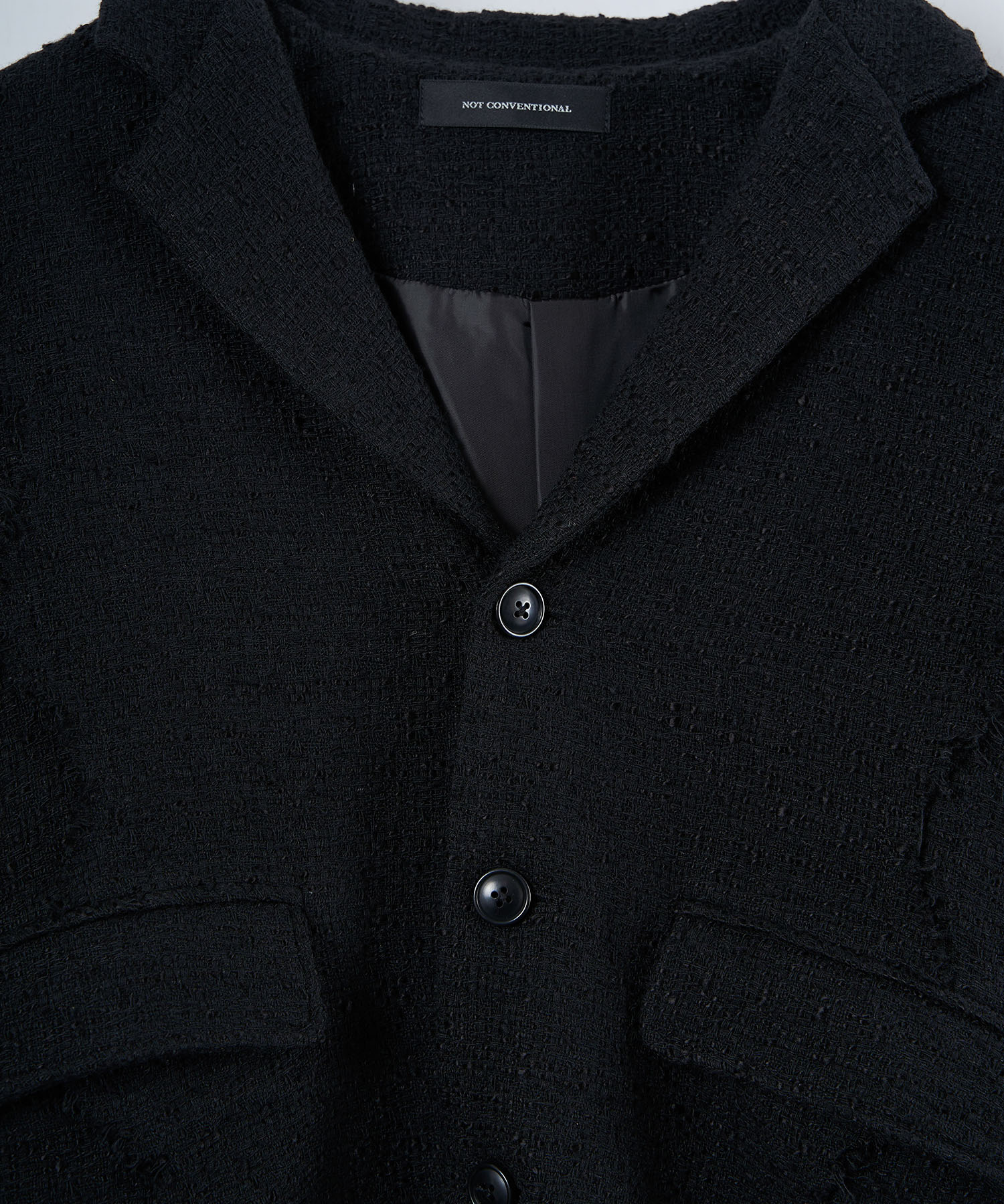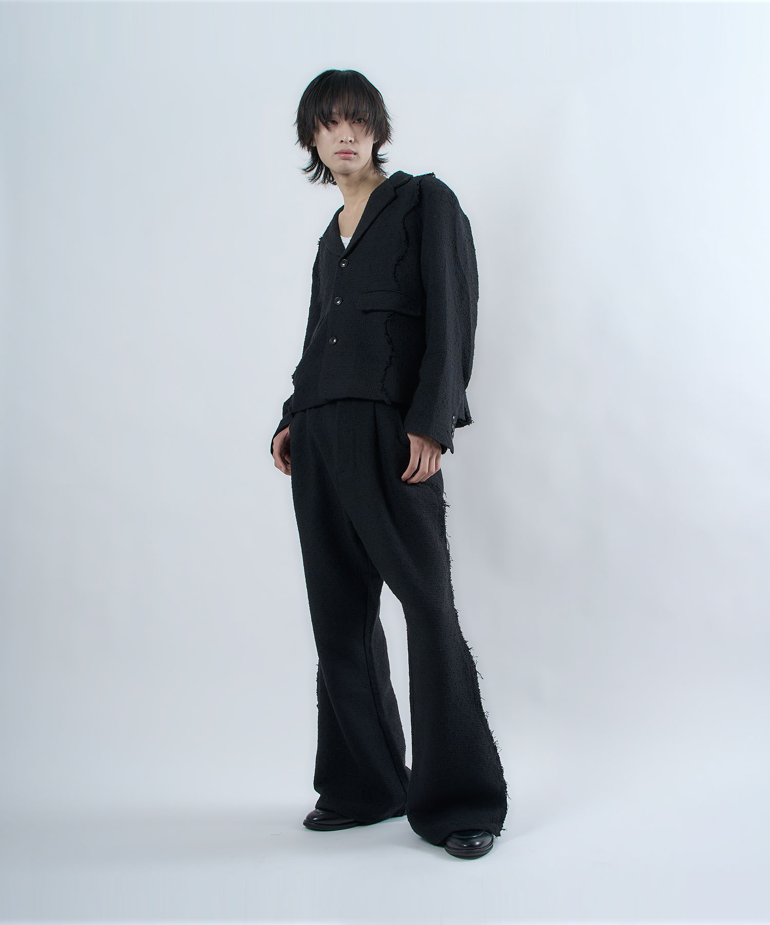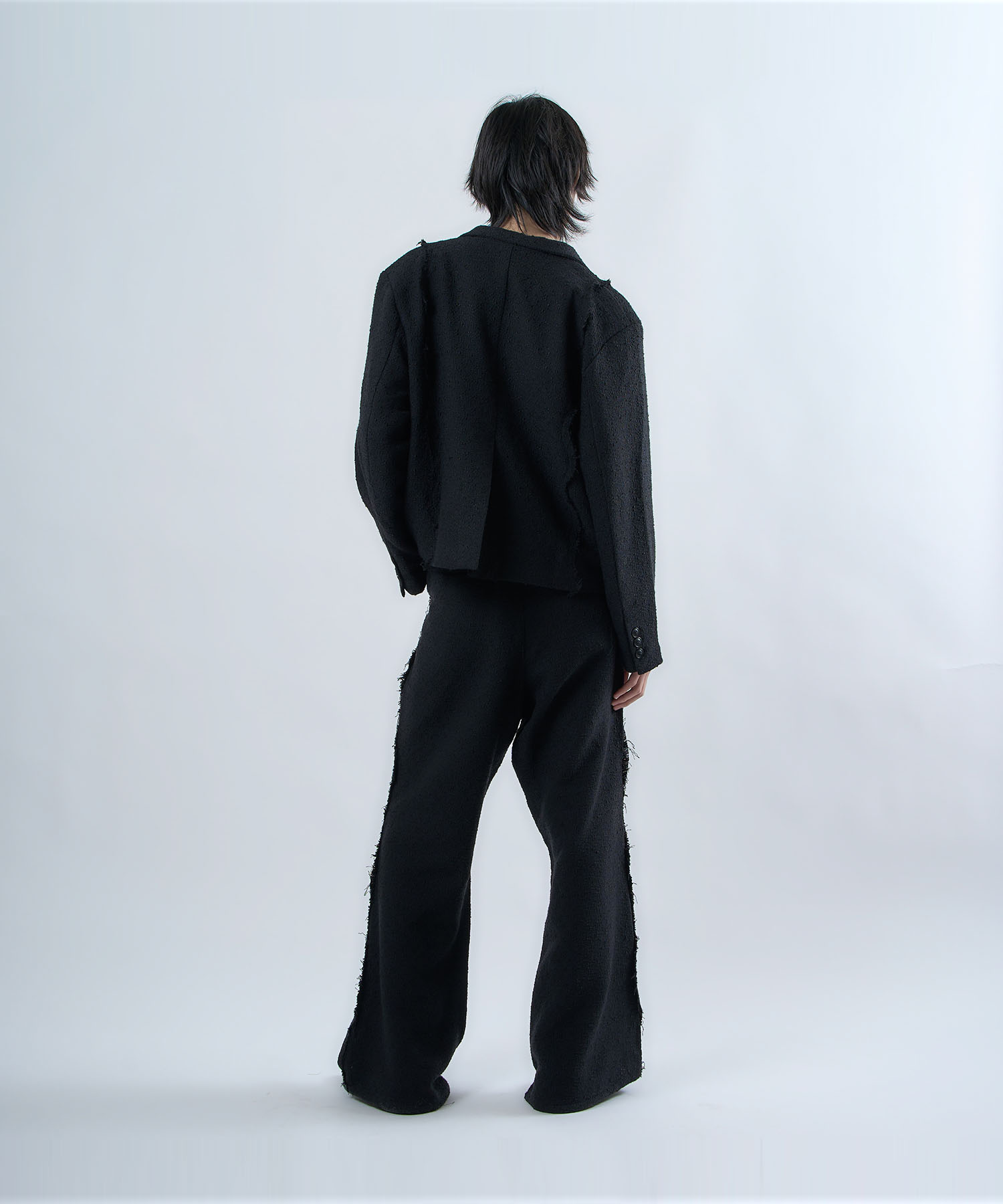 アクリル×ウール×ポリエステルのイタリアンツイードを使用したアイビーラインツイードジャケット。セミマットな質感で上品な生地をあえてカットオフにすることで、ドレッシーになり過ぎず着回しの効くアイテムに仕上げております。