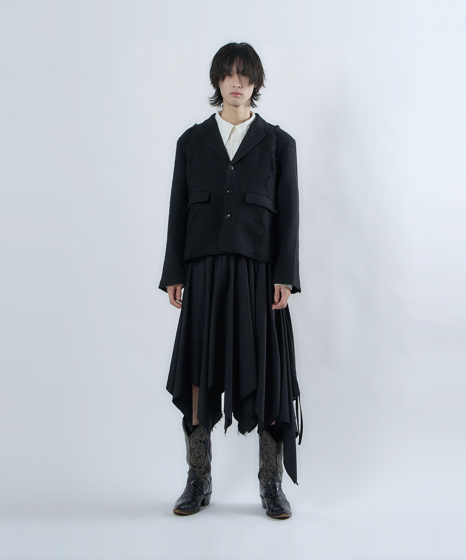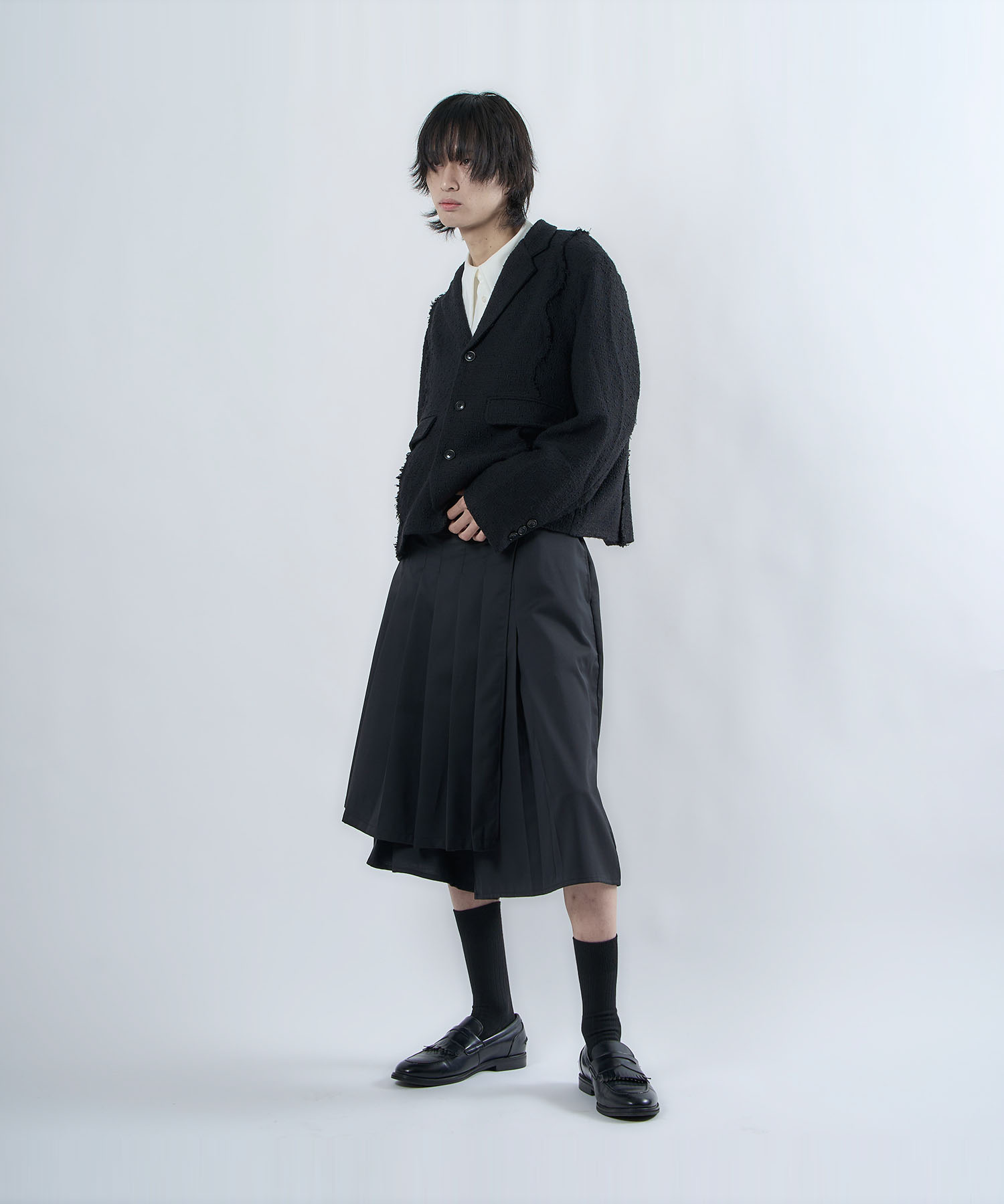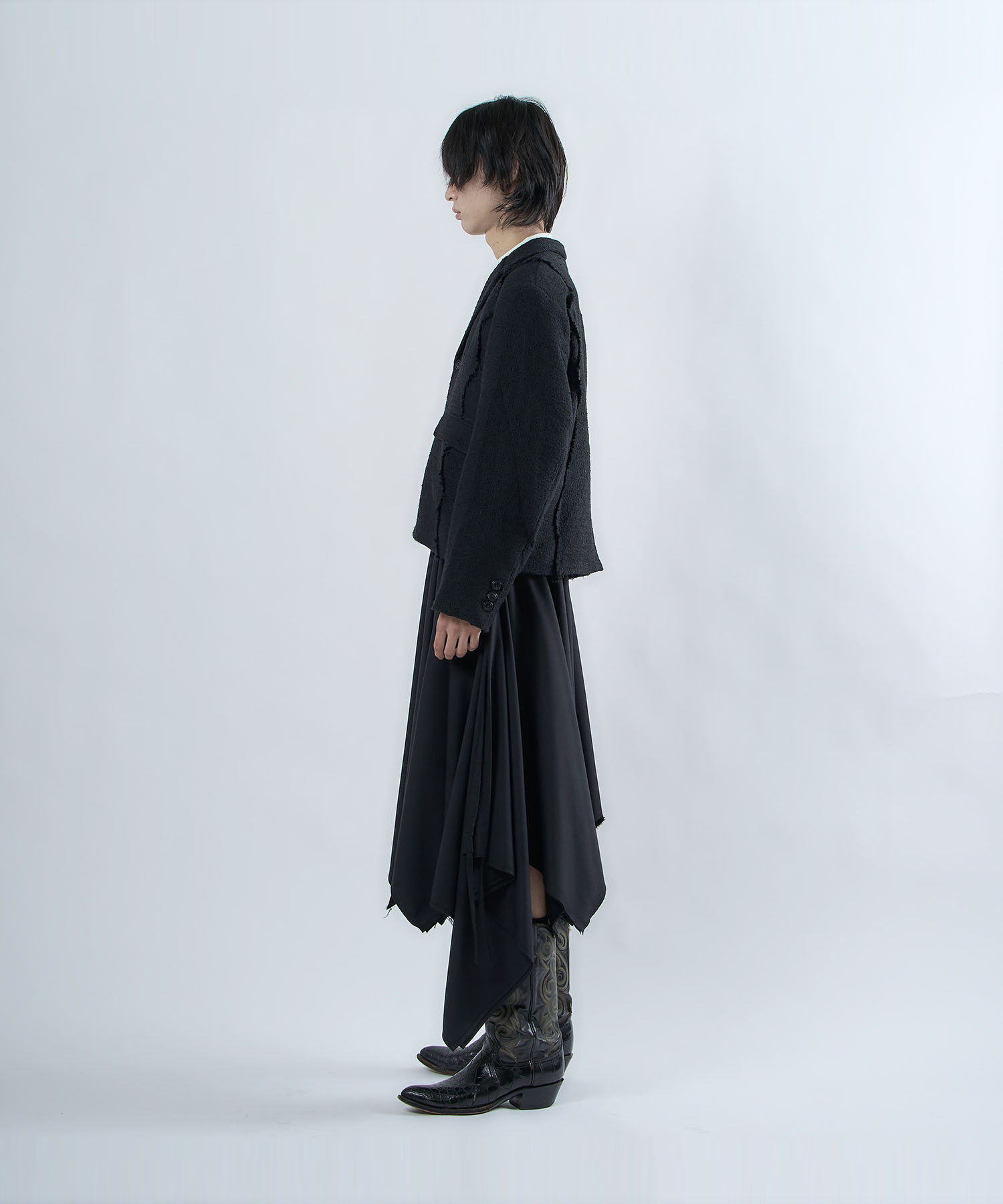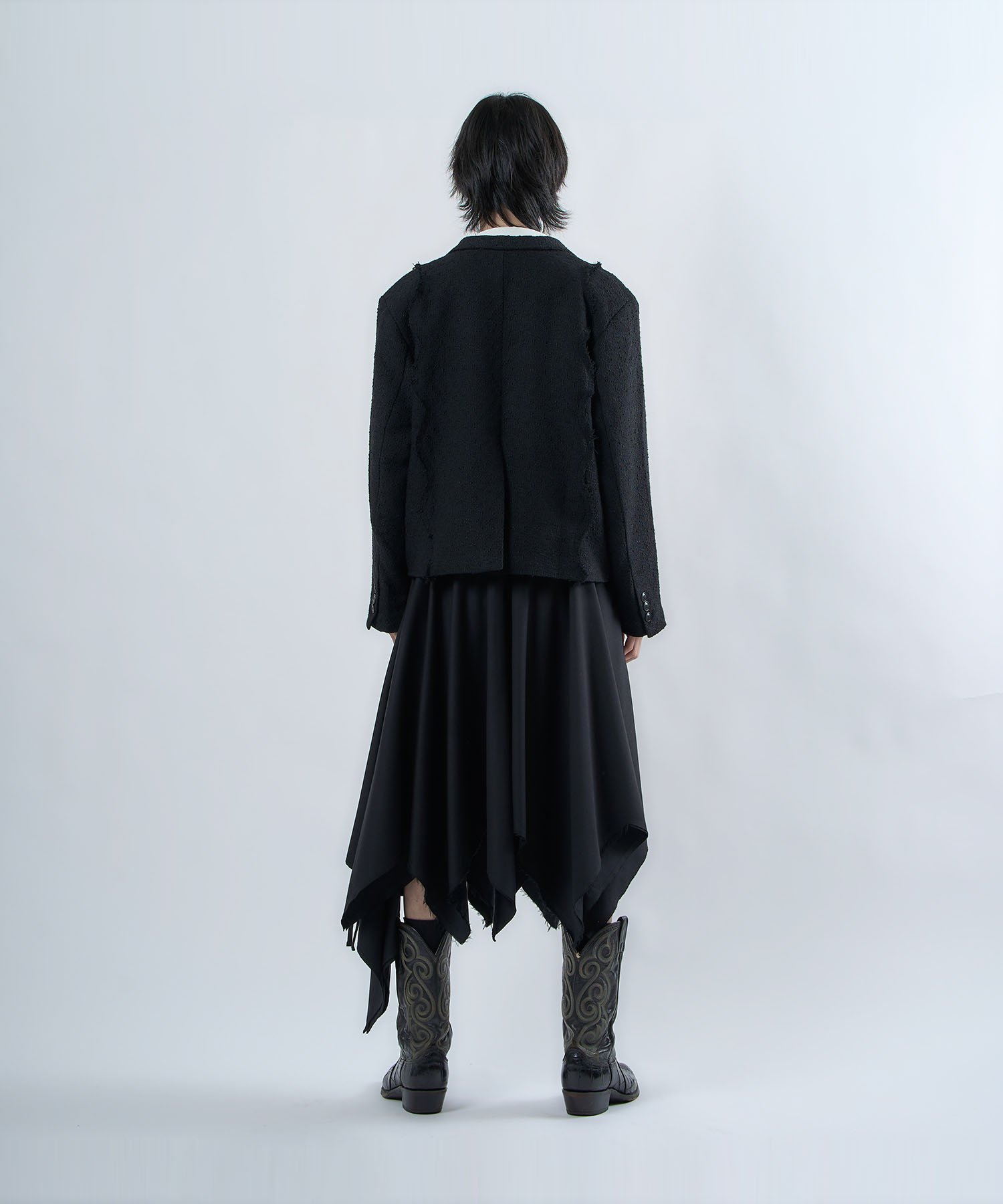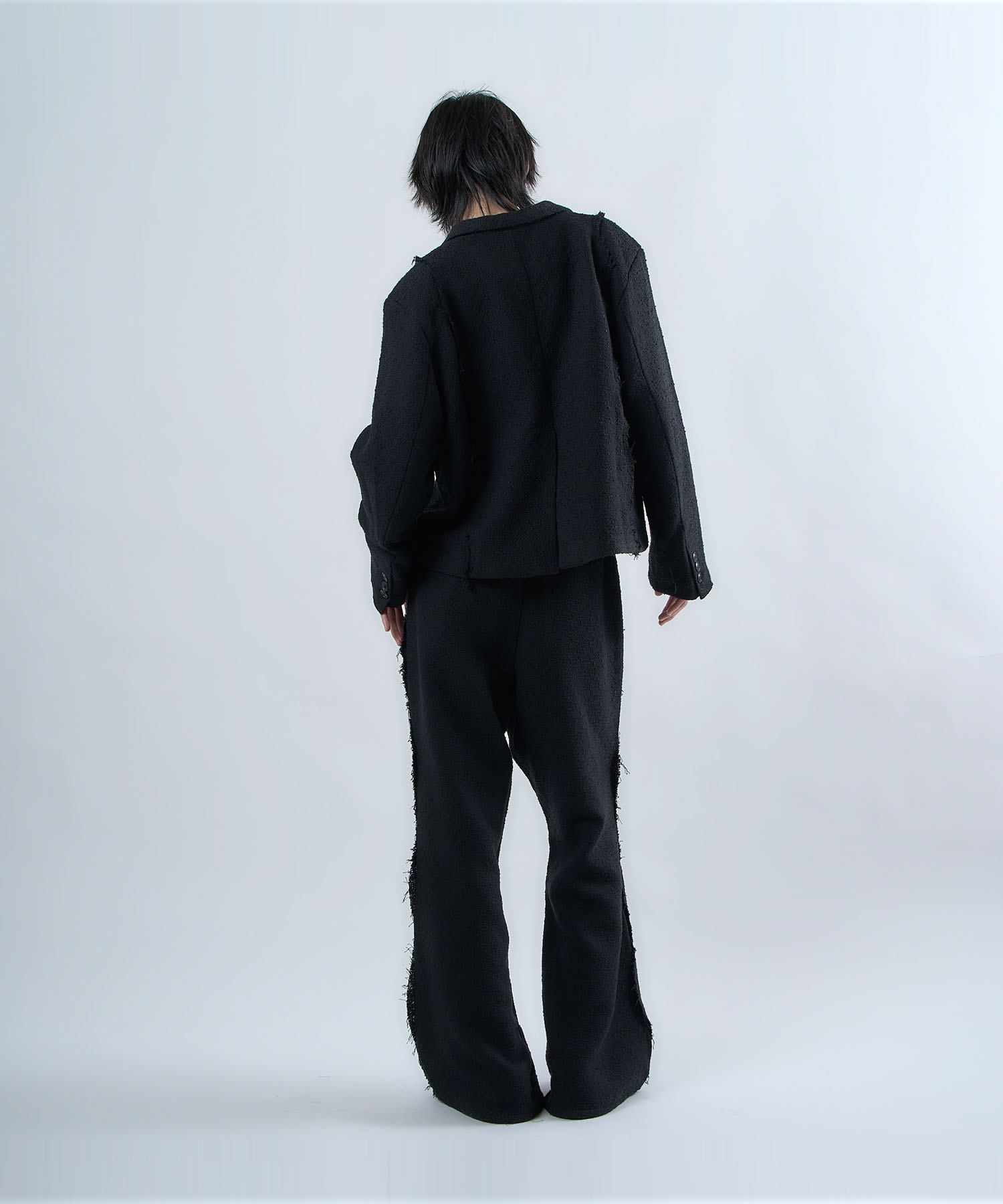アクリル×ウール×ポリエステルのイタリアンツイードを使用したアイビーラインツイードジャケット。セミマットな質感で上品な生地をあえてカットオフにすることで、ドレッシーになり過ぎず着回しの効くアイテムに仕上げております。