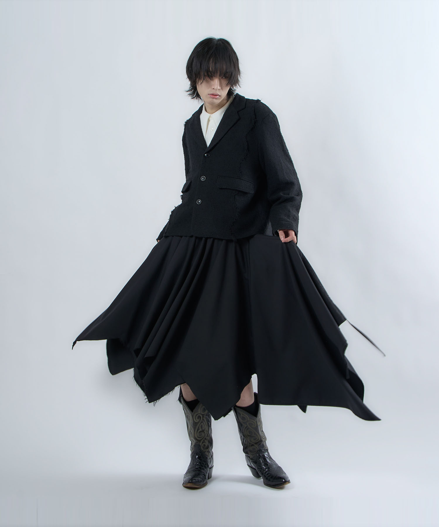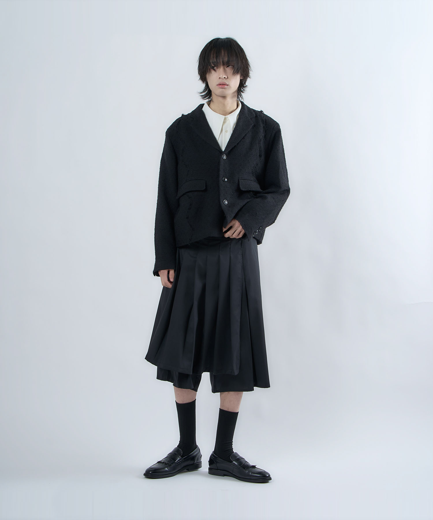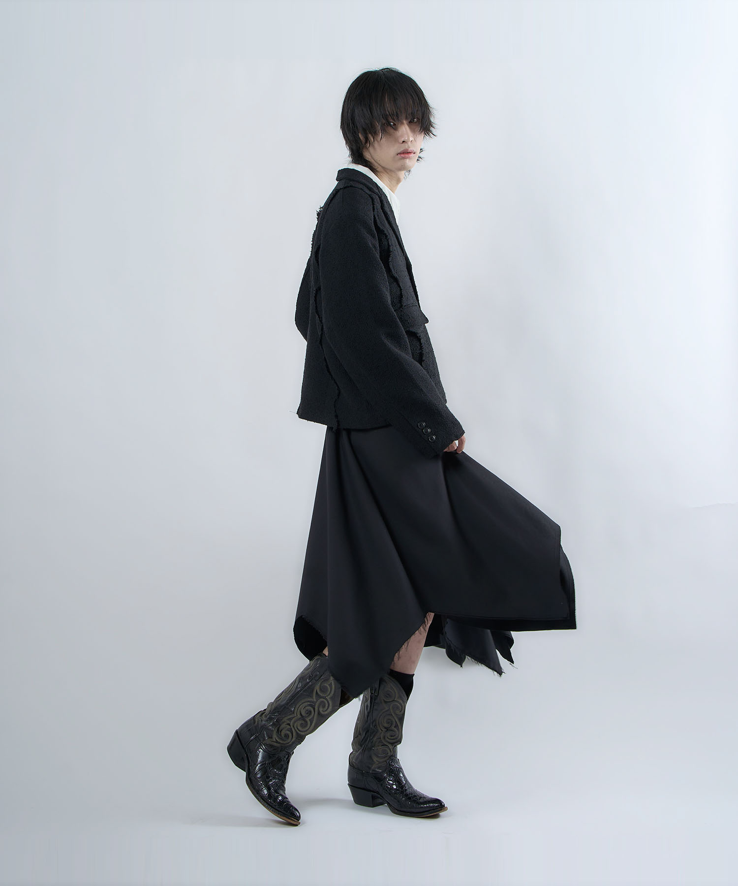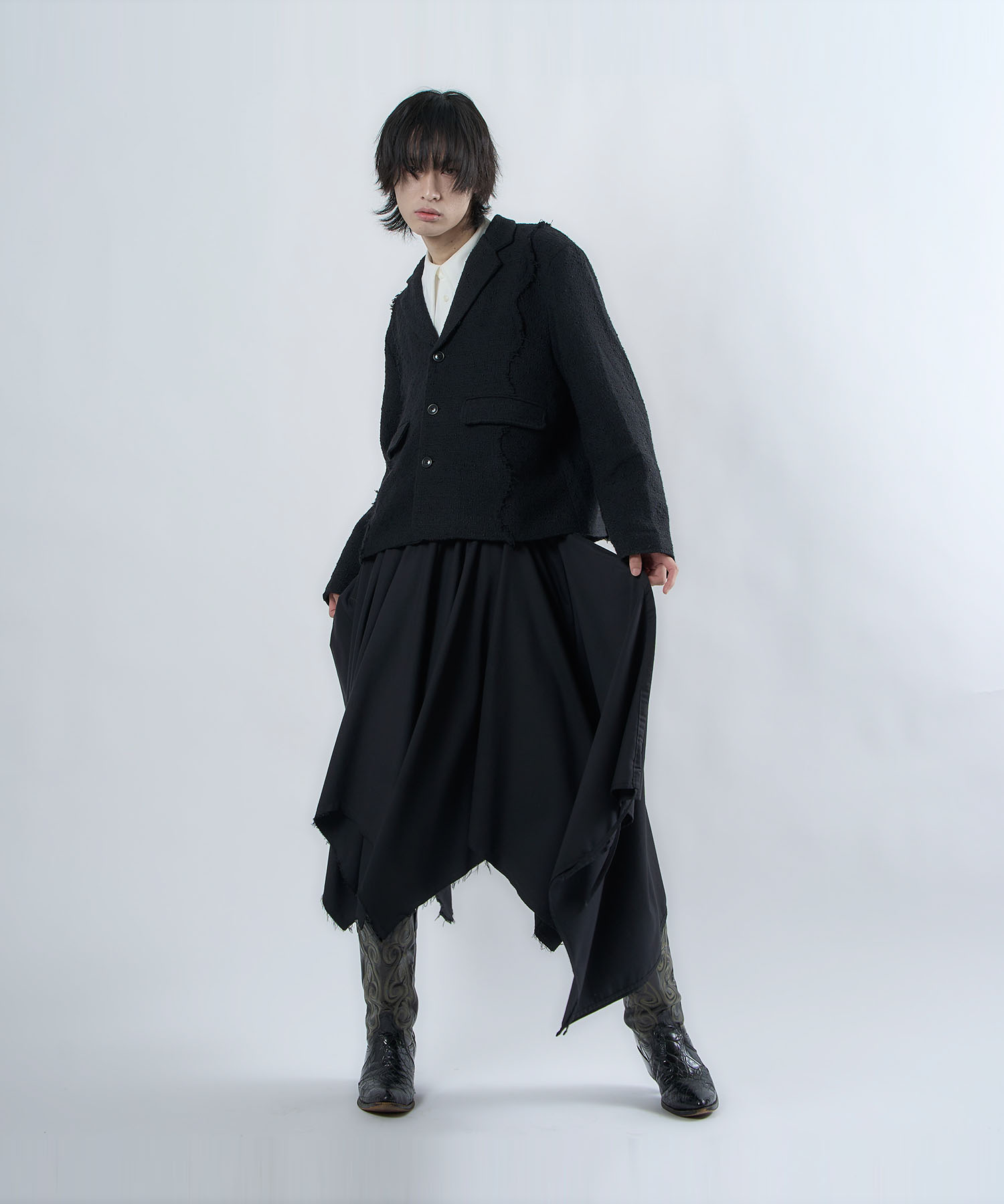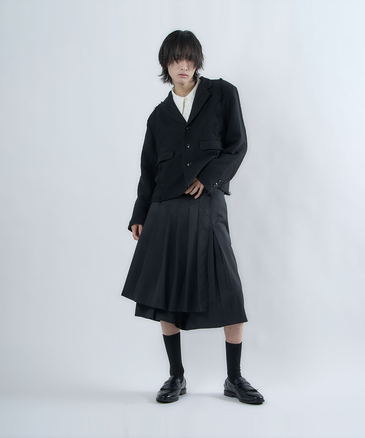 アクリル×ウール×ポリエステルのイタリアンツイードを使用したアイビーラインツイードジャケット。セミマットな質感で上品な生地をあえてカットオフにすることで、ドレッシーになり過ぎず着回しの効くアイテムに仕上げております。
