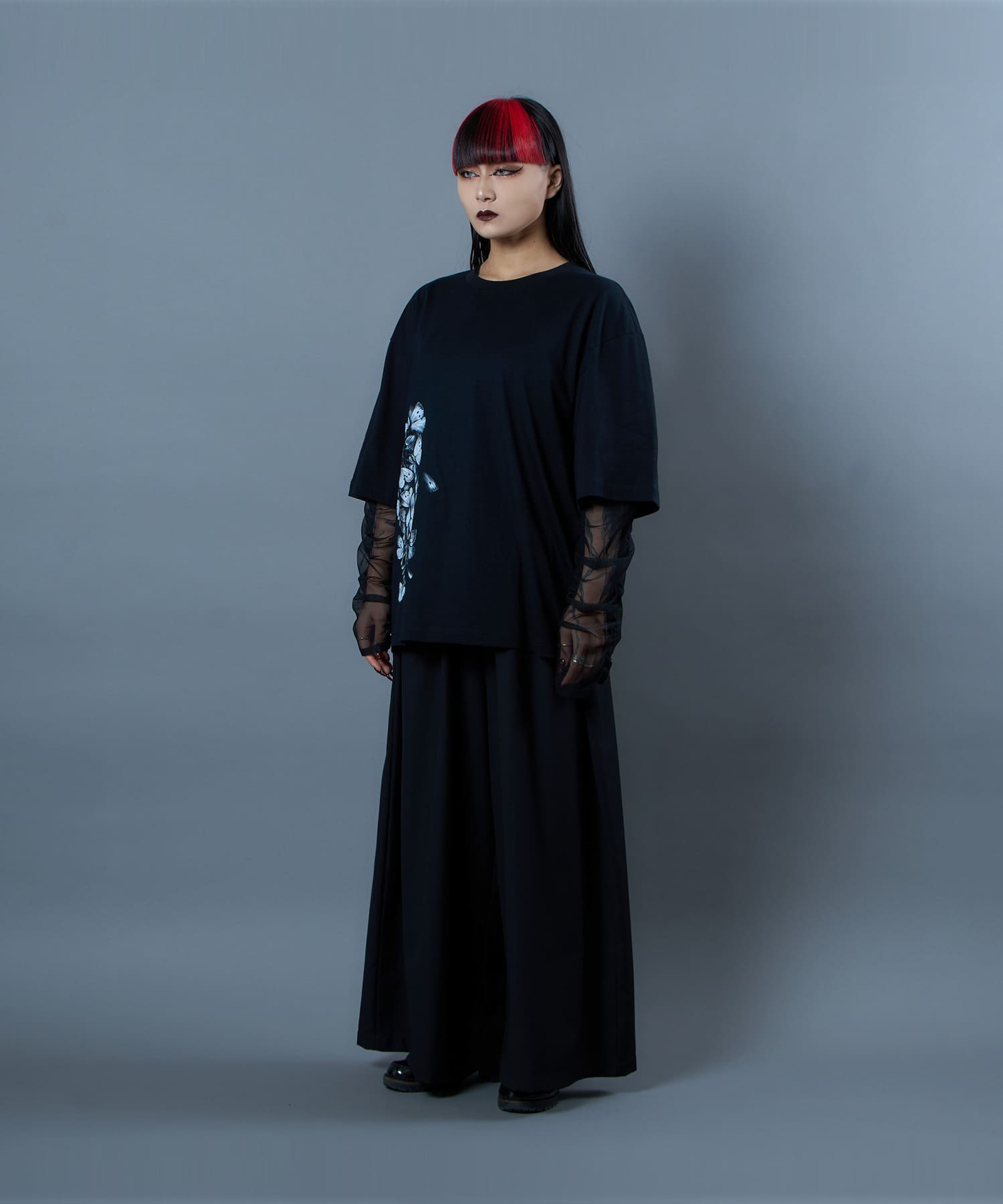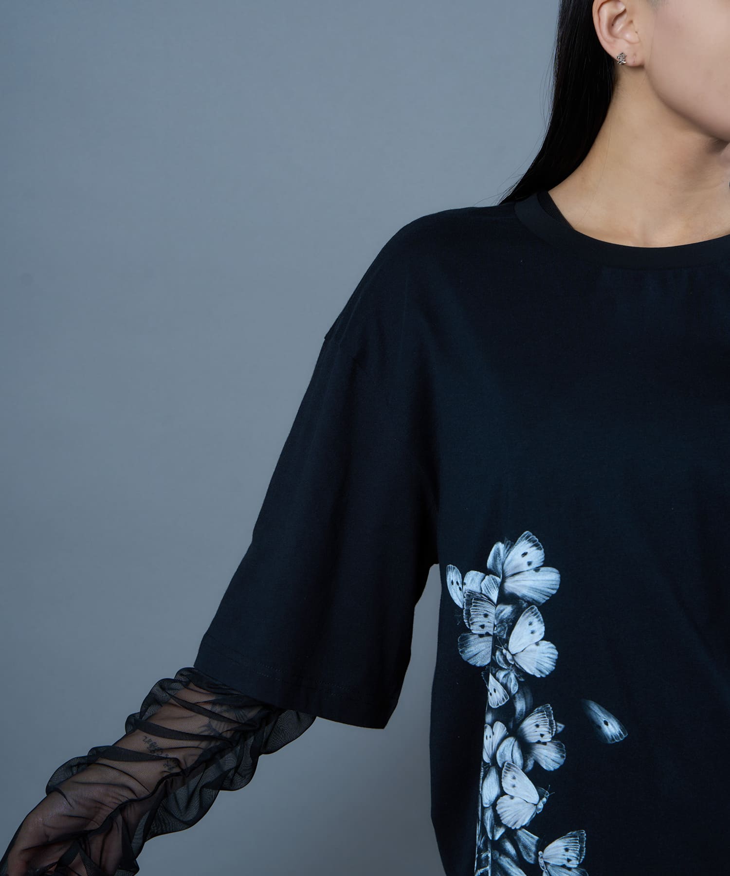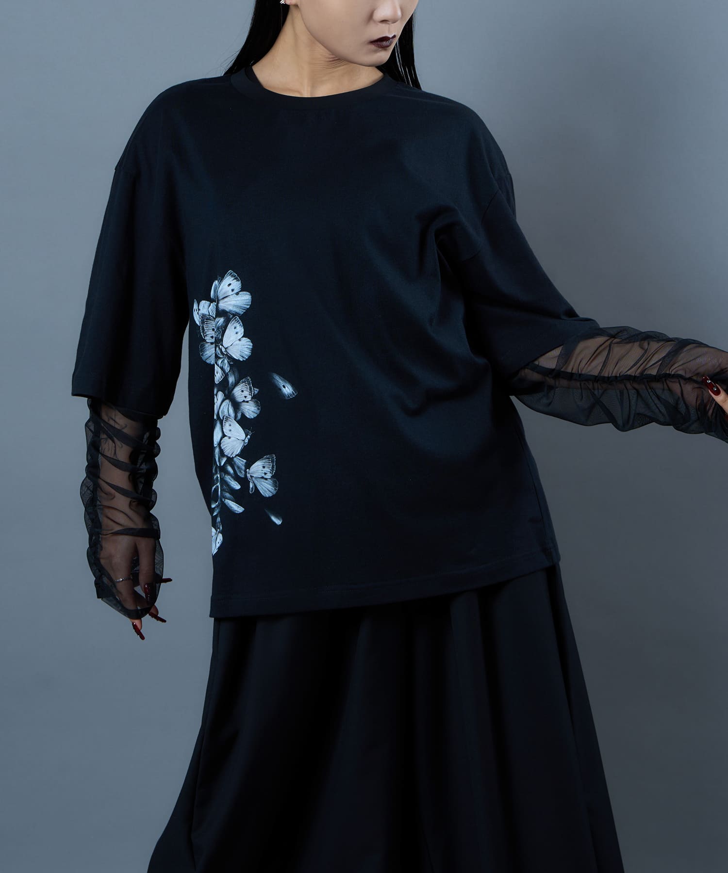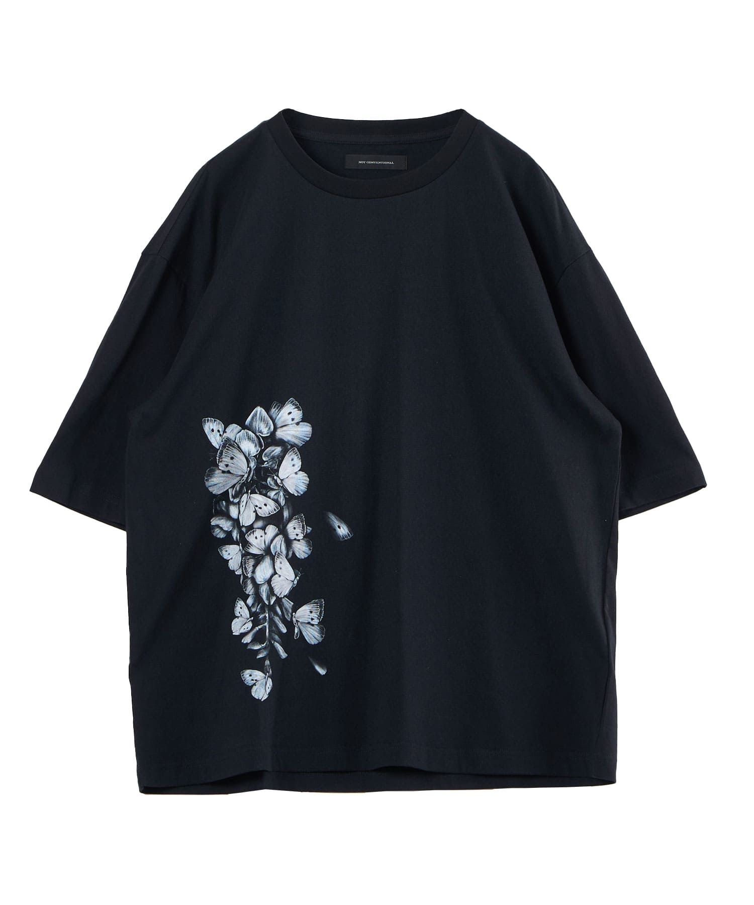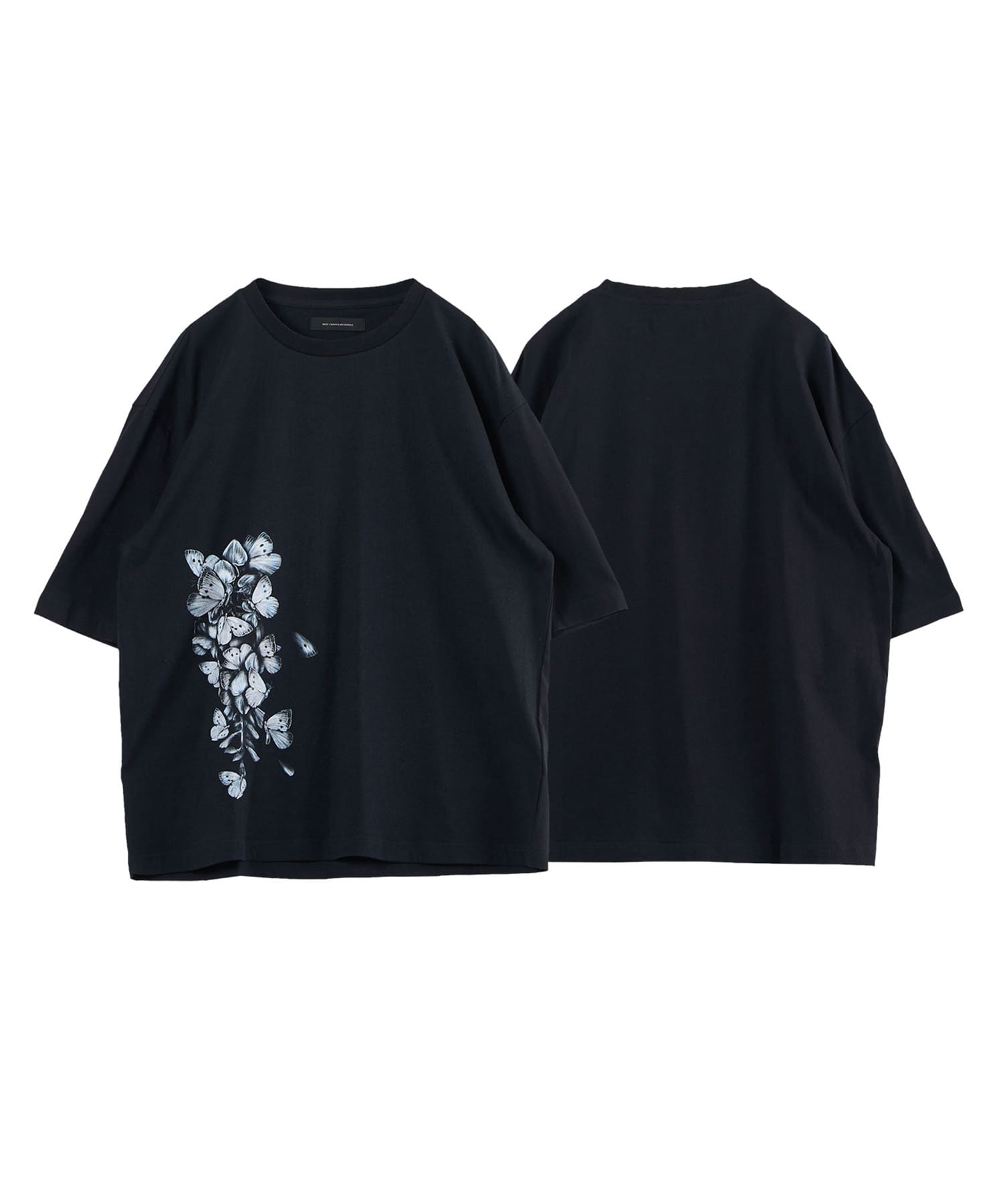 The Butterfly Wisteria Tee is generously sized and made of soft and comfortable material, and is an easy-care item made of 100% natural cotton. The graphic motif of wisteria and butterflies expresses ephemeral beauty, but at the same time, it has a sense of strangeness. The large print on the hem of this eye-catching piece can be worn alone or layered.