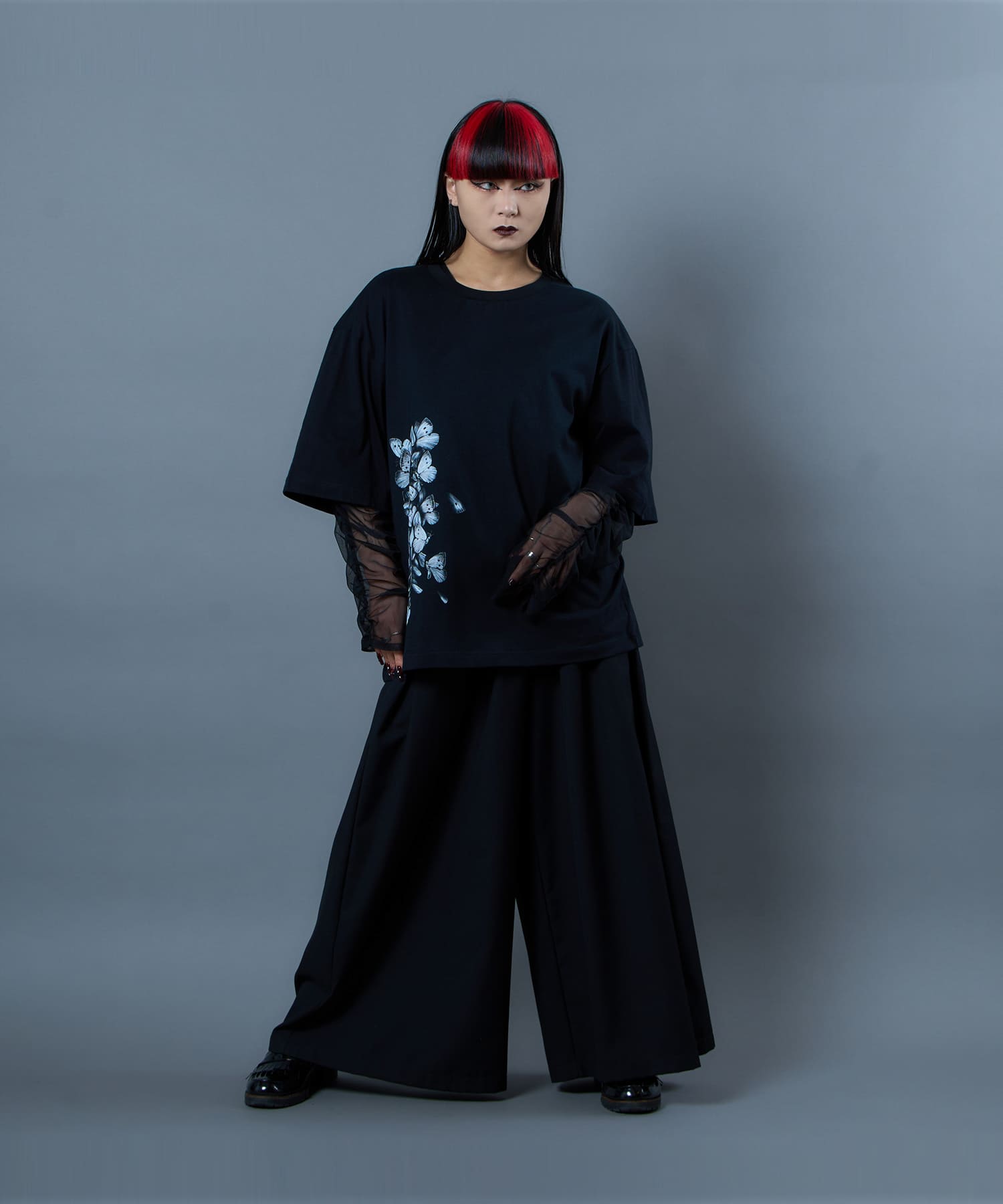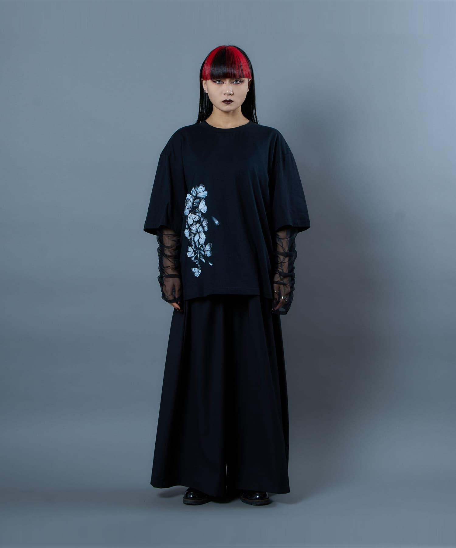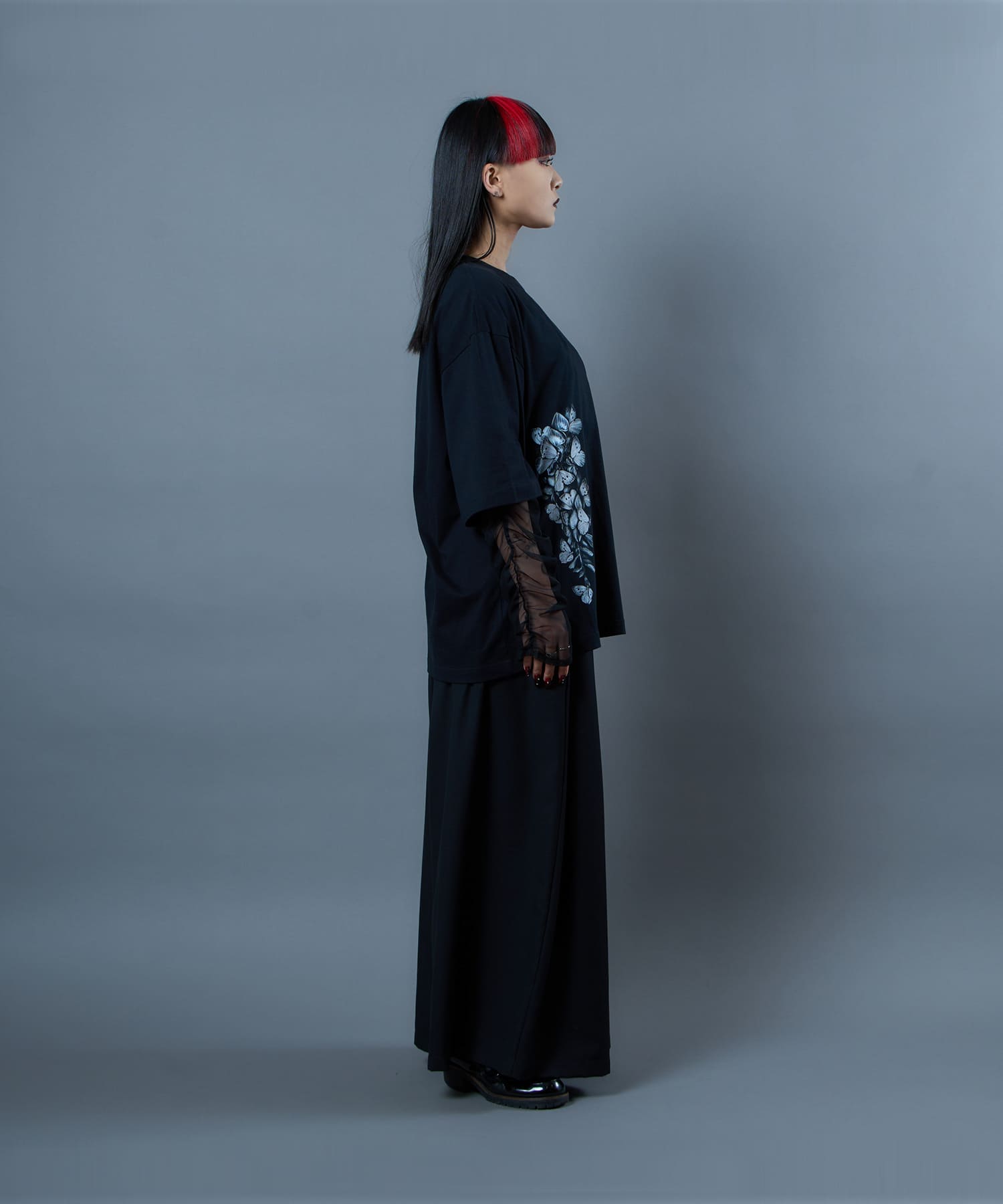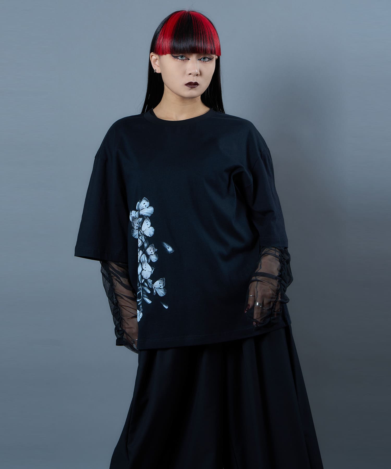The Butterfly Wisteria Tee is generously sized and made of soft and comfortable material, and is an easy-care item made of 100% natural cotton. The graphic motif of wisteria and butterflies expresses ephemeral beauty, but at the same time, it has a sense of strangeness. The large print on the hem of this eye-catching piece can be worn alone or layered.