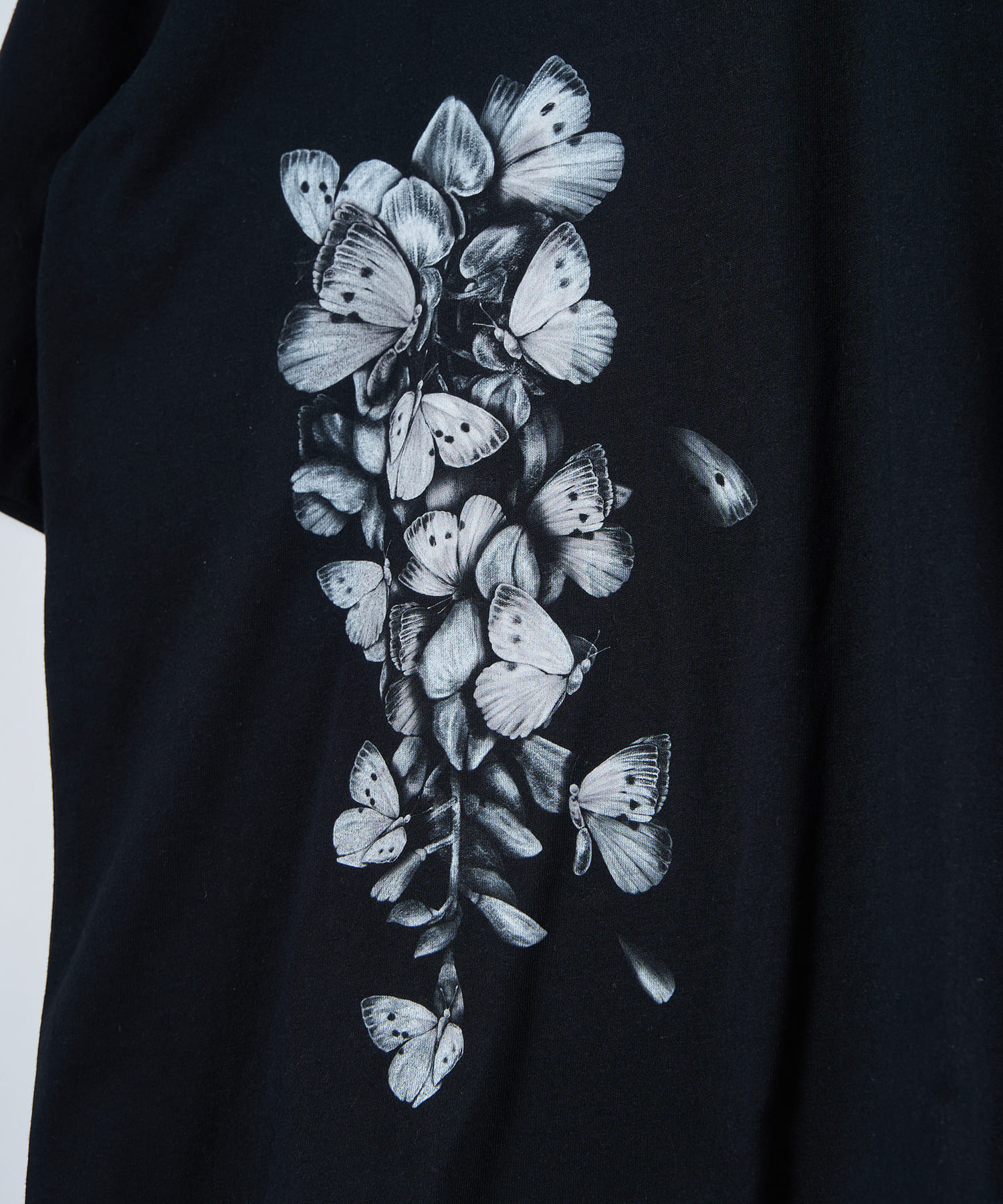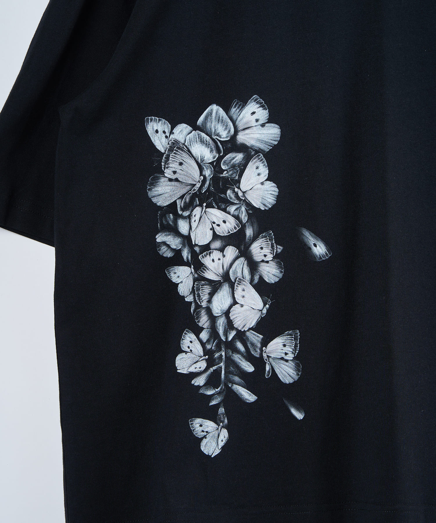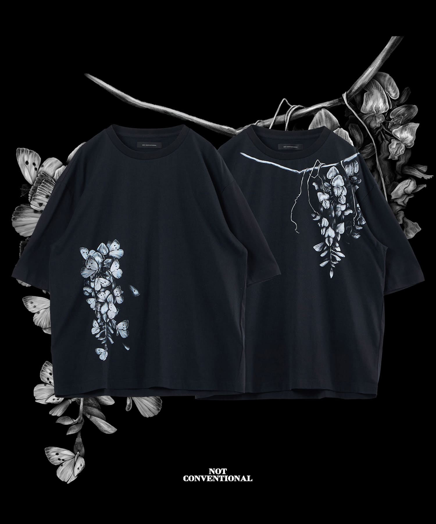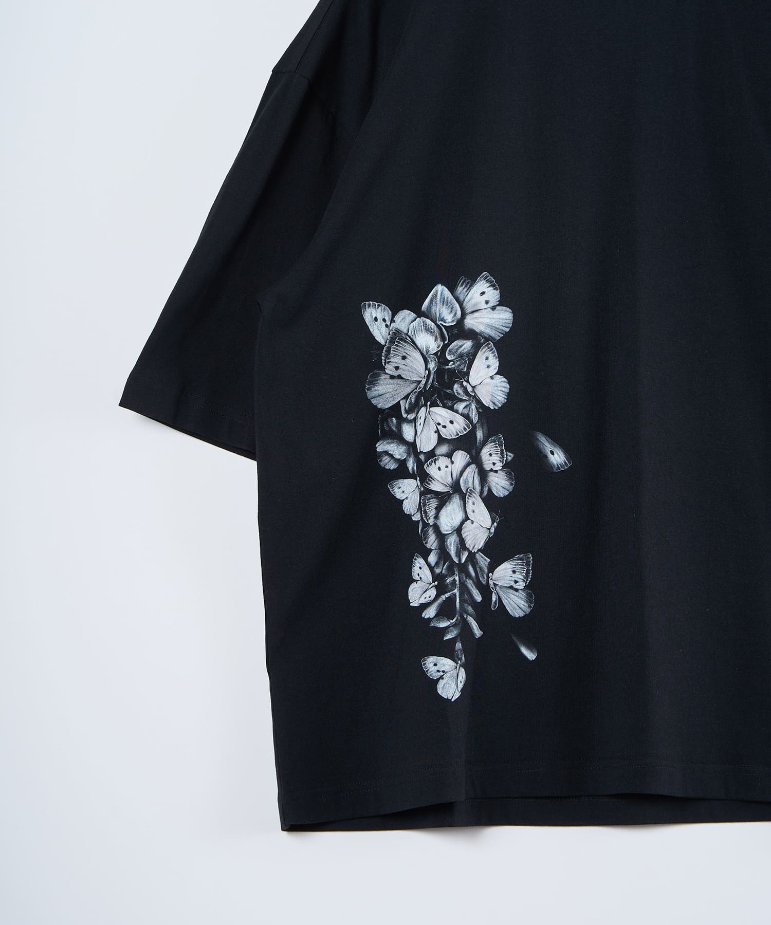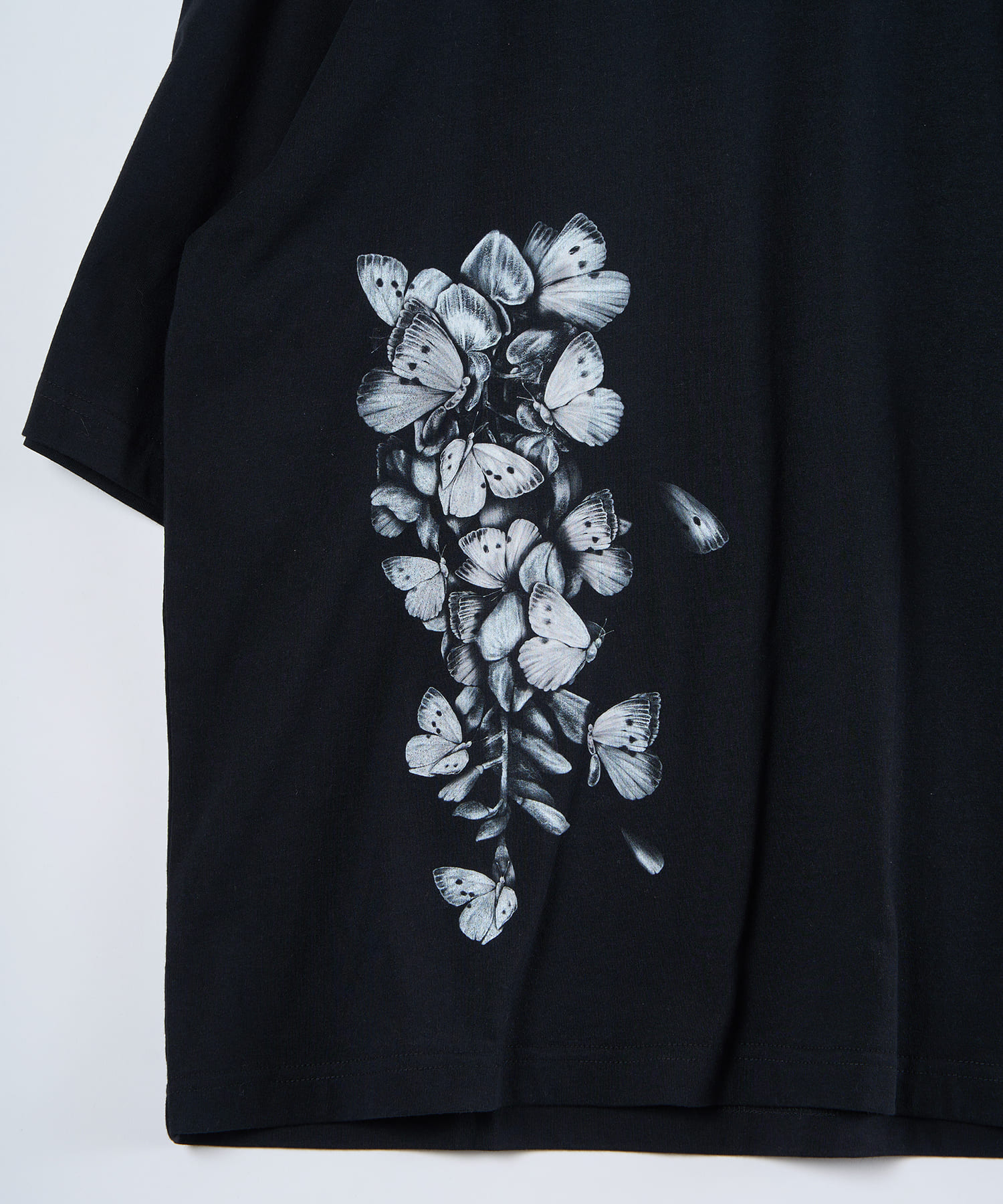 ゆったりとしたサイズ感と柔らかく肌触りの良い素材を使用した蝶々藤TEE。コットン100%の天然素材を使用しておりイージーケアなアイテムとなっております。藤と蝶をモチーフに仕上げられたグラフィックは、儚げな美を表現しつつも、どこか奇妙さを感じられる仕上がりです。裾に施された大判プリントが目を引く一枚で、単体でもレイヤードでもお楽しみいただけるアイテムとなっております。
