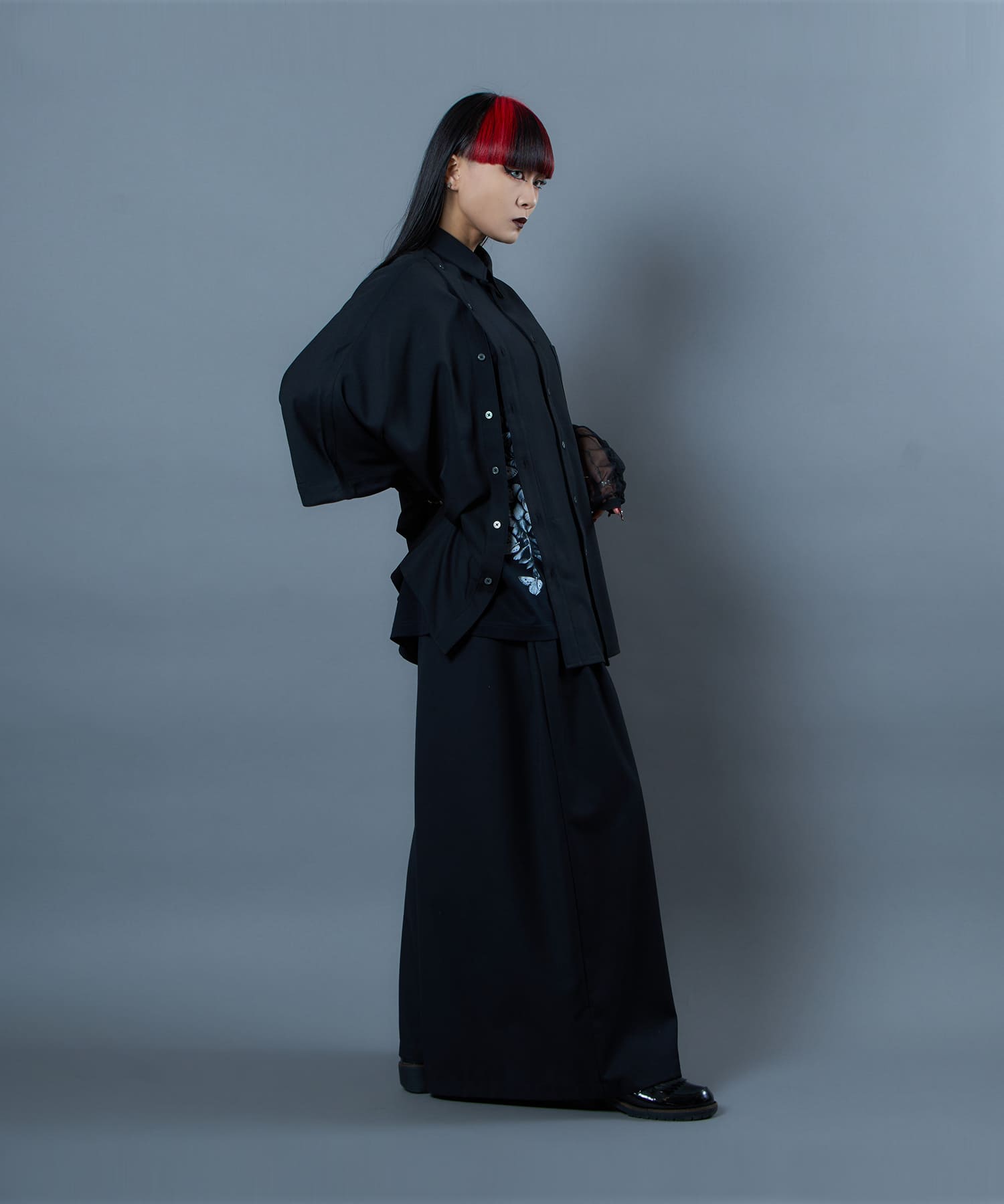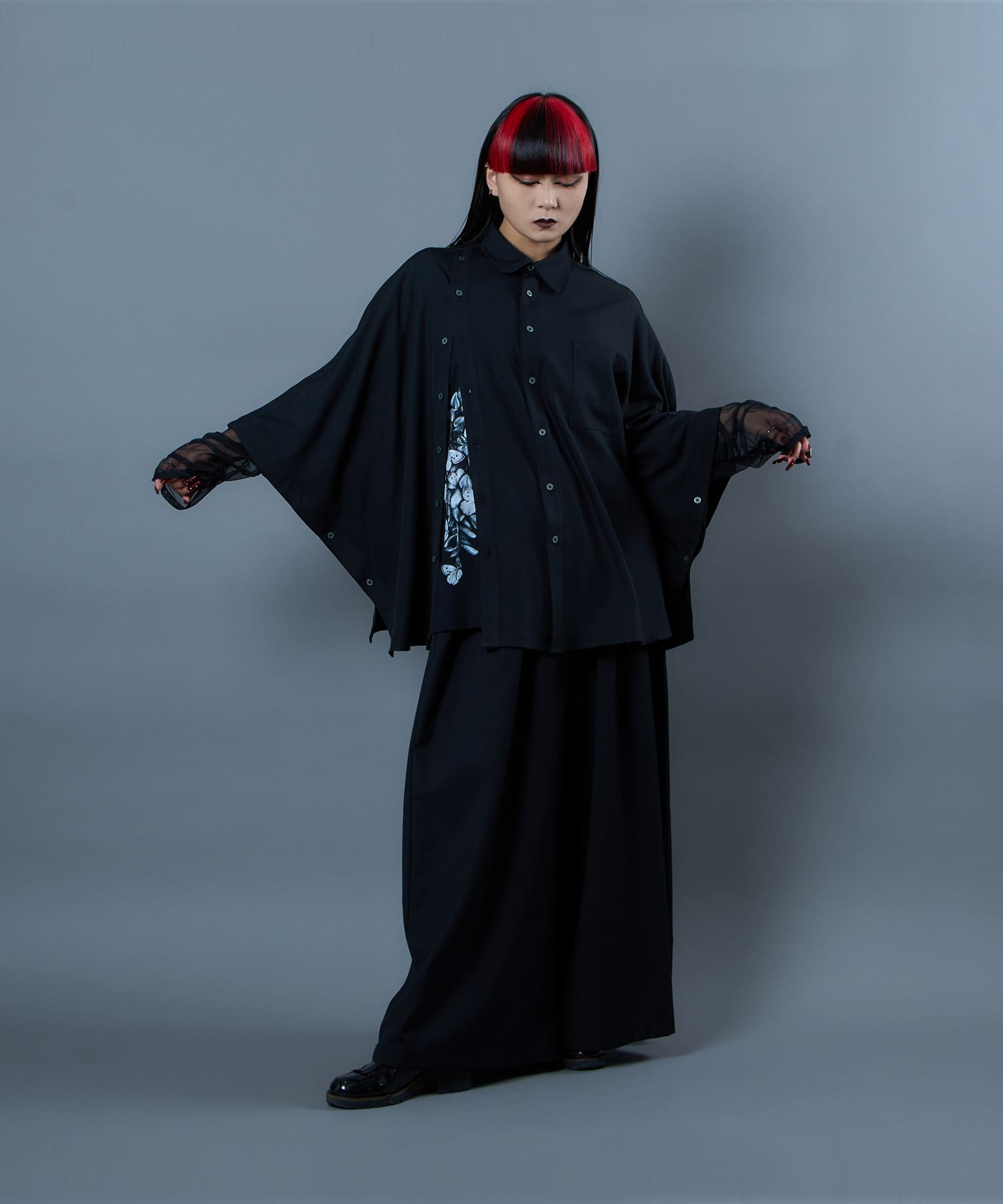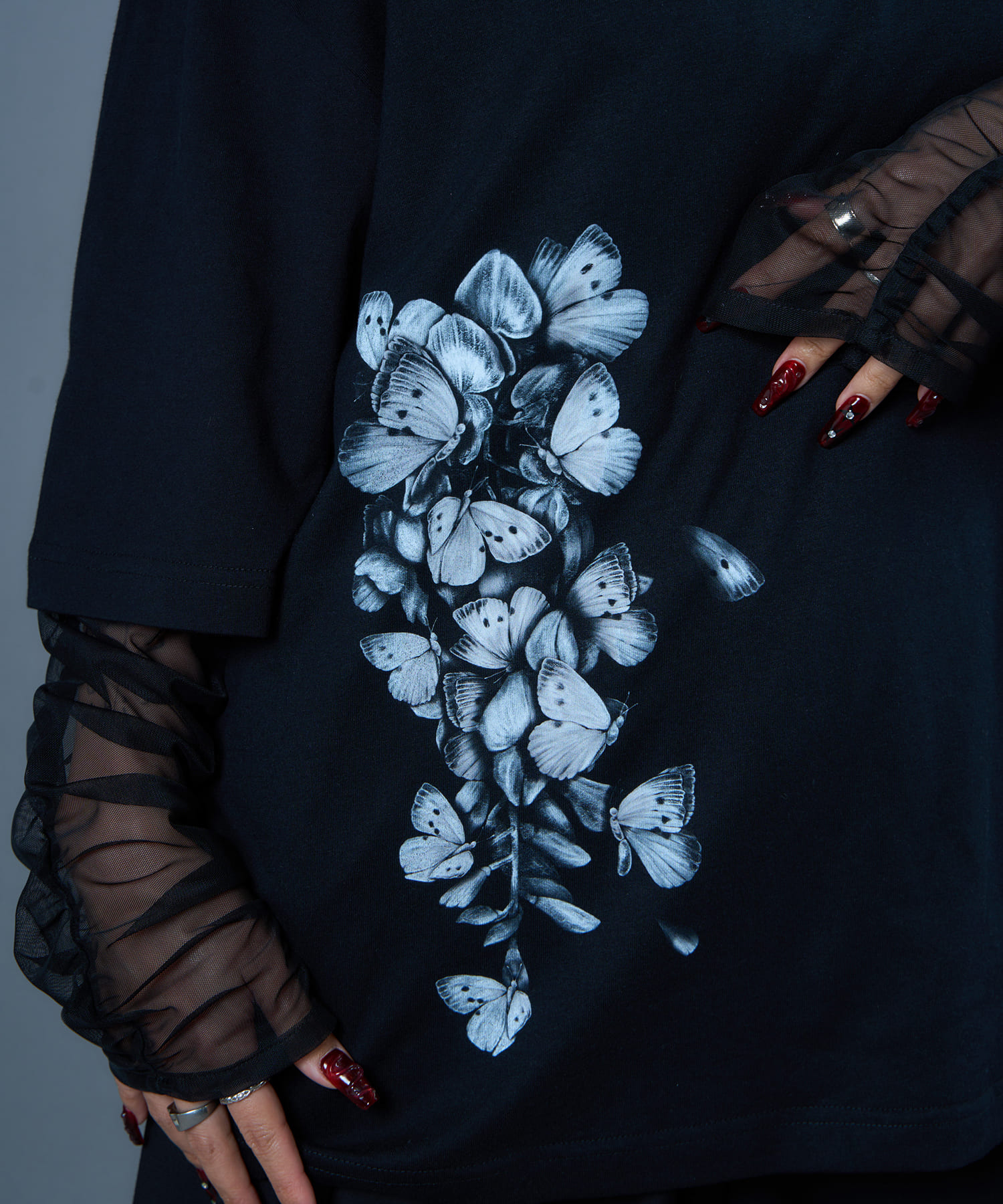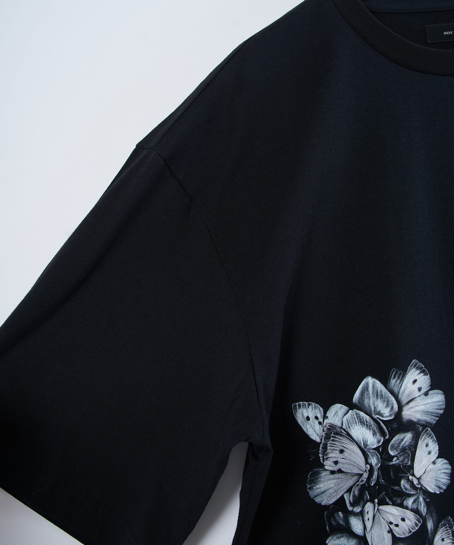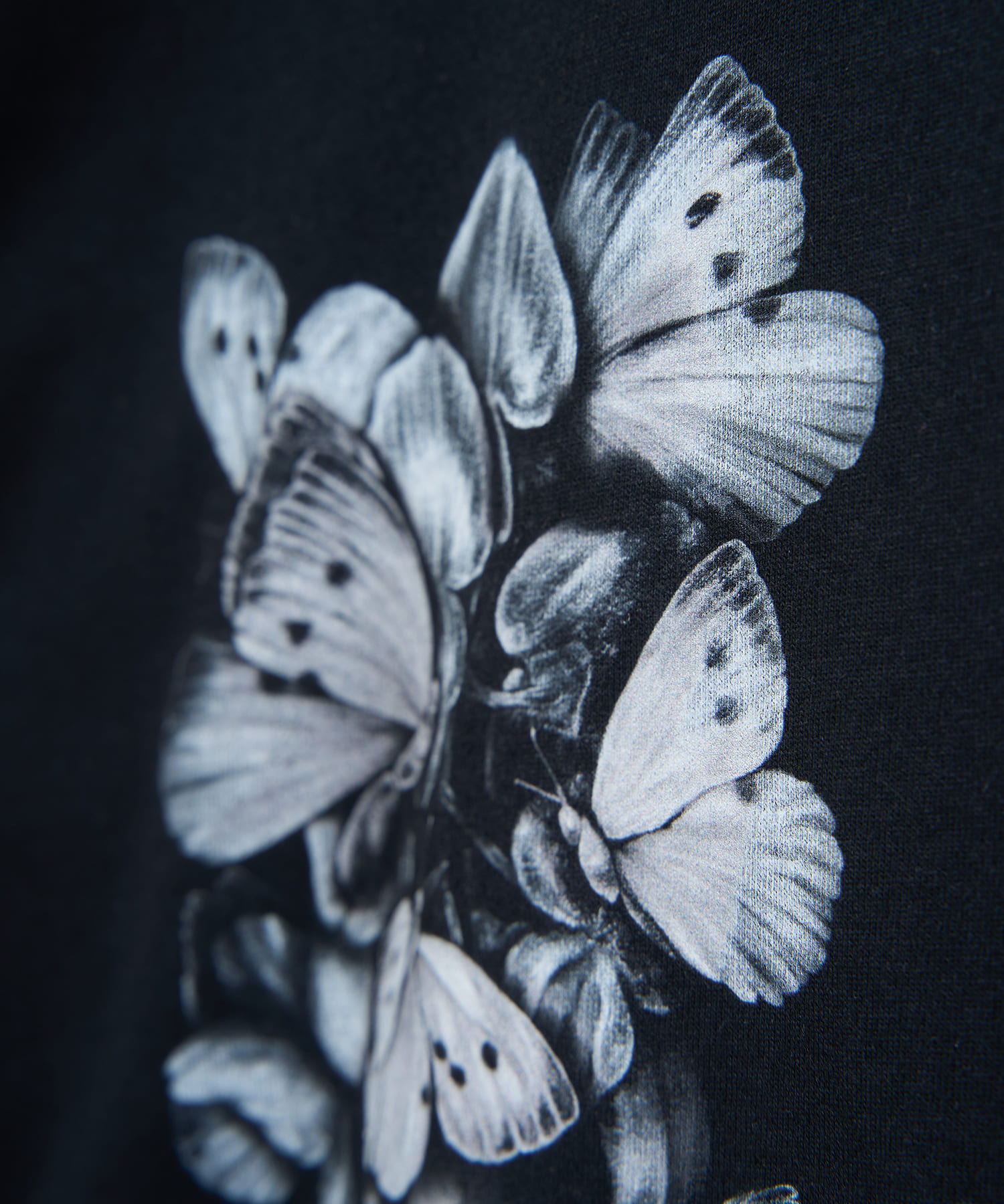 ゆったりとしたサイズ感と柔らかく肌触りの良い素材を使用した蝶々藤TEE。コットン100%の天然素材を使用しておりイージーケアなアイテムとなっております。藤と蝶をモチーフに仕上げられたグラフィックは、儚げな美を表現しつつも、どこか奇妙さを感じられる仕上がりです。裾に施された大判プリントが目を引く一枚で、単体でもレイヤードでもお楽しみいただけるアイテムとなっております。