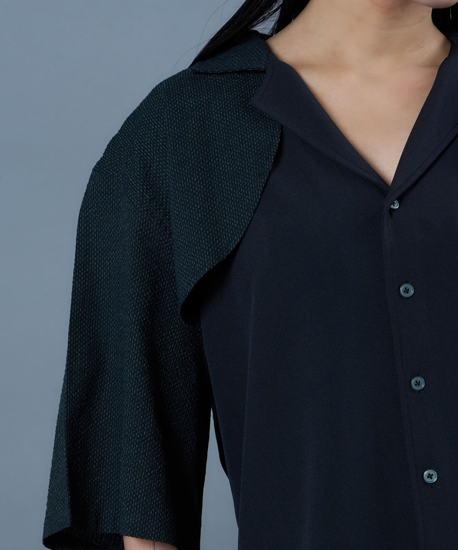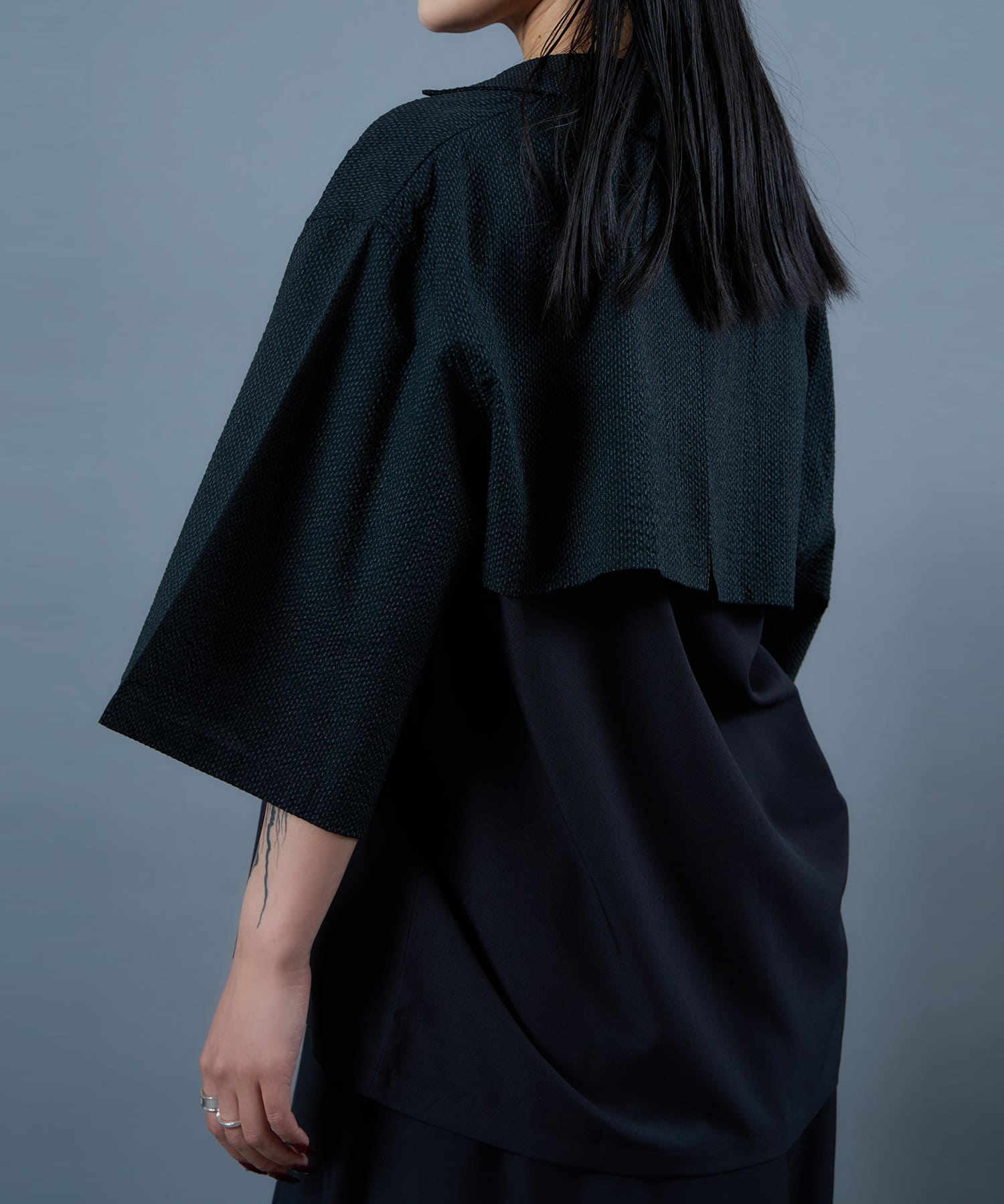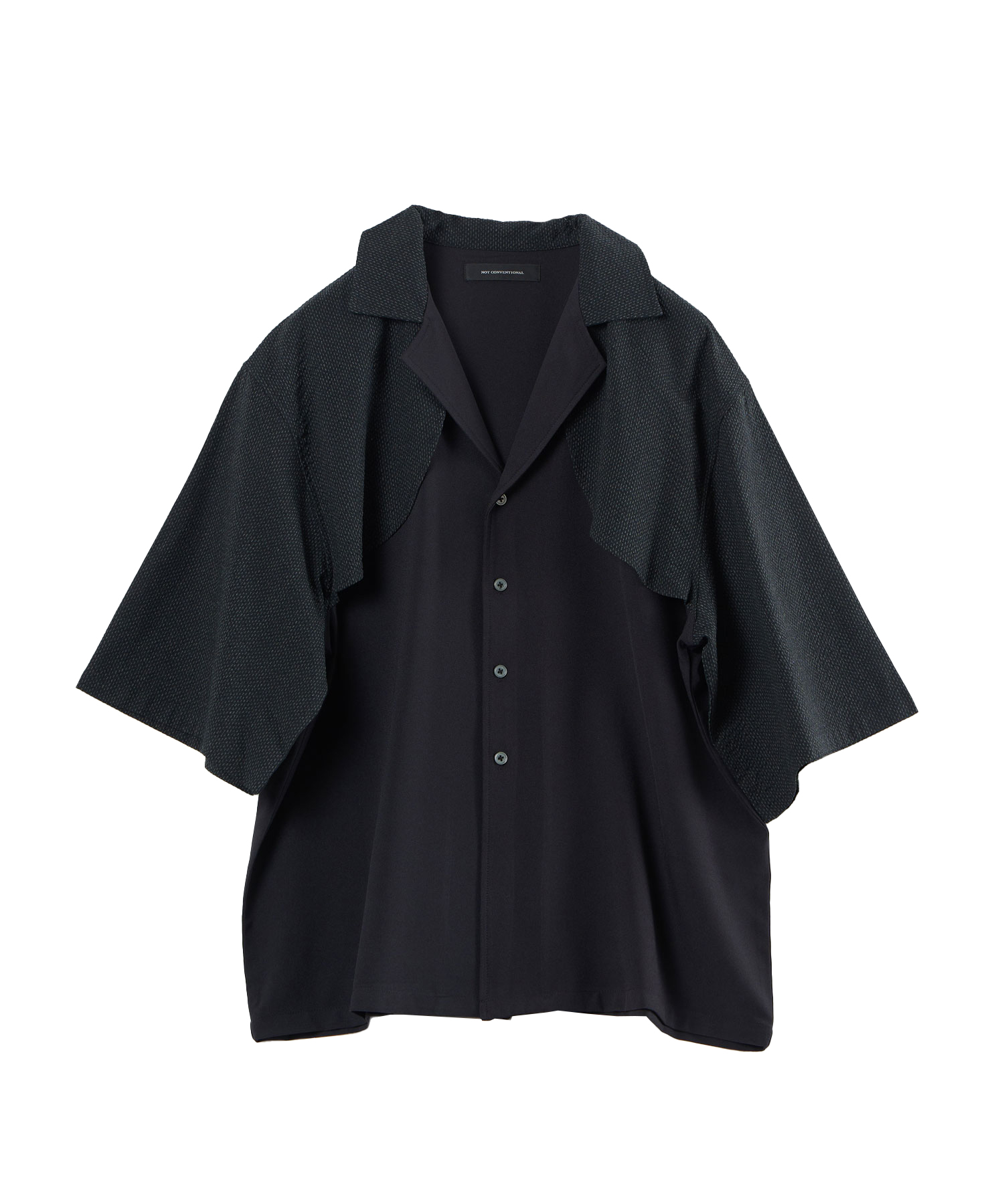 オリジナルジョーゼット生地を使用したフラップデザインオープンカラーシャツ。綺麗なドレープ性があり、軽くて肌触りがよく着心地の良いシャリ感が特徴の生地です。フラップ部分にはワッフル生地を使用し、シンプルながらも変化のあるスタイルに仕上げています。オーバーなサイズ設定で通気性も良い為、透け感のある素材とのレイヤードもお楽しみいただけます。