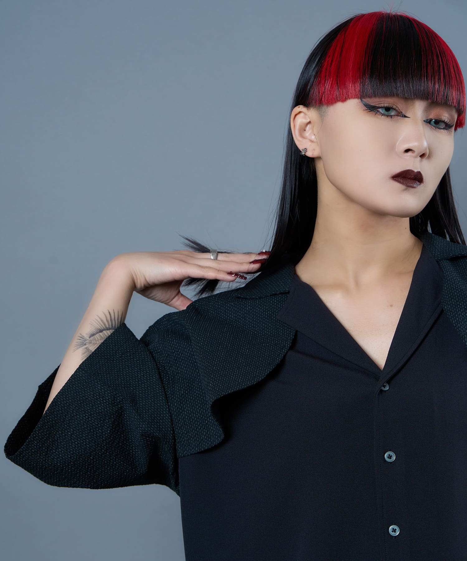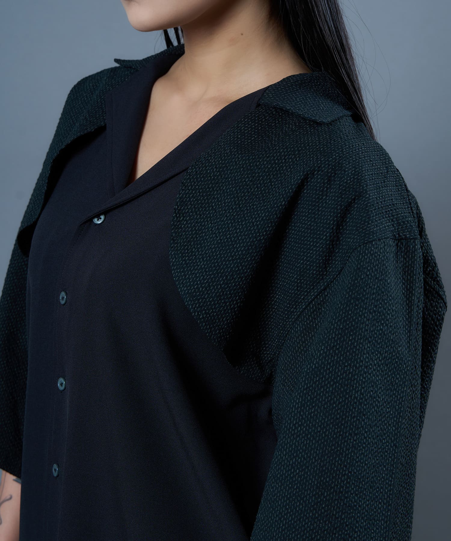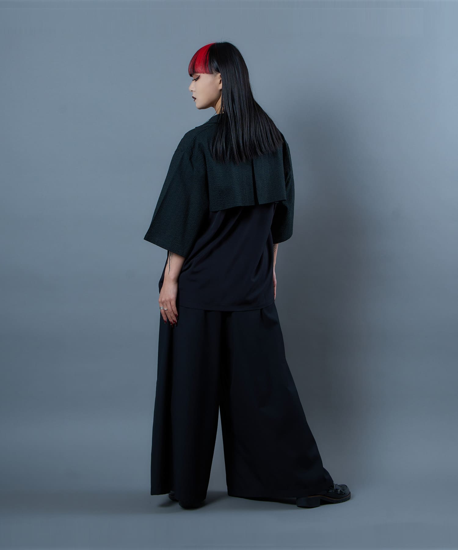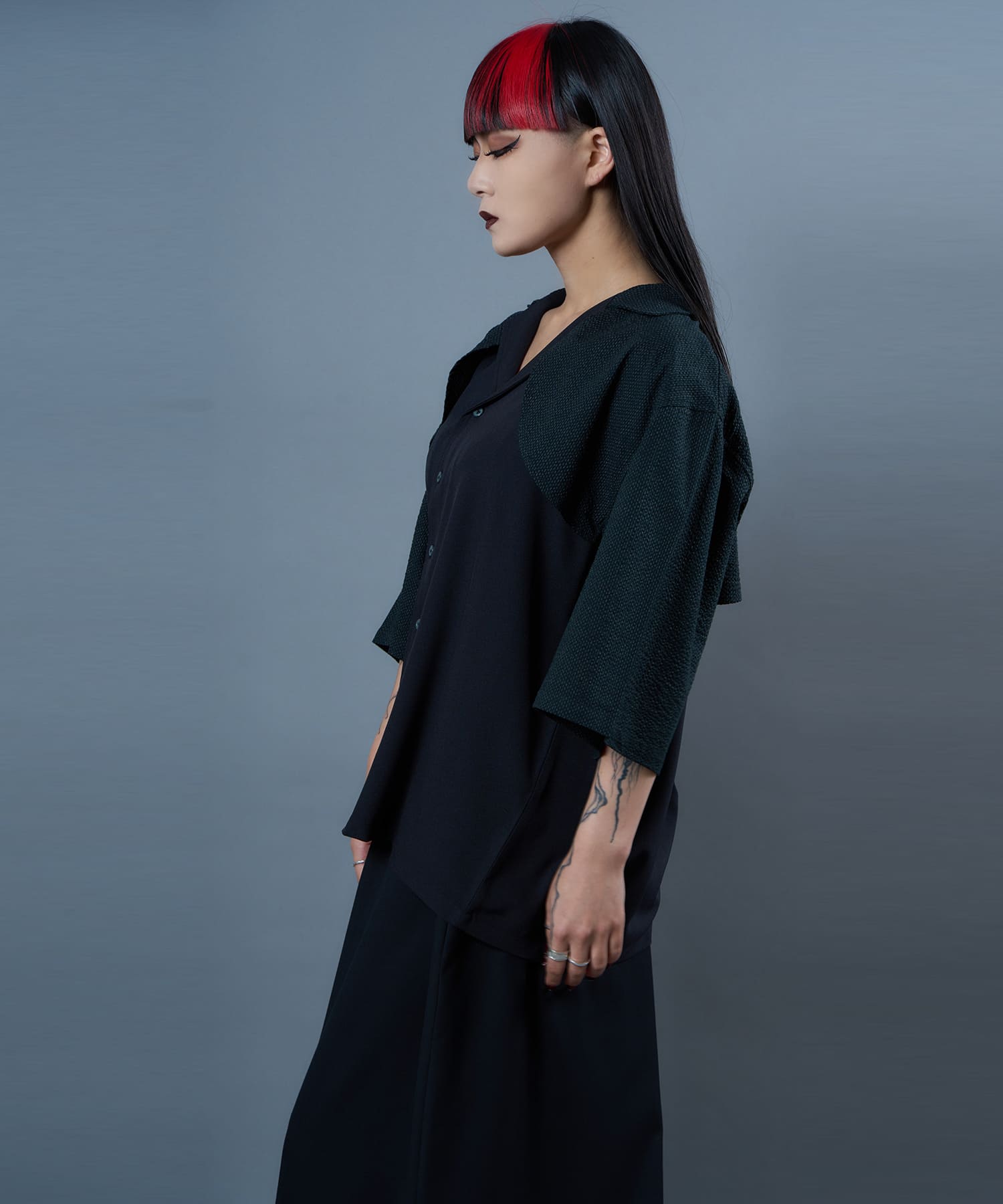 オリジナルジョーゼット生地を使用したフラップデザインオープンカラーシャツ。綺麗なドレープ性があり、軽くて肌触りがよく着心地の良いシャリ感が特徴の生地です。フラップ部分にはワッフル生地を使用し、シンプルながらも変化のあるスタイルに仕上げています。オーバーなサイズ設定で通気性も良い為、透け感のある素材とのレイヤードもお楽しみいただけます。