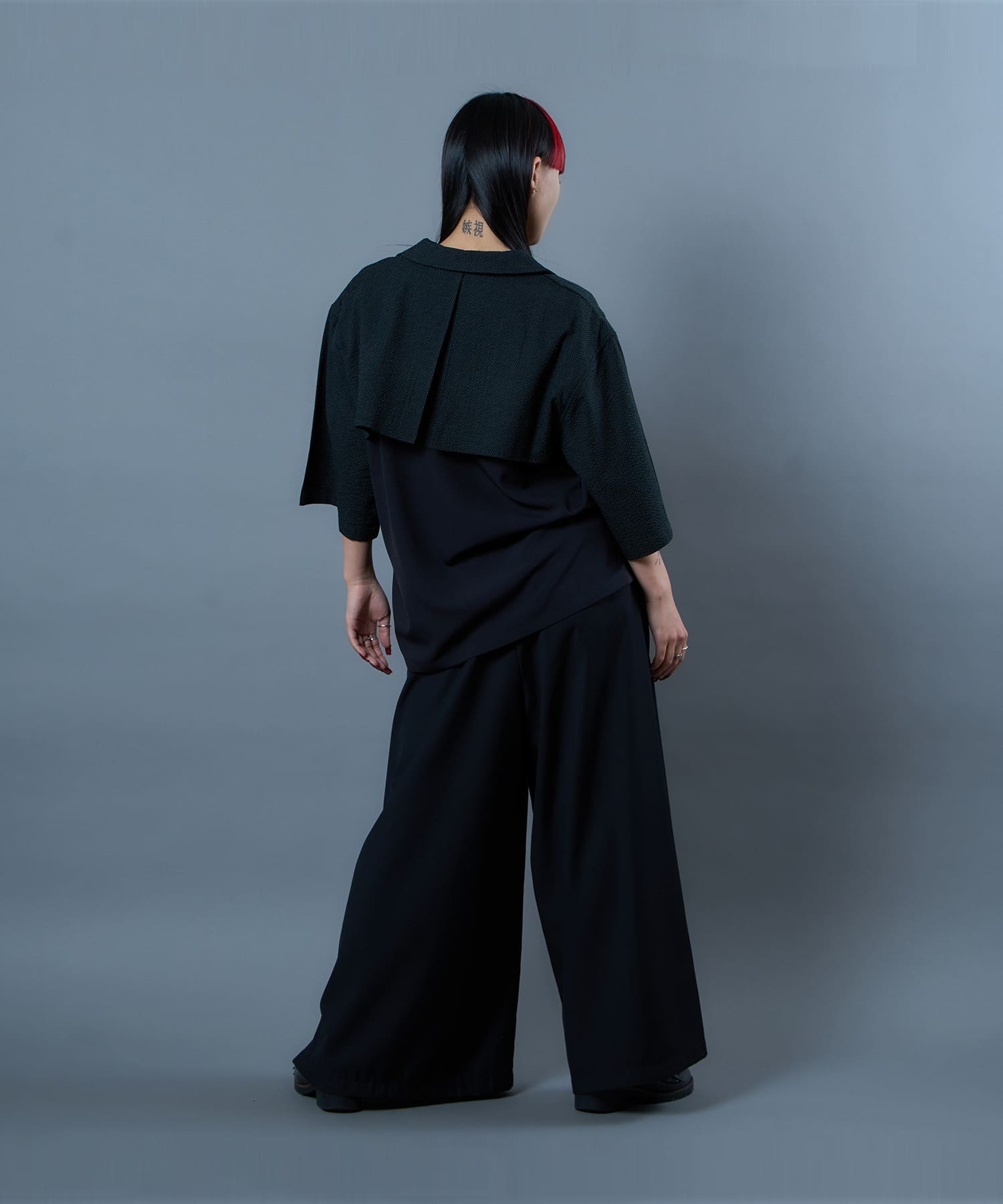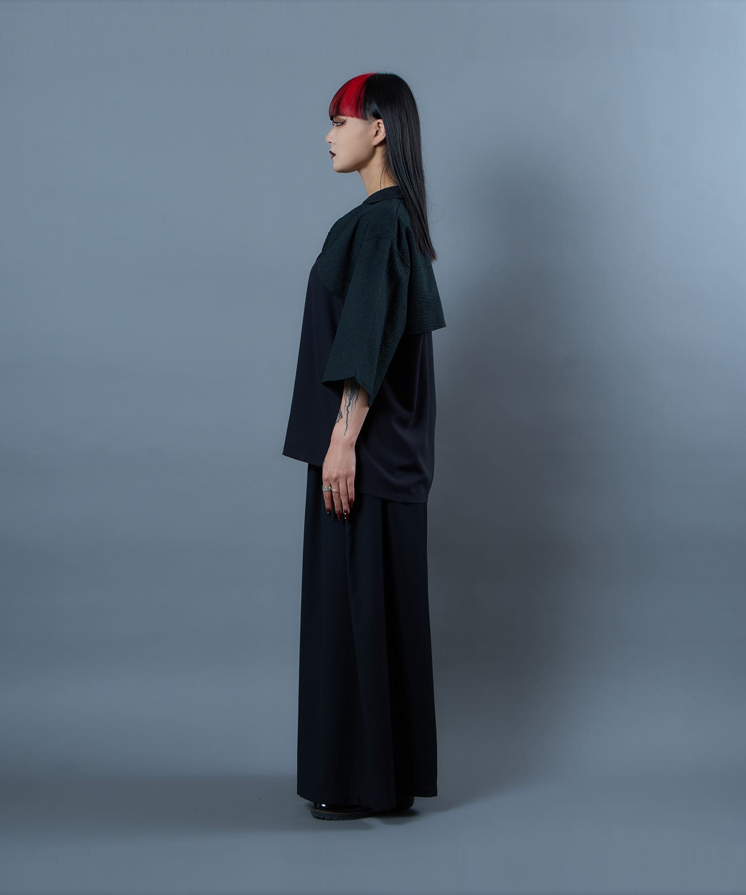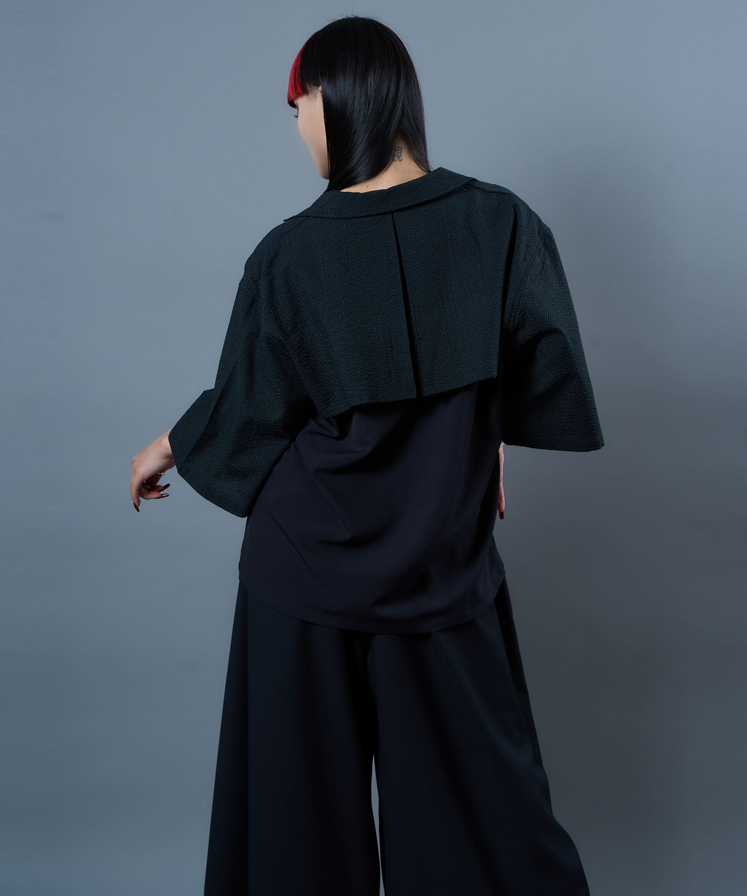 Flap design open collar shirt made of original georgette fabric. This fabric has a beautiful drape and is lightweight, pleasant to the touch, and comfortable to wear with a crisp feel. Waffle fabric is used for the flap portion, creating a simple yet varied style. The oversized and breathable design allows you to enjoy layering with transparent materials.