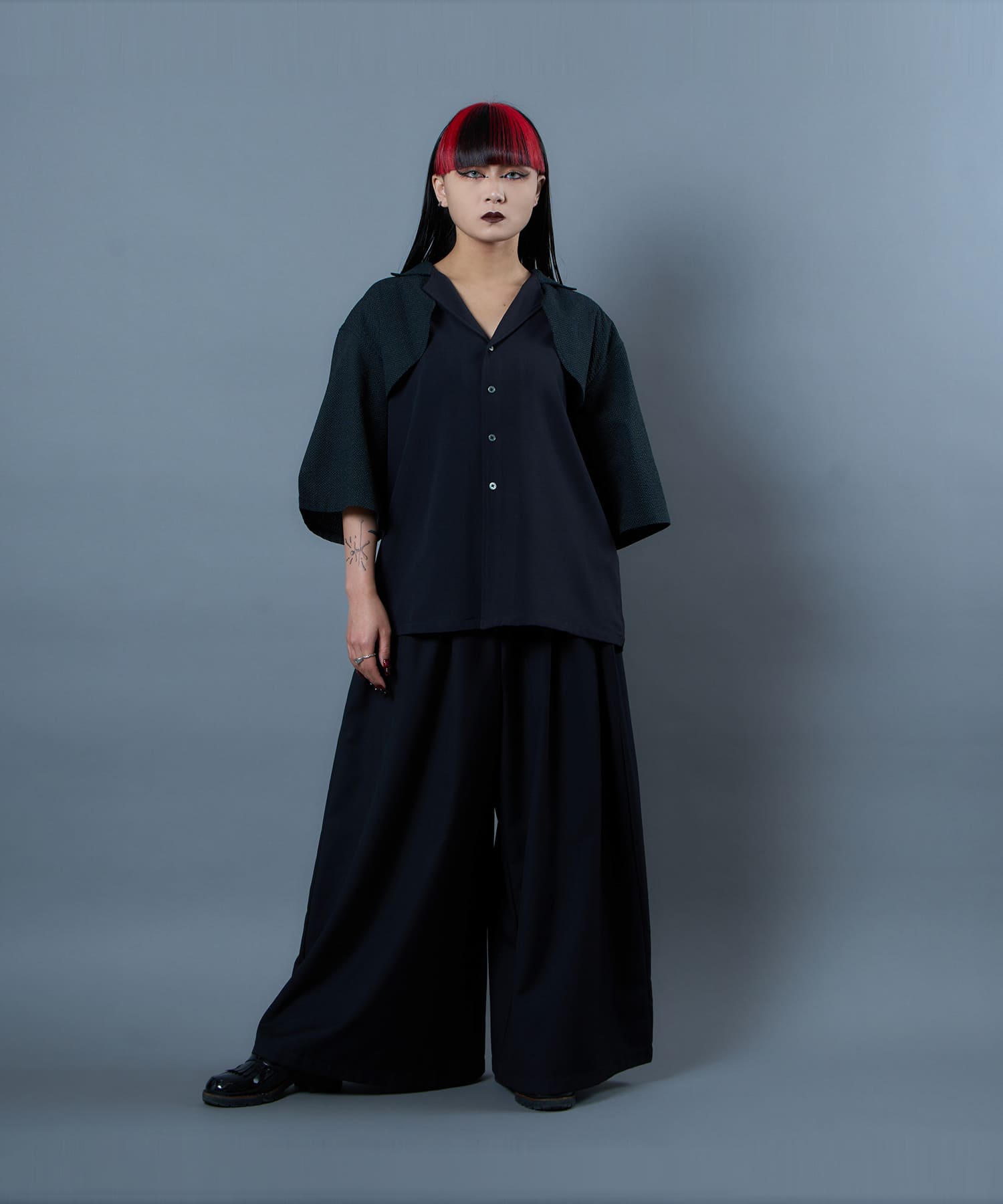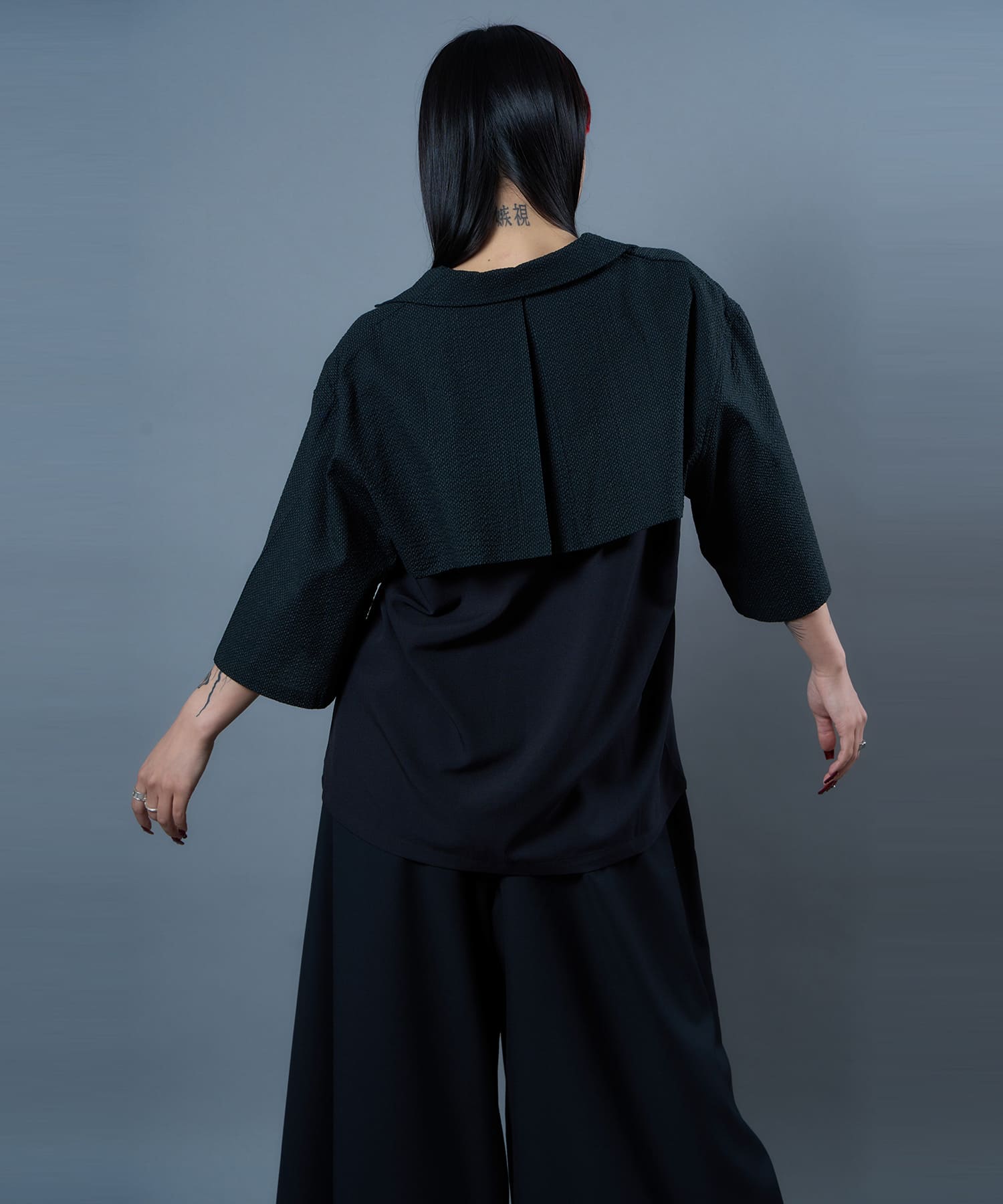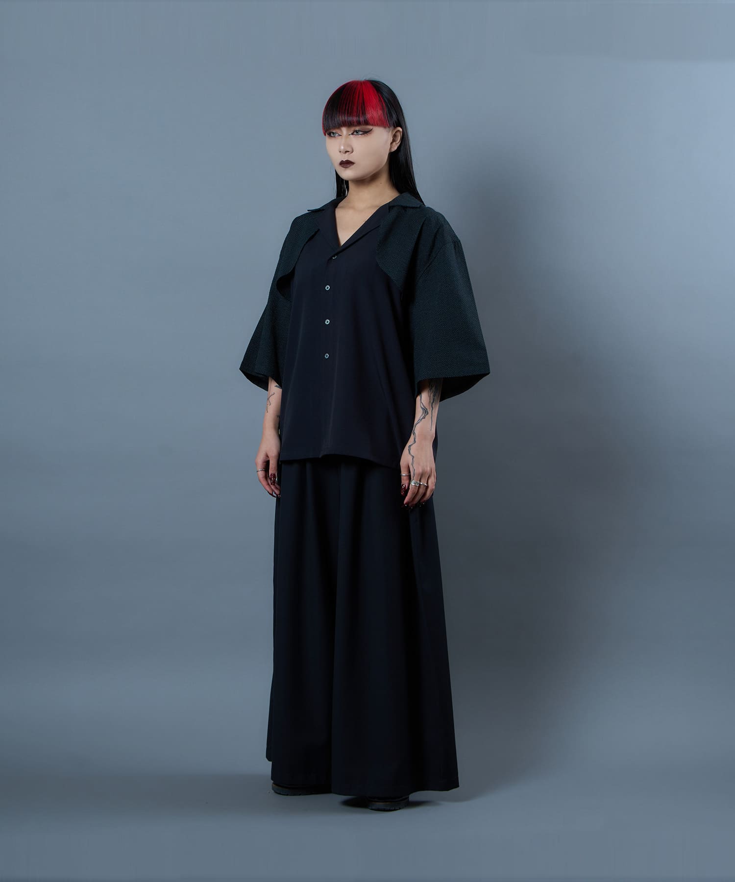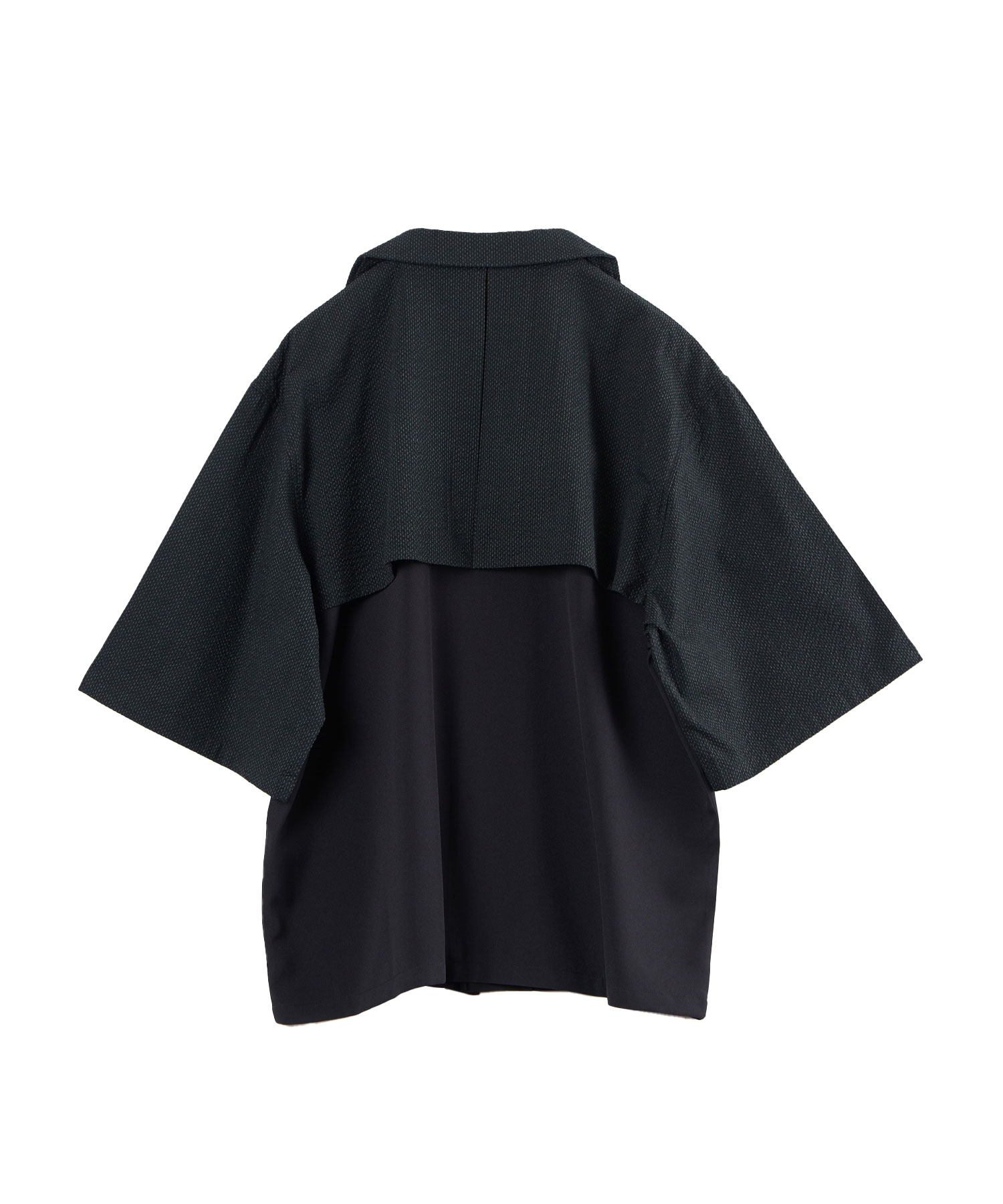 Flap design open collar shirt made of original georgette fabric. This fabric has a beautiful drape and is lightweight, pleasant to the touch, and comfortable to wear with a crisp feel. Waffle fabric is used for the flap portion, creating a simple yet varied style. The oversized and breathable design allows you to enjoy layering with transparent materials.