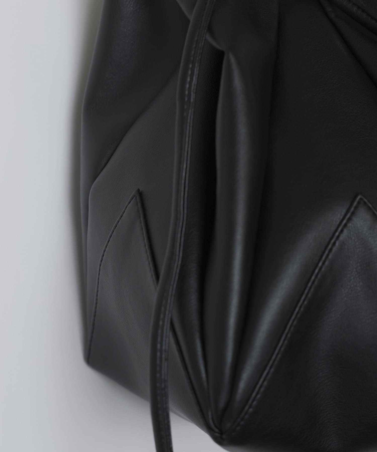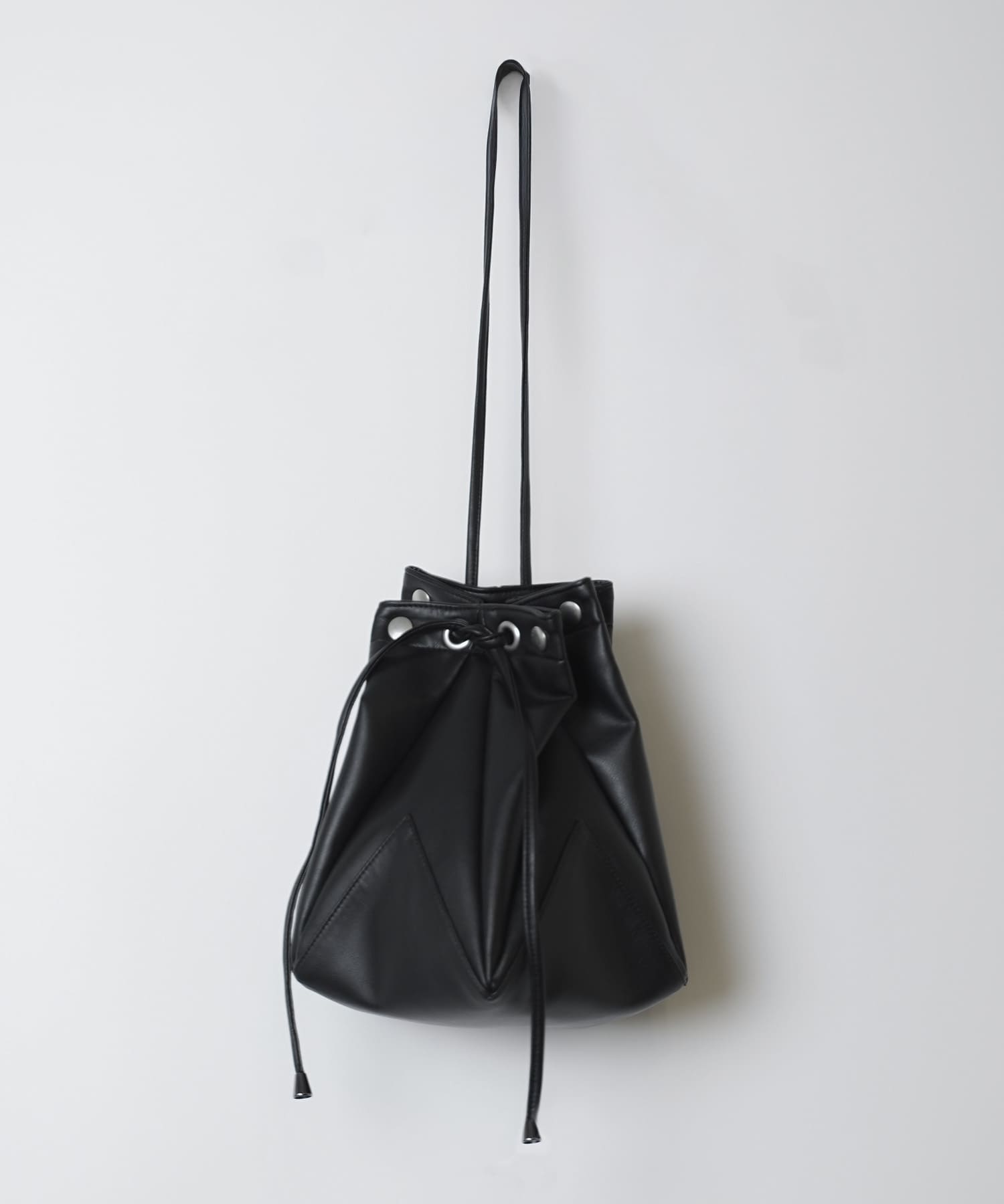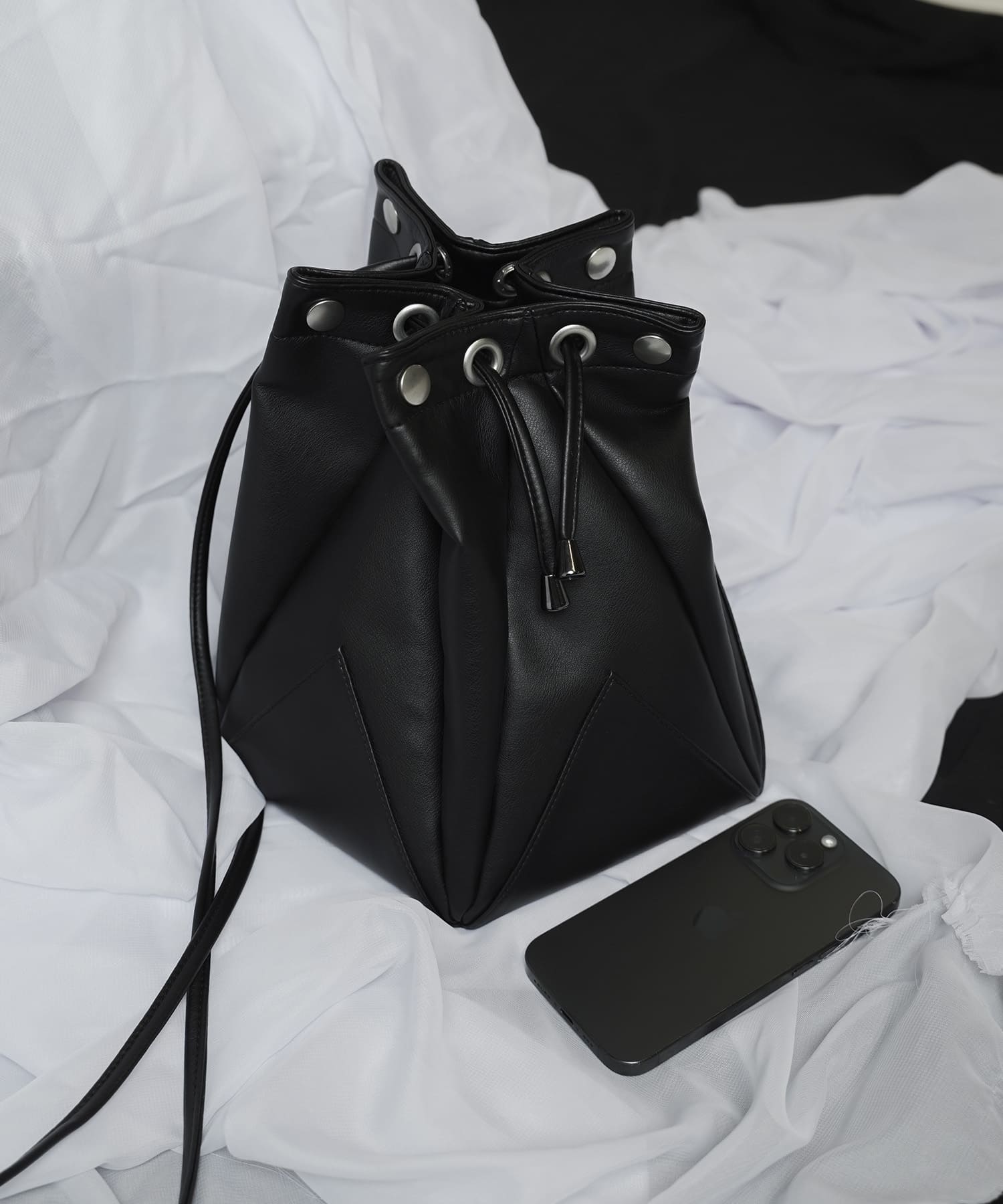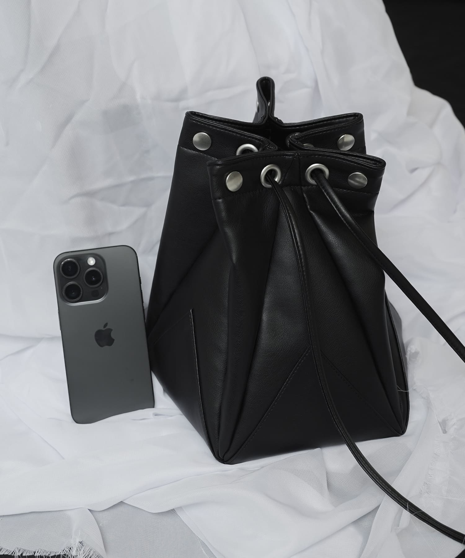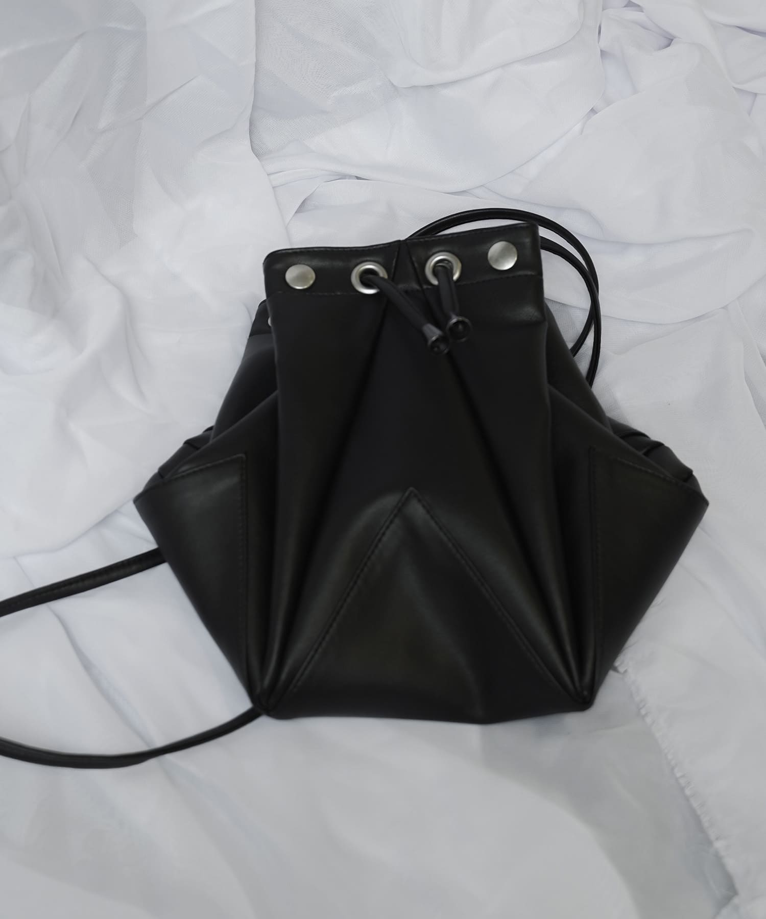 折り紙から着想を得たディテールを取り入れ、多面的な巾着風のバッグに仕上げました。