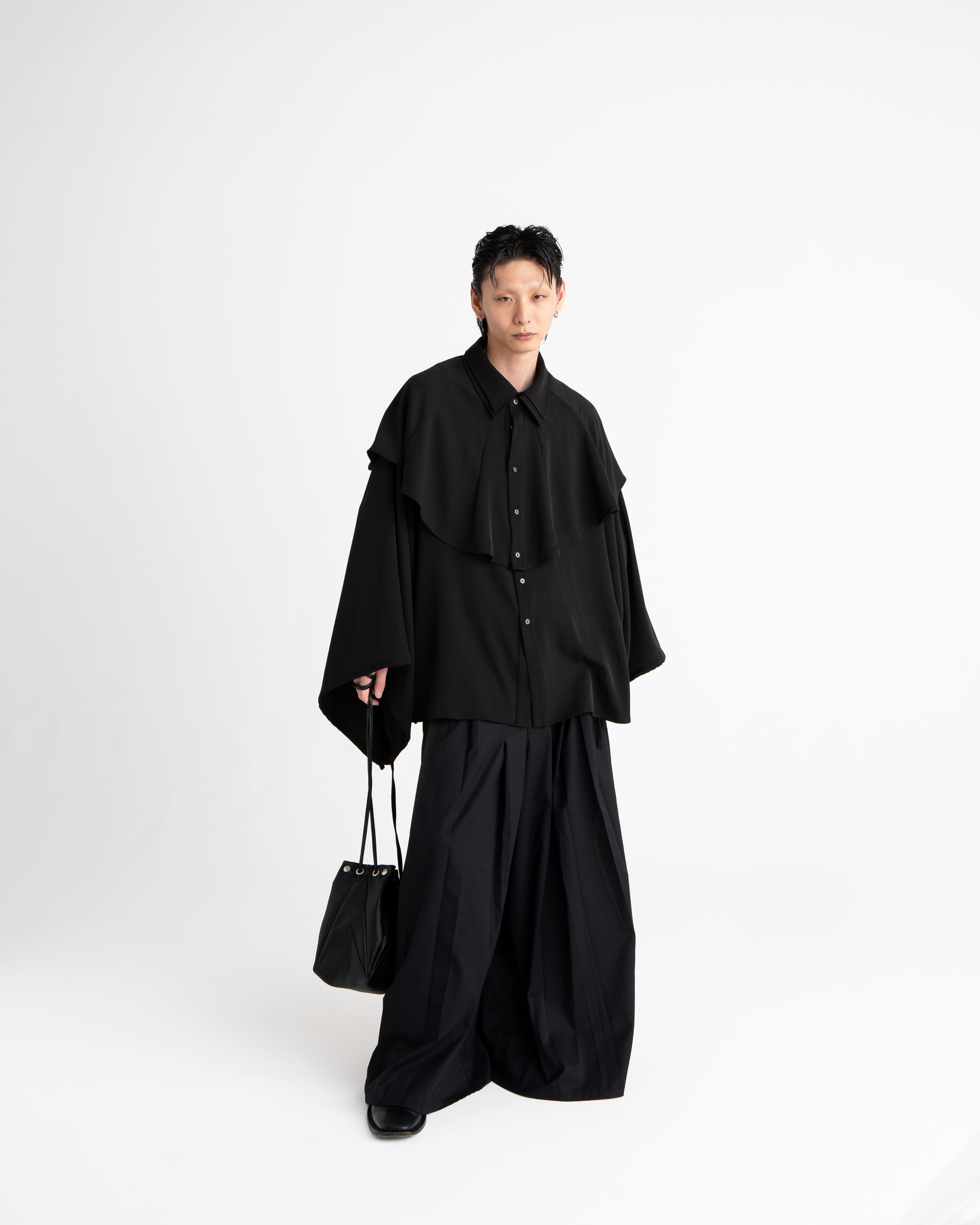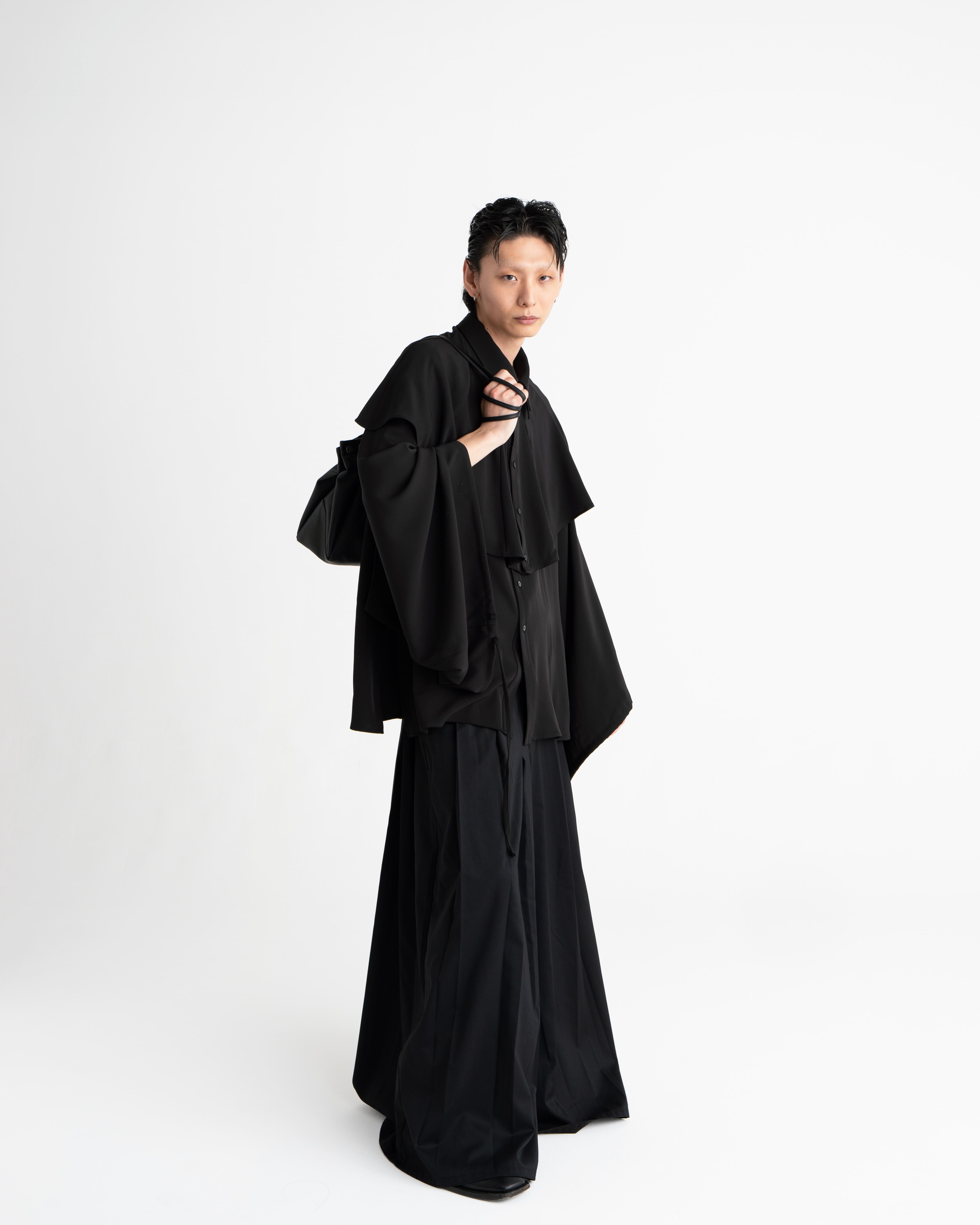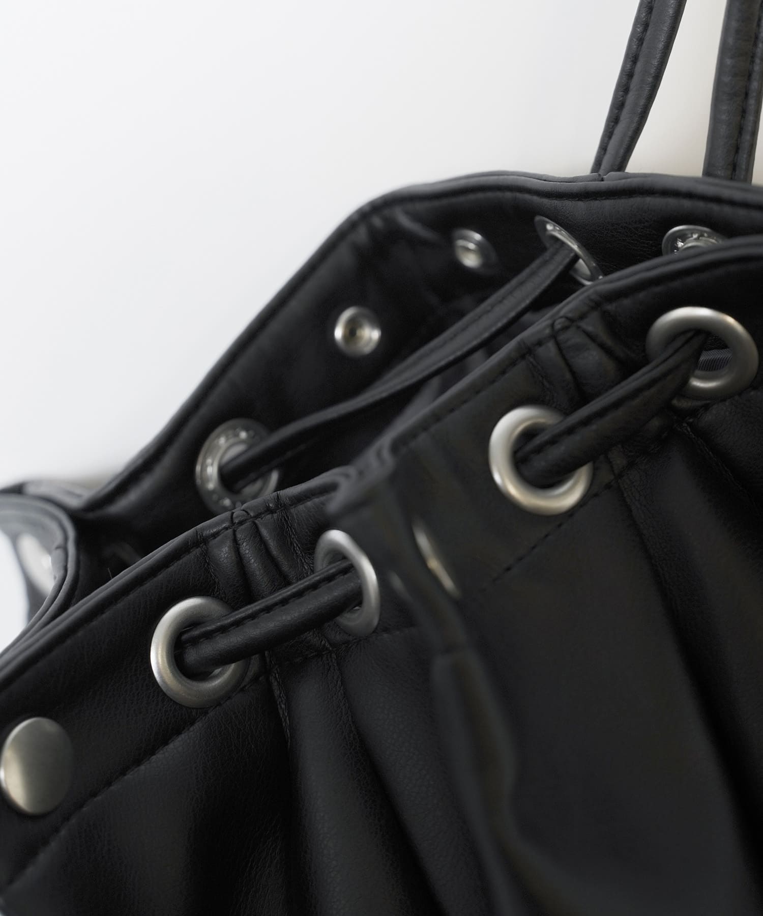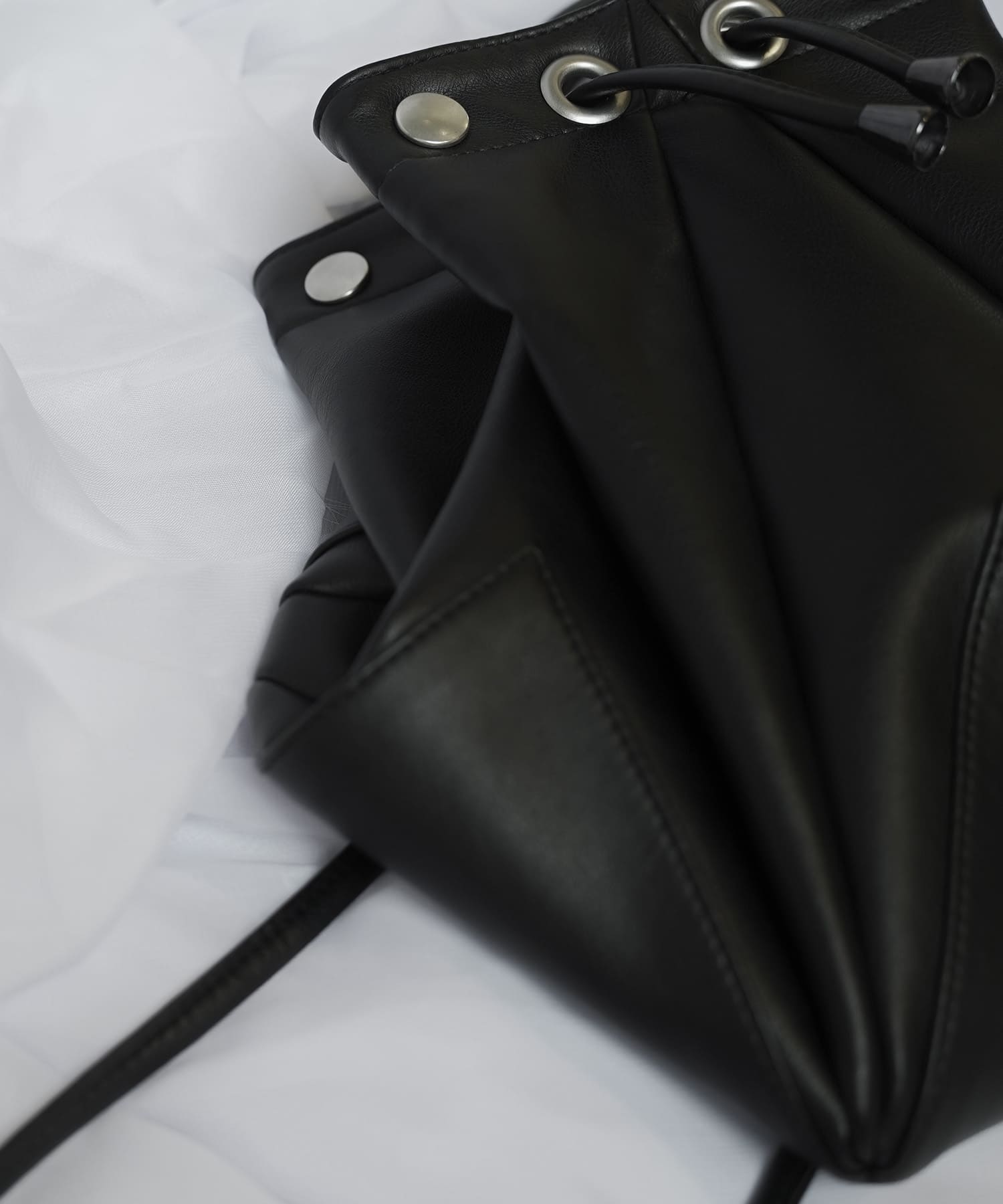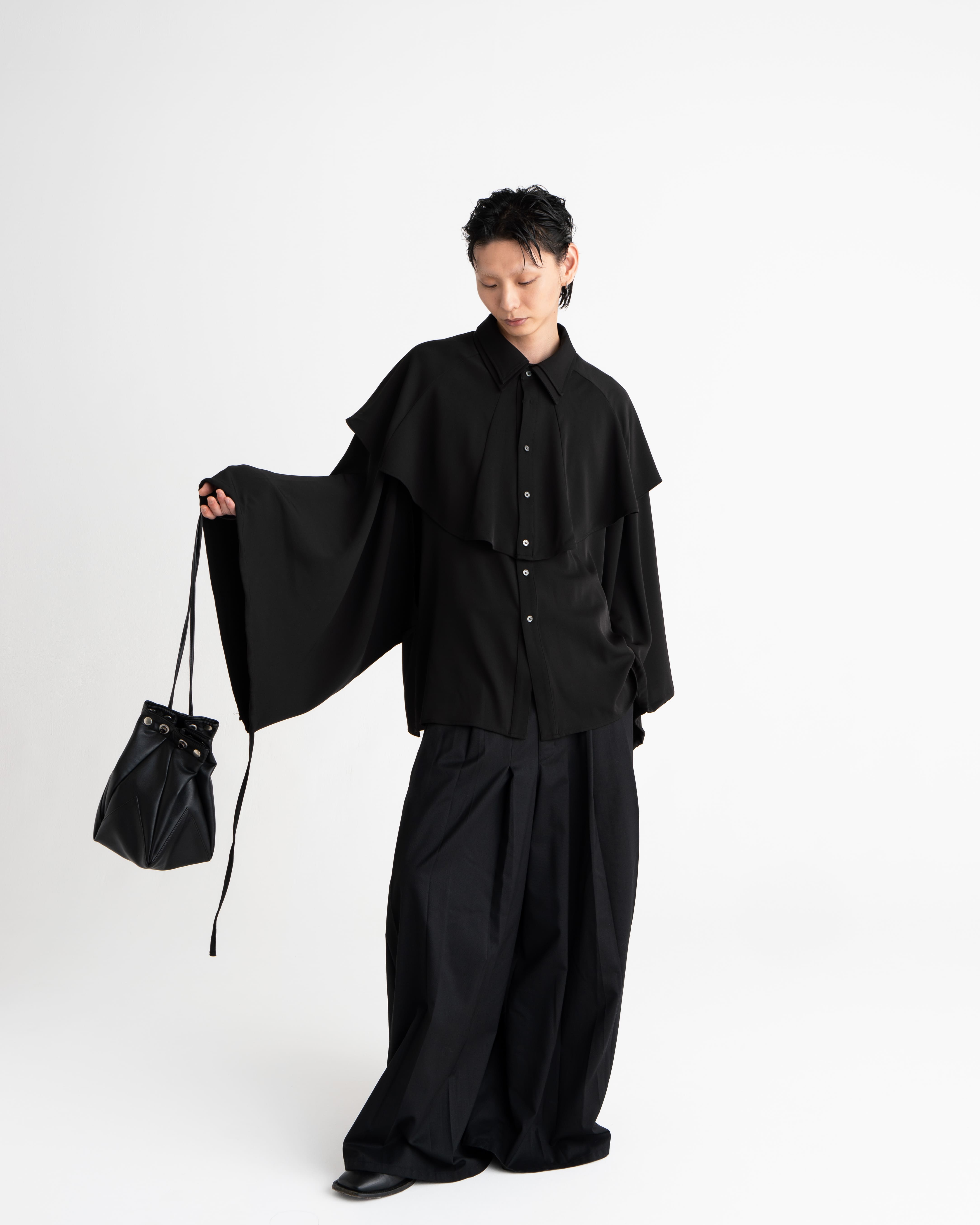 折り紙から着想を得たディテールを取り入れ、多面的な巾着風のバッグに仕上げました。