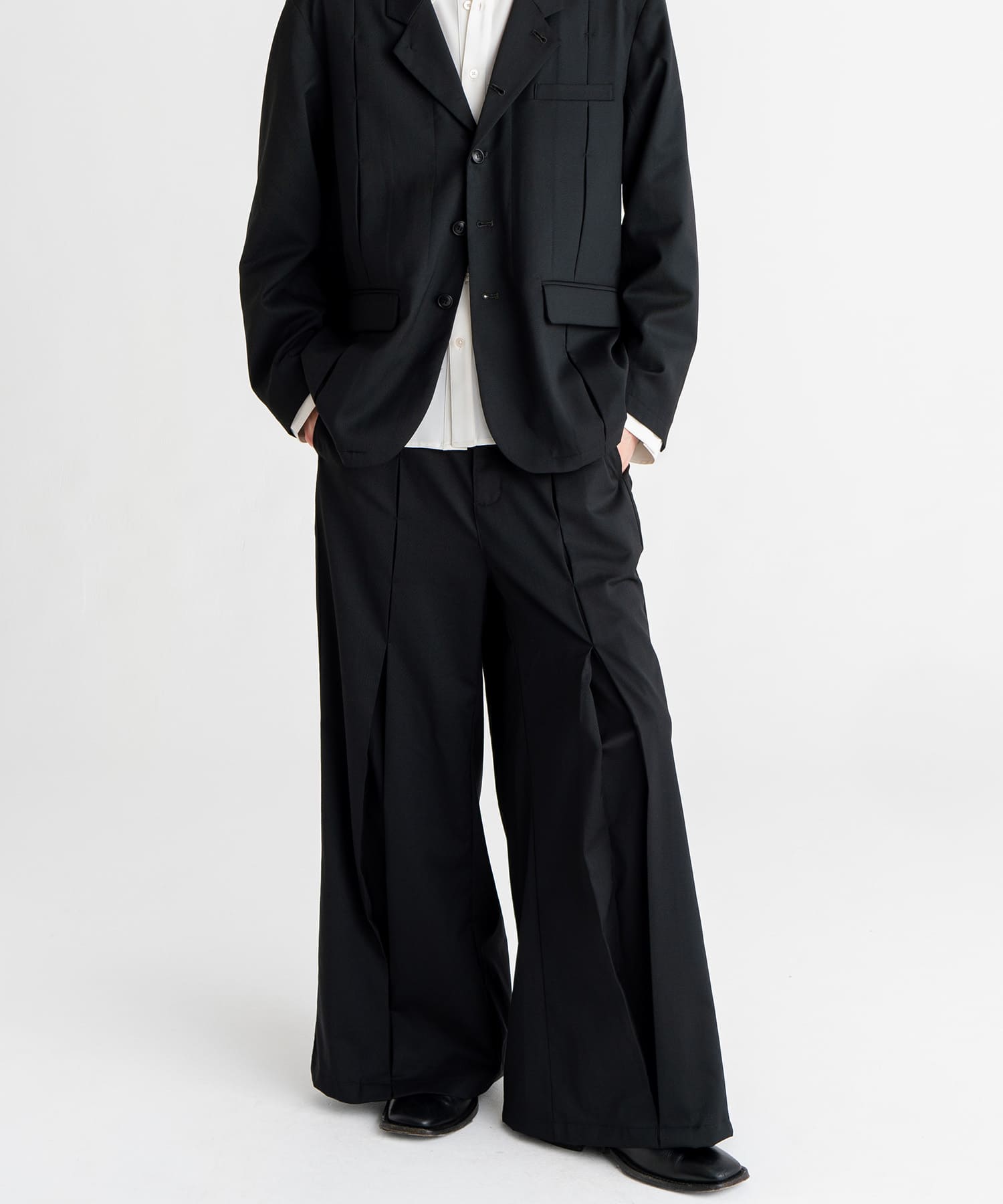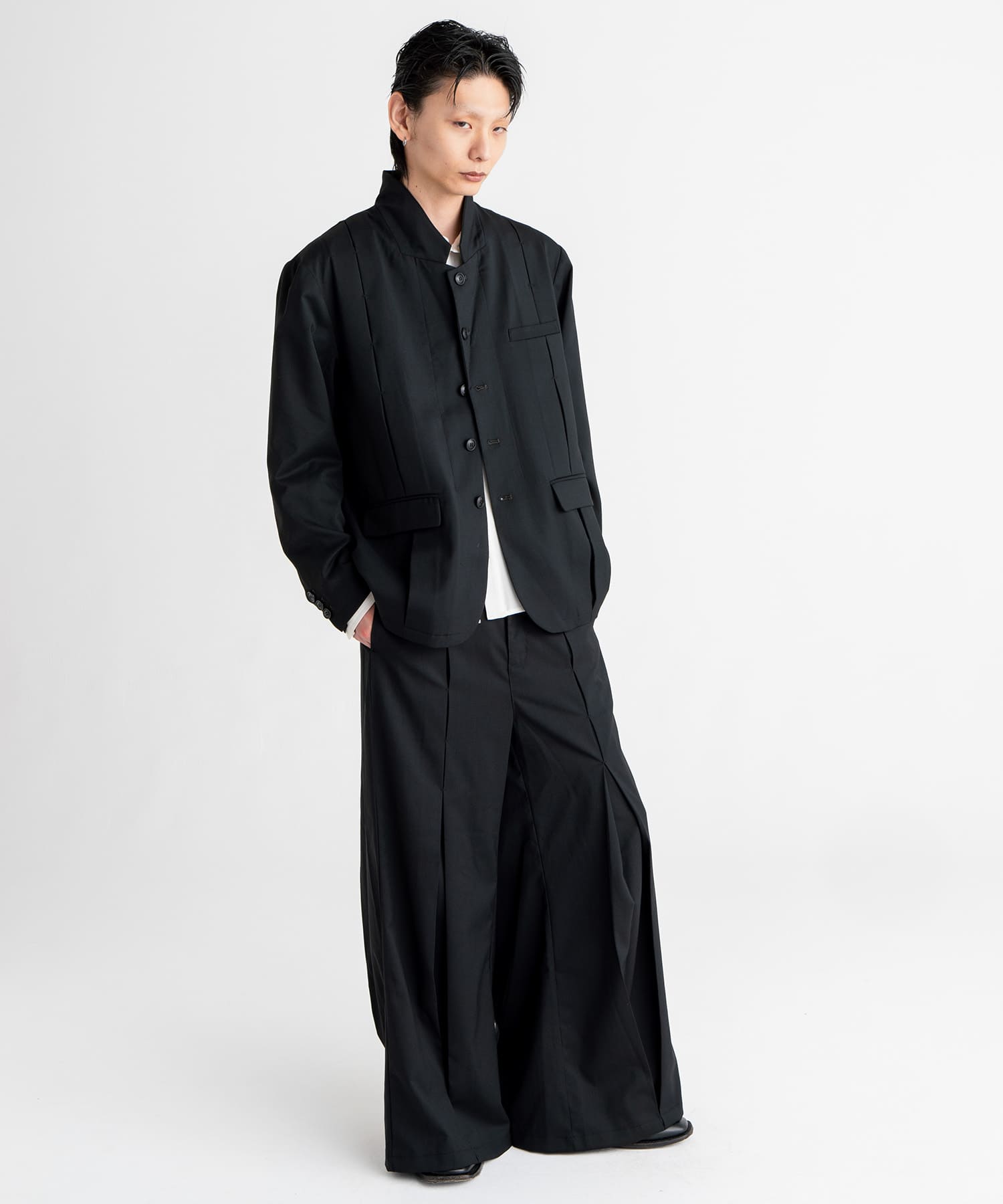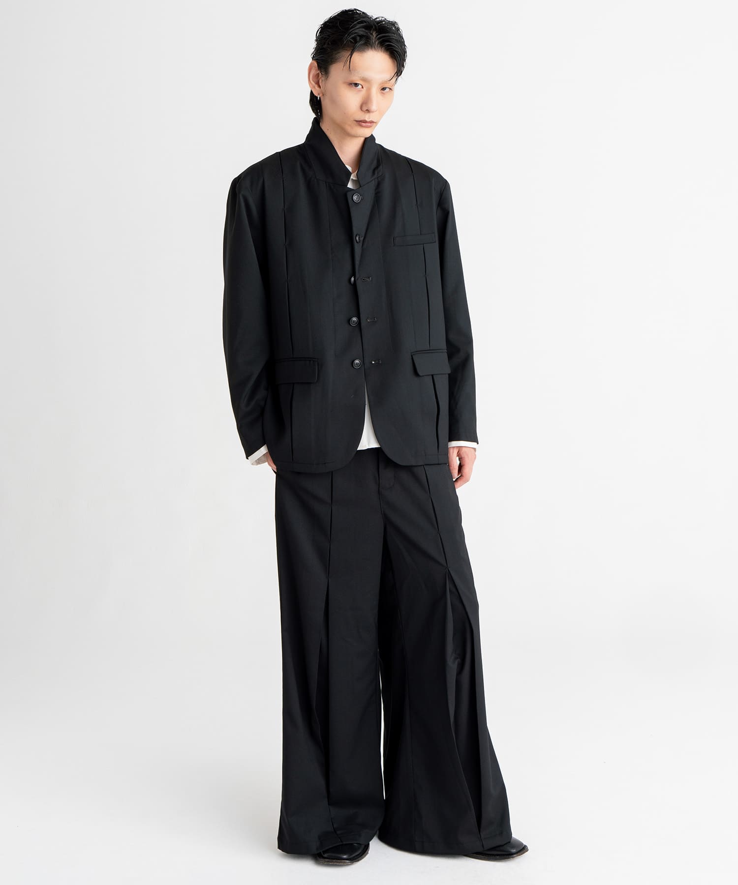 フロントとバックの中心に大きく入れたタックを閂止めで留め、着用者の動きに合わせてシルエットが変化する仕様となっております。