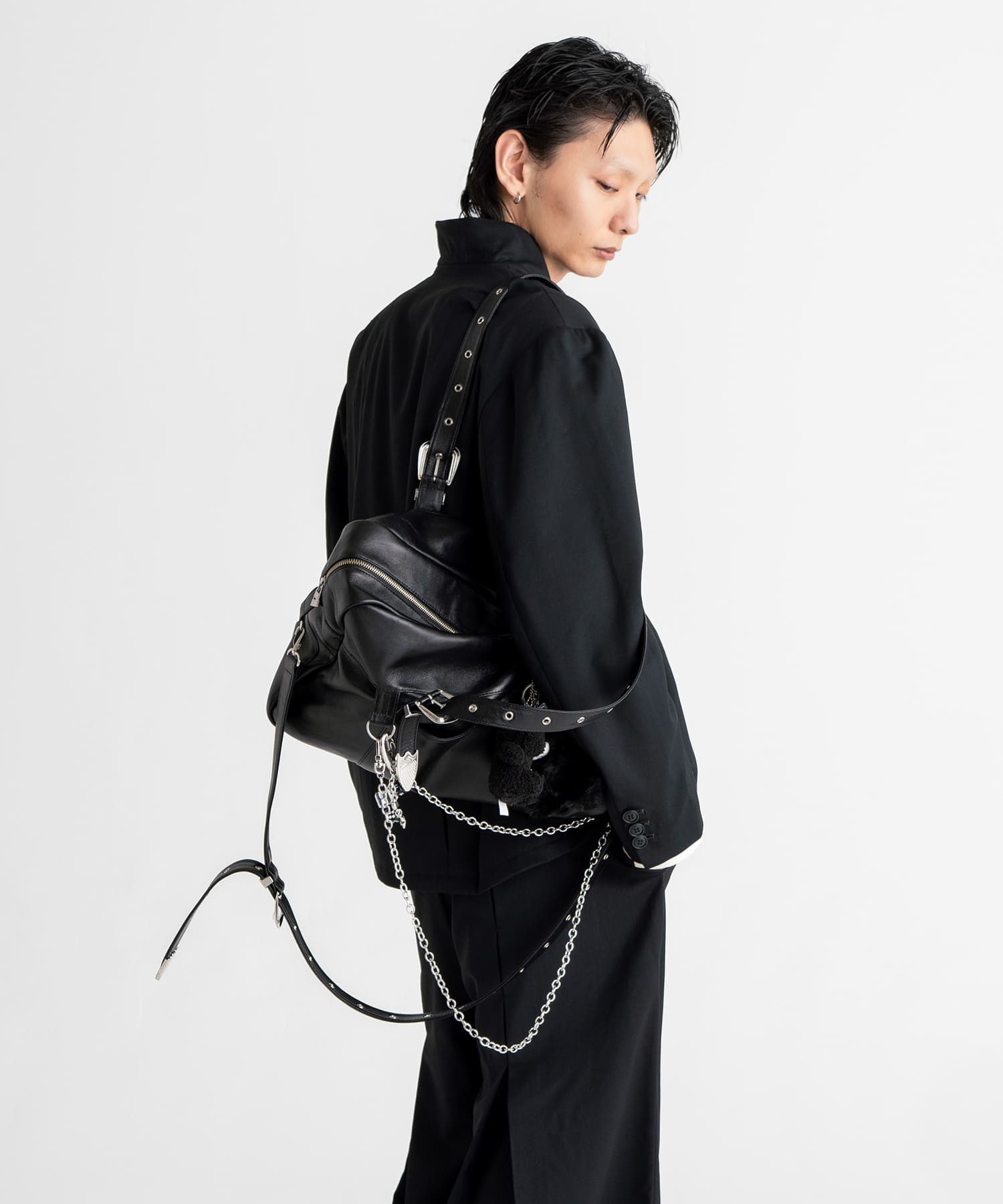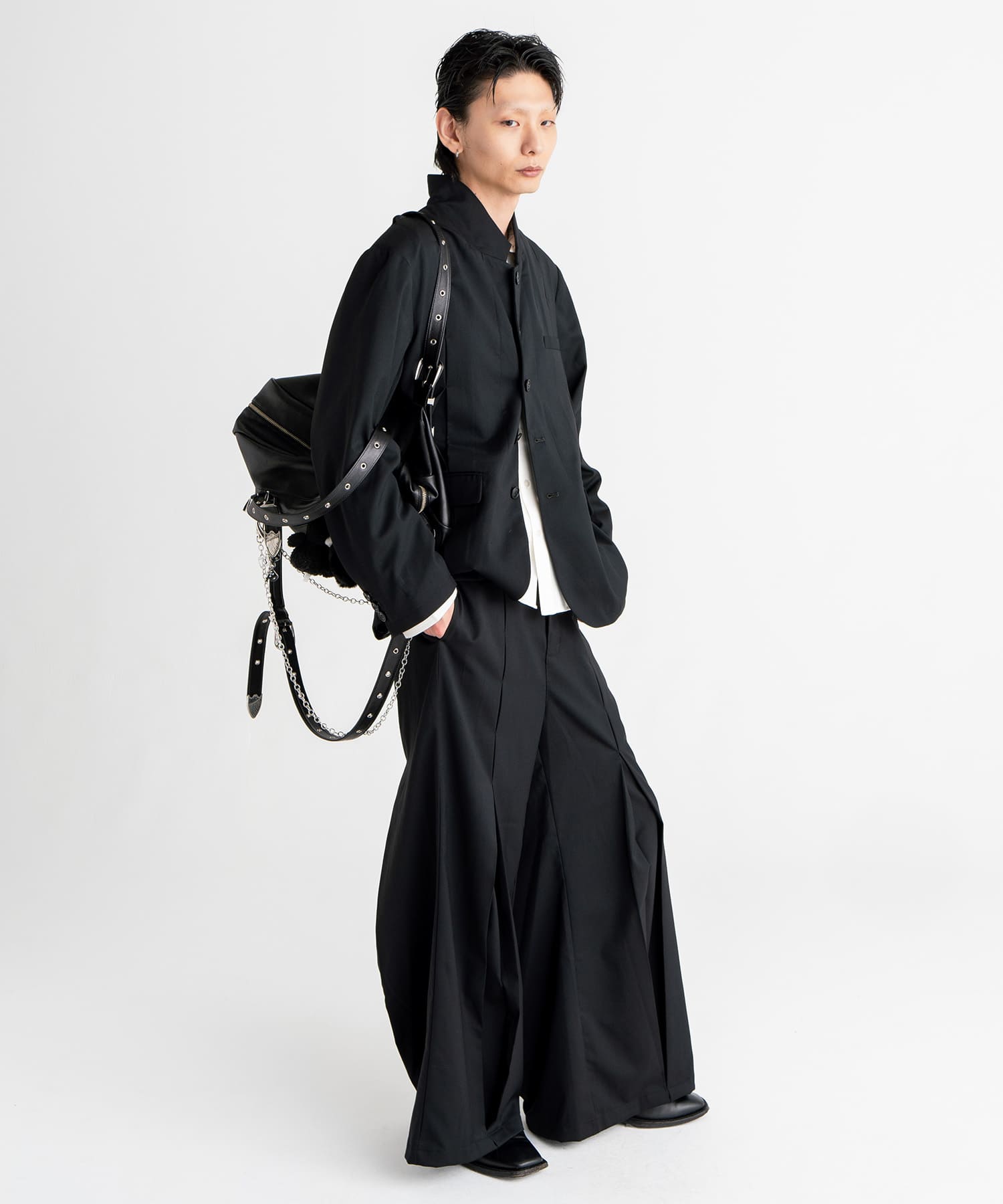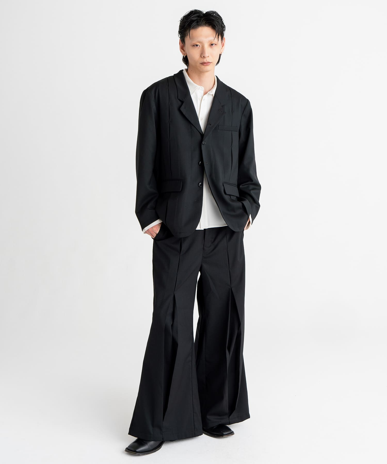 フロントとバックの中心に大きく入れたタックを閂止めで留め、着用者の動きに合わせてシルエットが変化する仕様となっております。
