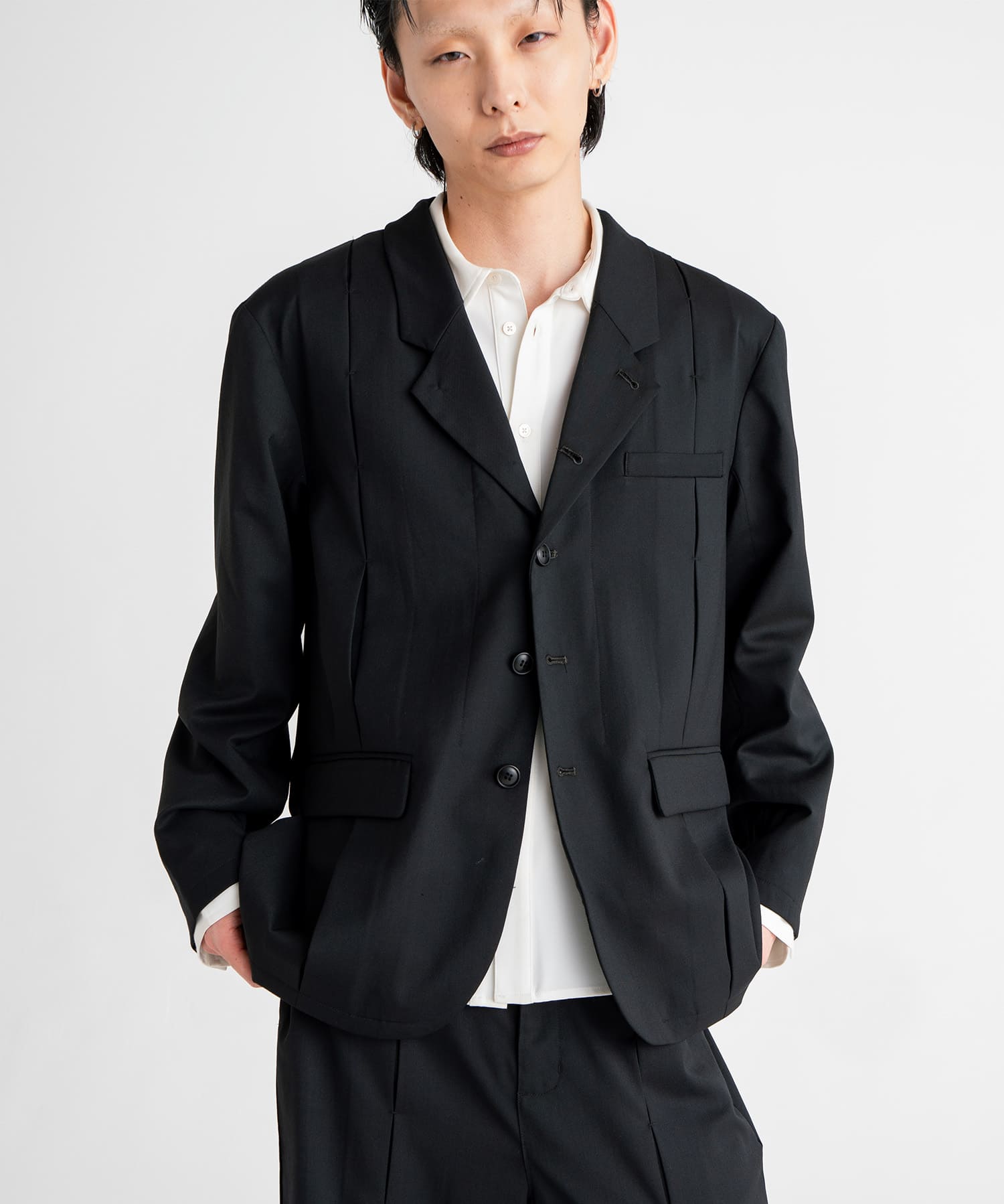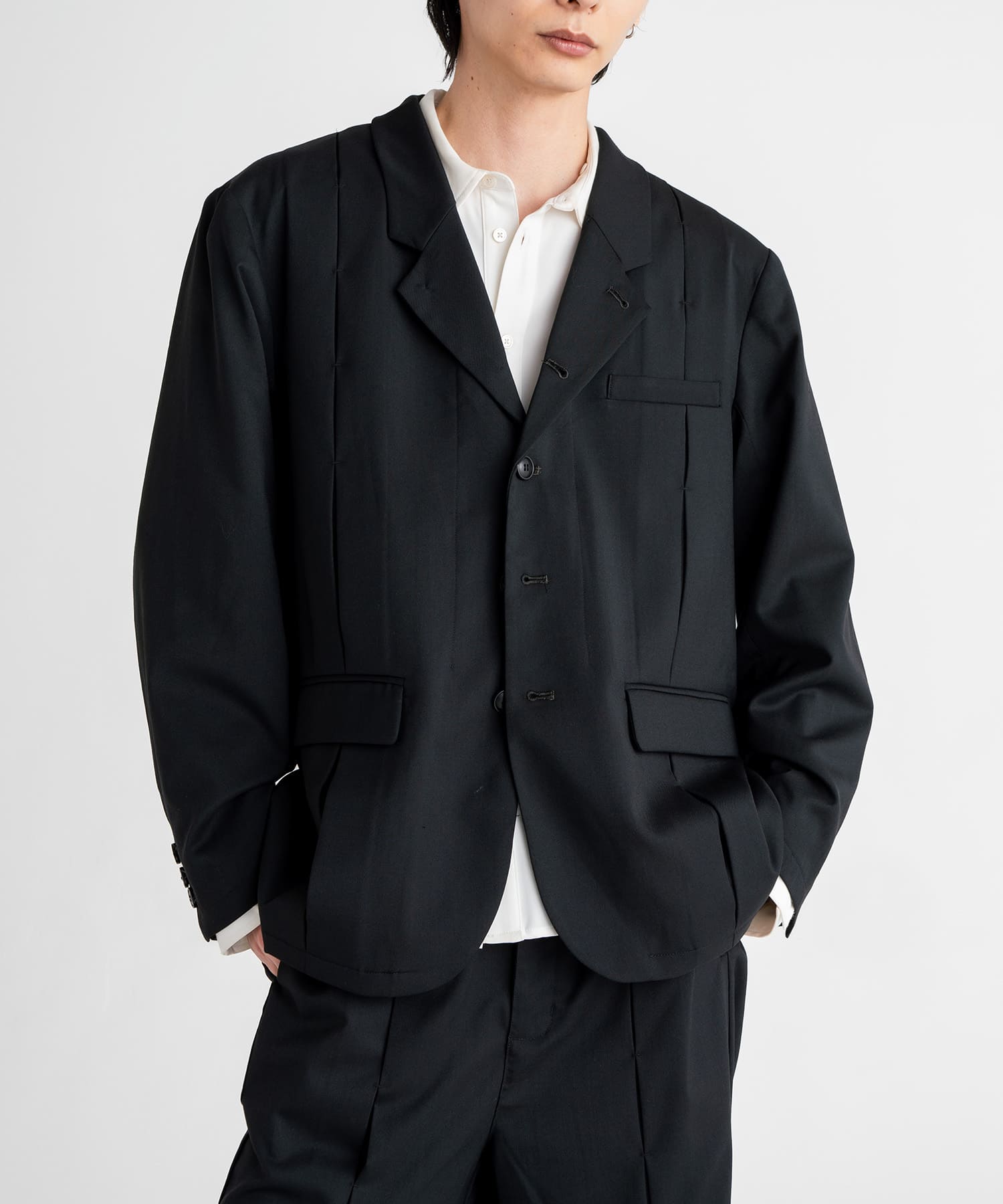 ポリエステル×ウールの上質な生地を使用したバータックデザインジャケット。