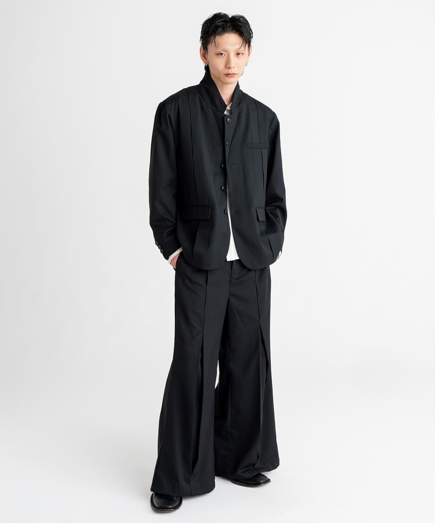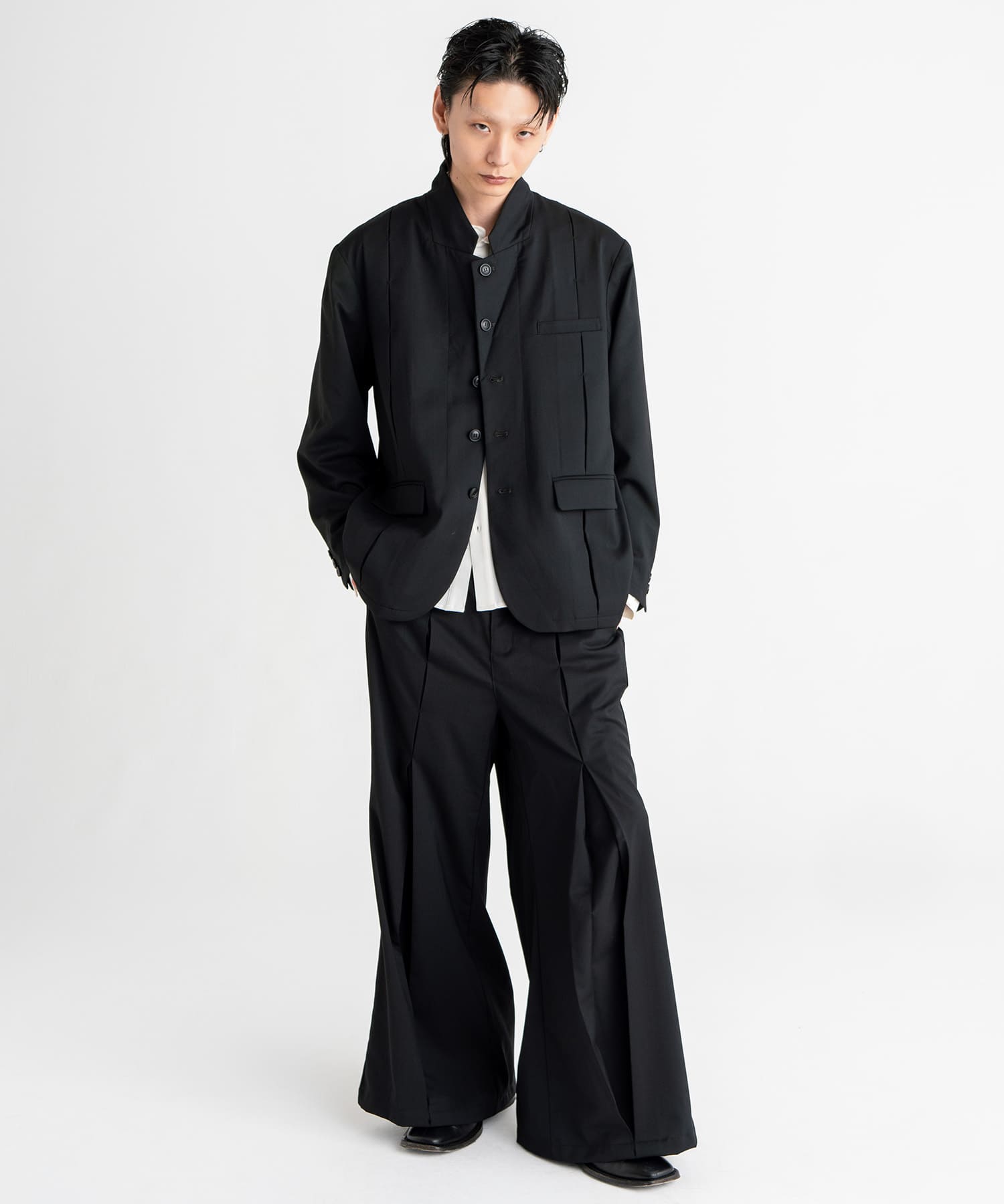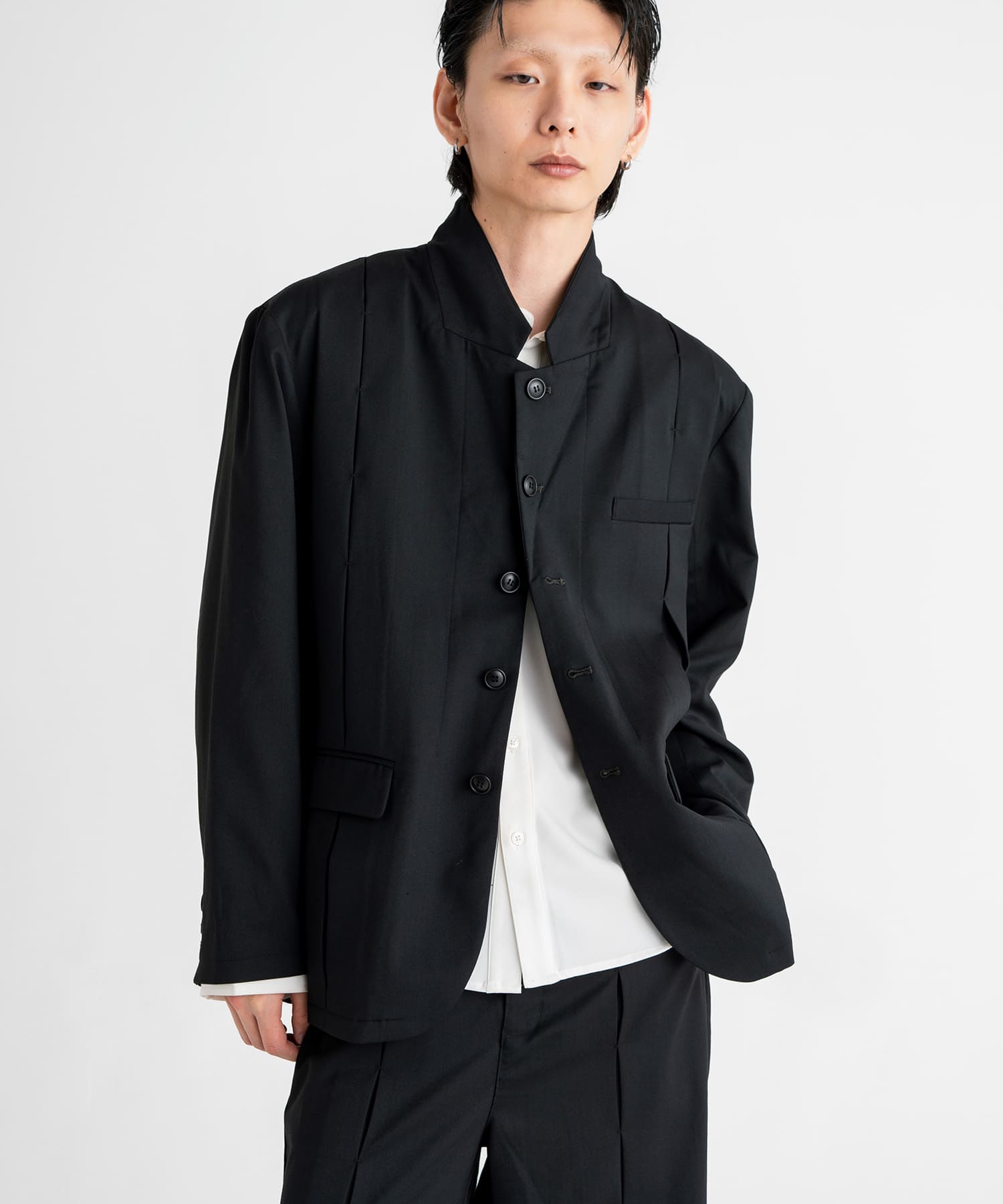 The large tucks in the center of the front and back are fastened with bartacking clasps, and the silhouette changes with the wearer's movements.