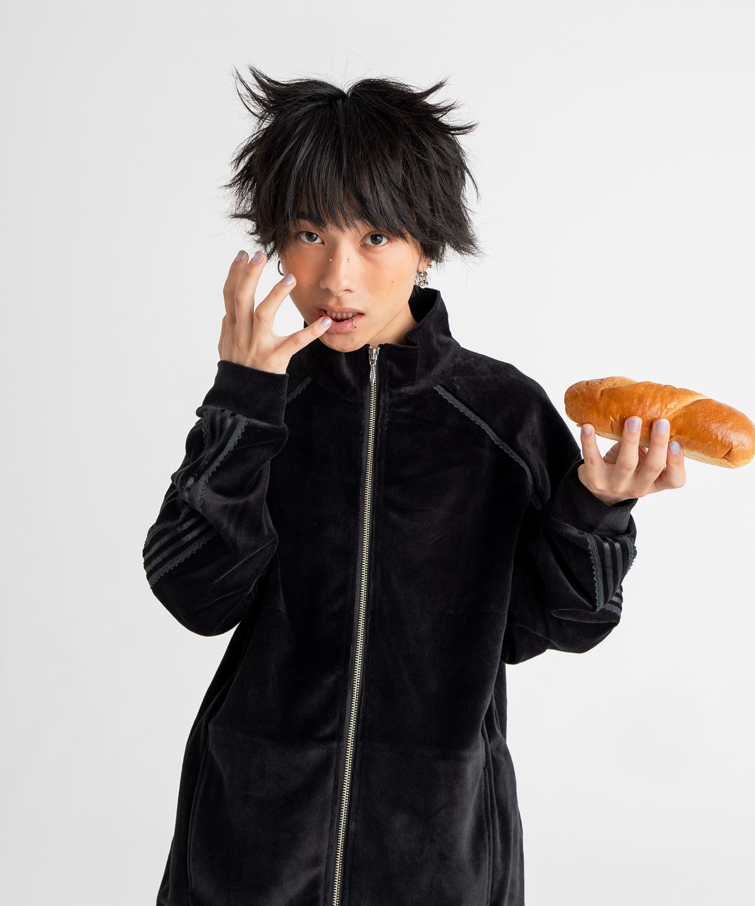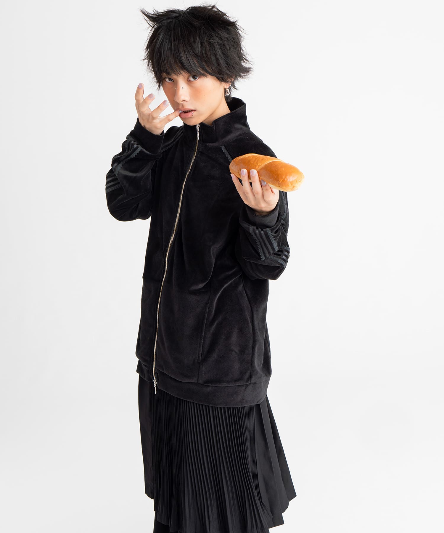 シーズンコンセプトのスクールテイストをなぞり、学生の体育のジャージをイメージして製作したこのアイテムはシックな印象のベロアをあえてスポーツスタイルに落とし込みモードに仕上げました。